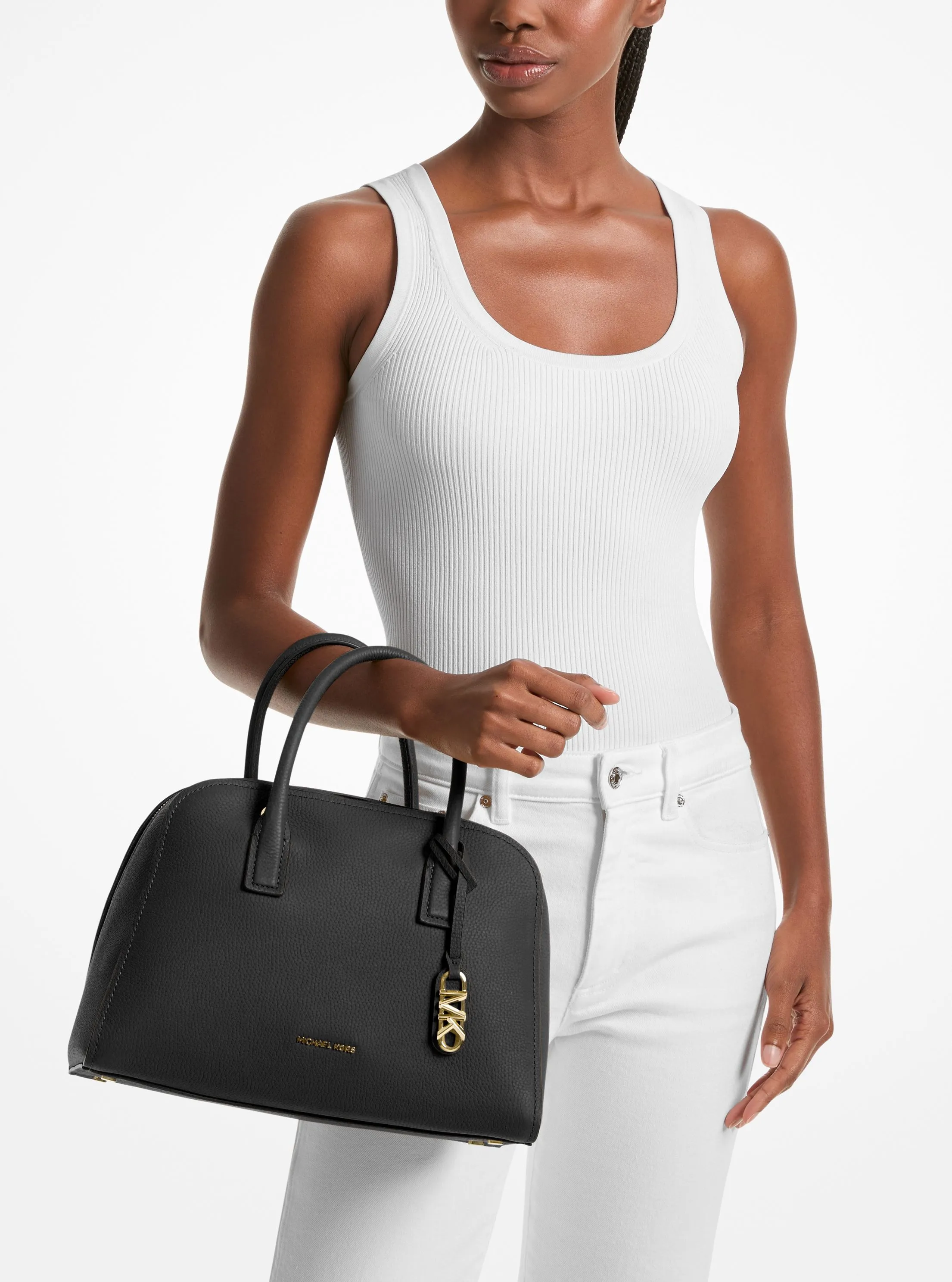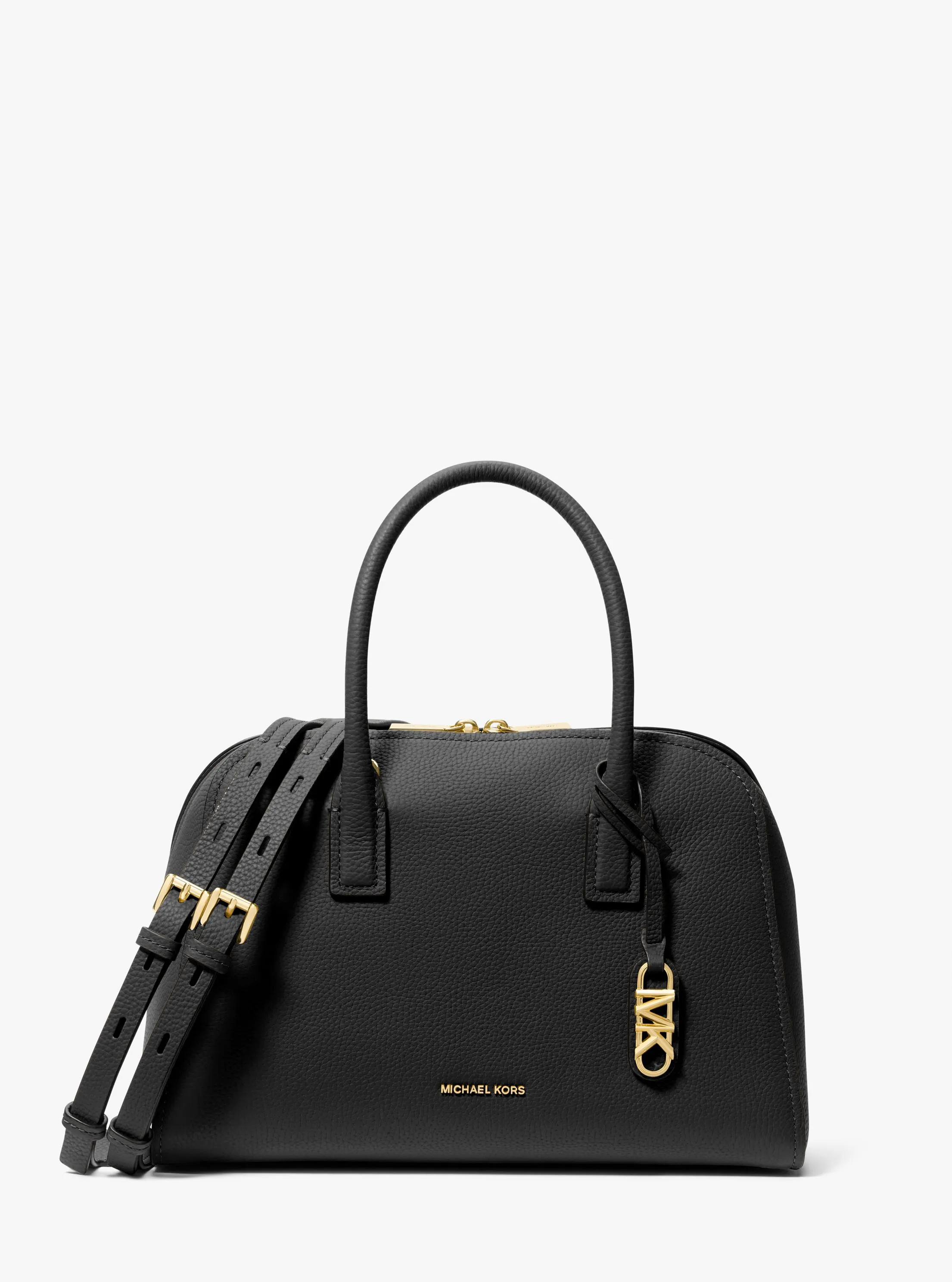 此款 Ashton 中号皮质手提包,选用经典黑色材质打造包身,包型简约,直率干练。在经典包型的基础上加入圆角处理,流线型外观搭配结构感顶部手柄和可调节长肩带,让您随心切换携带方式。包面设有小巧 MICHAEL KORS Logo金属件点缀,细节处彰显品牌质感。内部空间充裕,可以妥善收纳您的随身物品。MK Logo 金属件挂饰增添品牌质感。不妨搭配本季新款连衣裙,打造优雅干练通勤造型。
