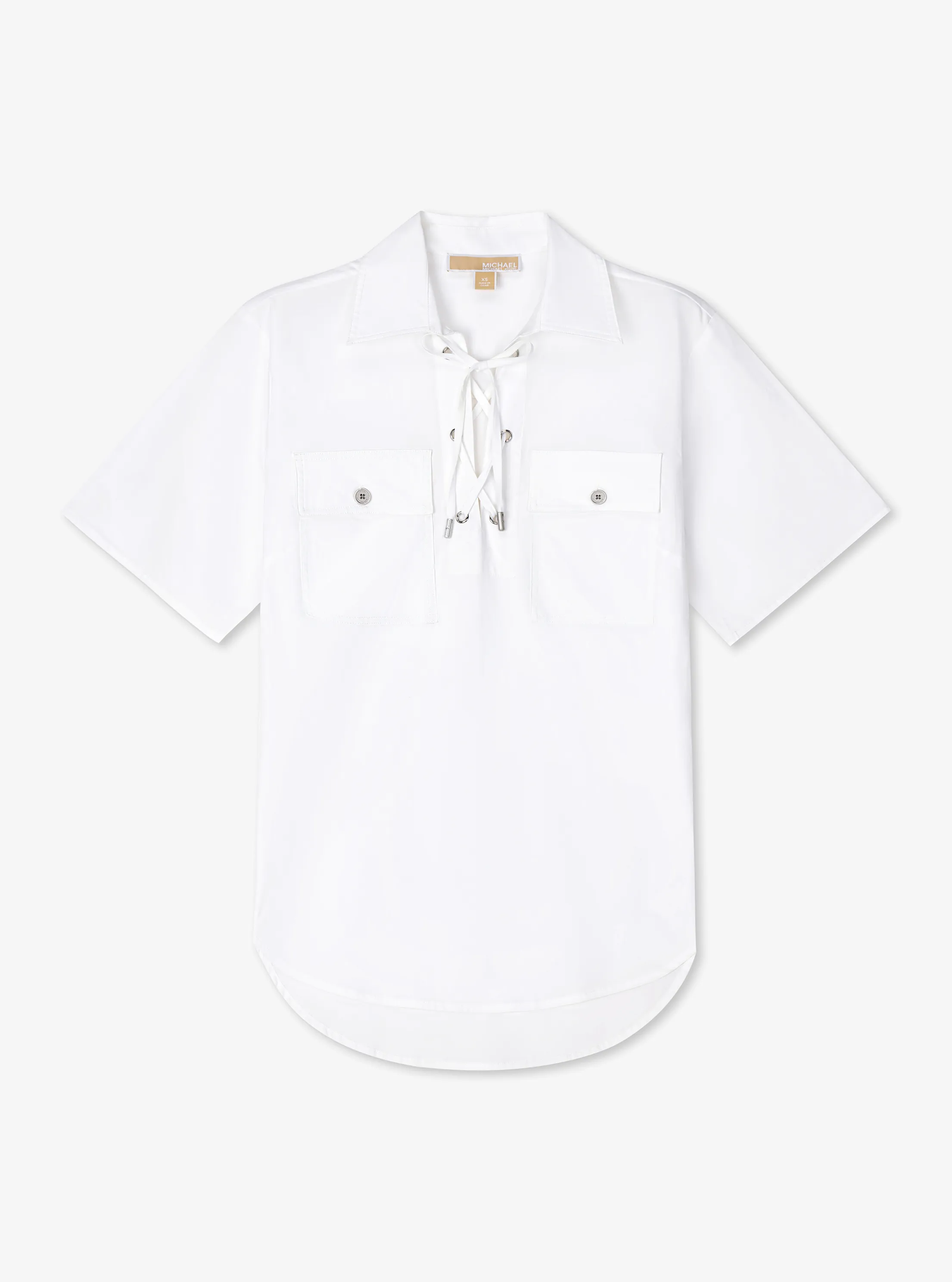 此款女士翻领系带短袖衬衫,采用经典白色面料打造短袖造型,领口系带设计,恰到好处地为此款单品增添酷飒气息。设有两个翻盖贴袋装饰,无论是作为内搭或是单独穿着,都可展现时尚魅力。不妨搭配本季新款喇叭长裤和手袋,打造日常优雅通勤新造型。