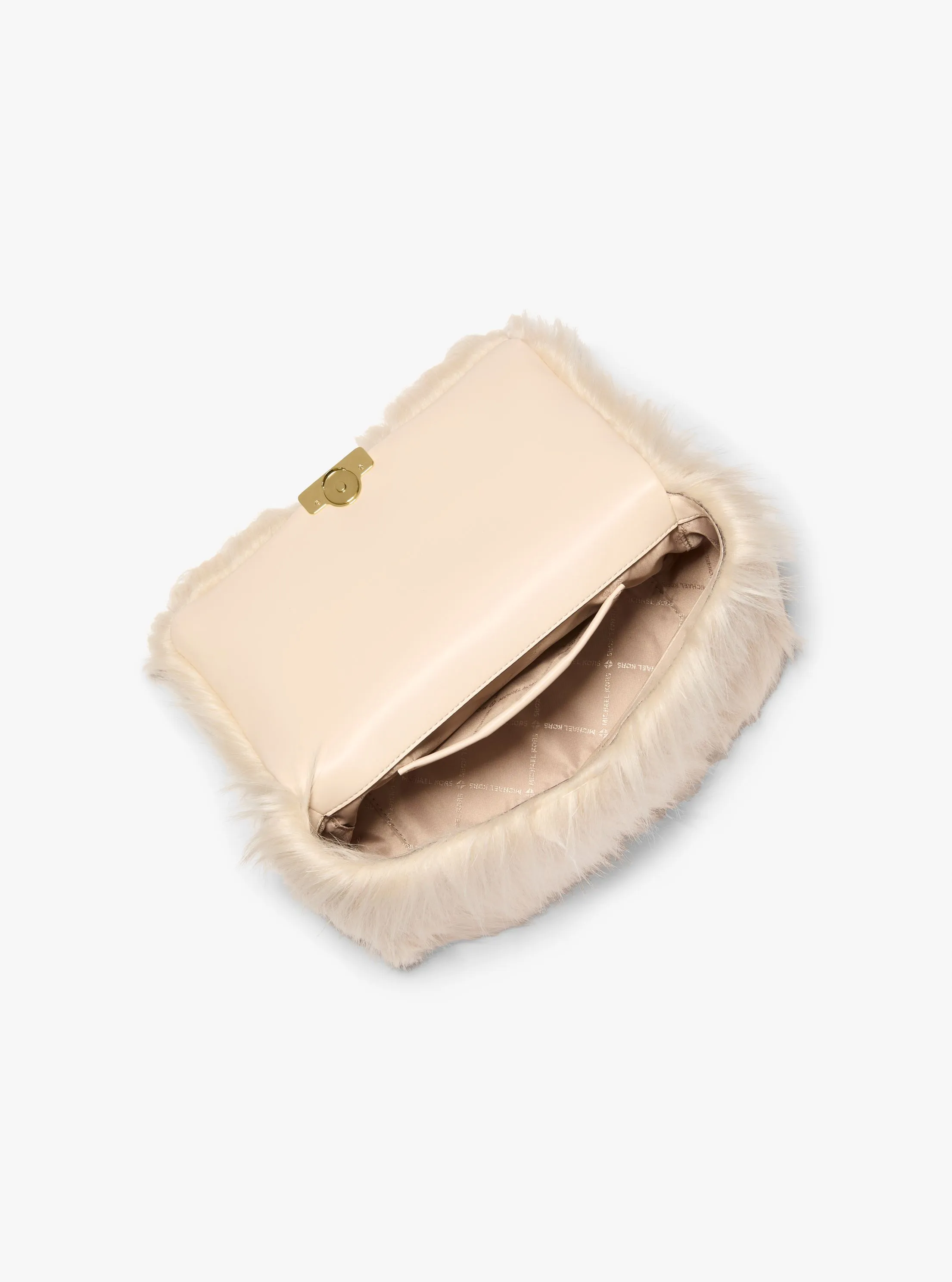 此款 Tribeca 大号单肩包,选用米色毛绒材质打造具有温暖触感的手袋,营造满满冬日氛围感。链条拼接肩带,增添潮流气息。翻盖设计,内部空间充裕,展现大气之美。不妨搭配本季新款秋冬服饰,打造亮眼派对造型。