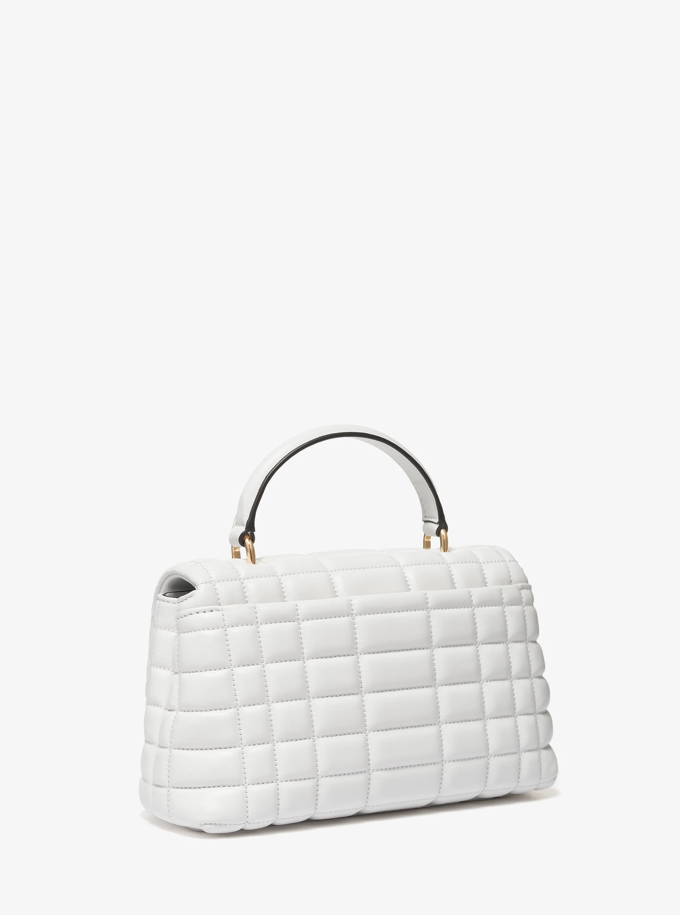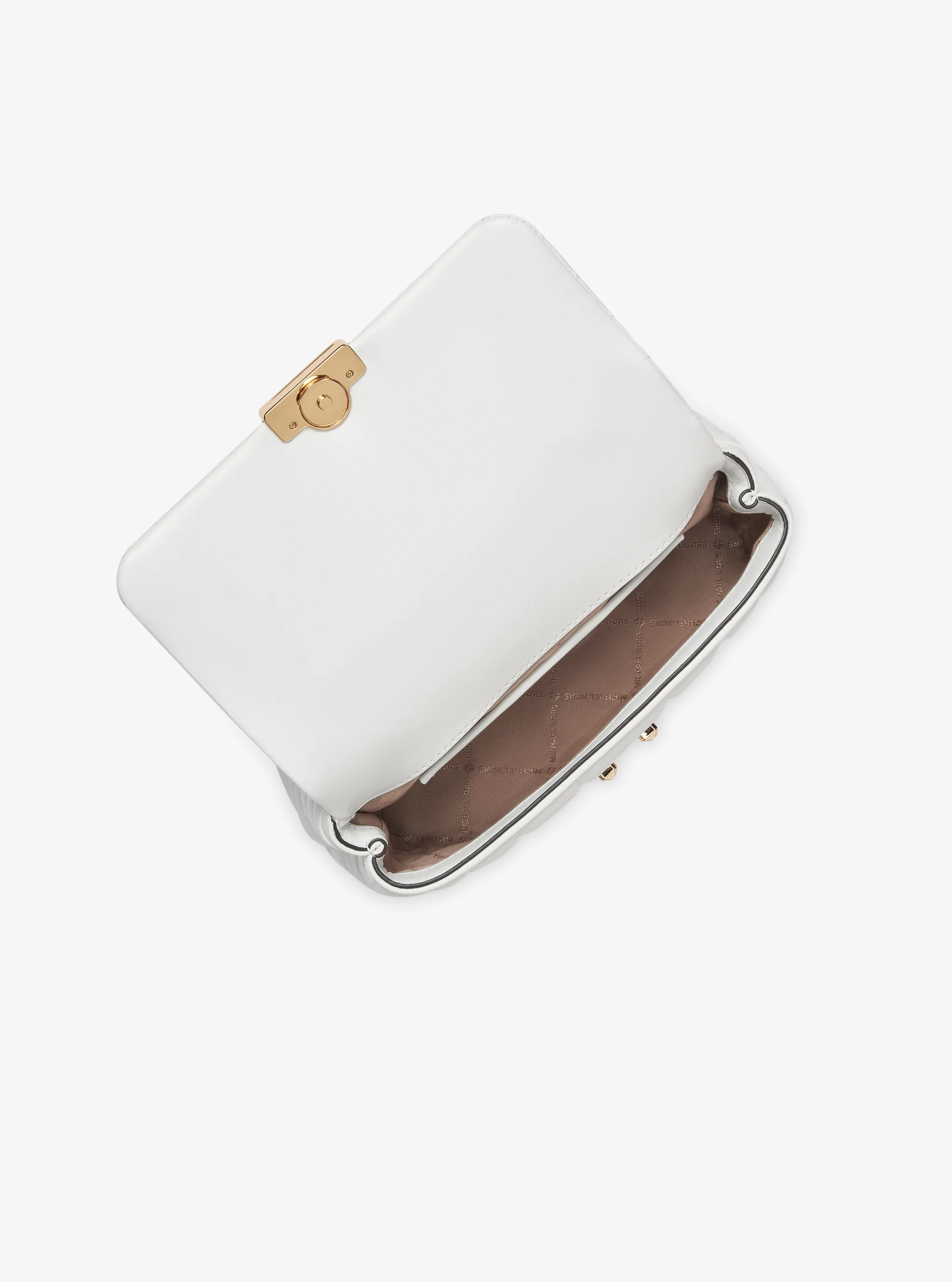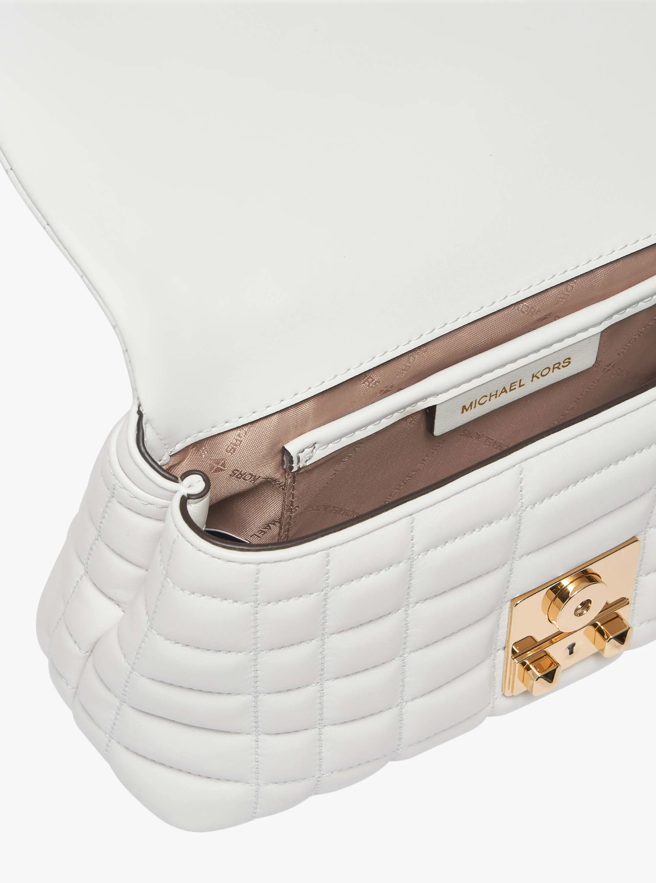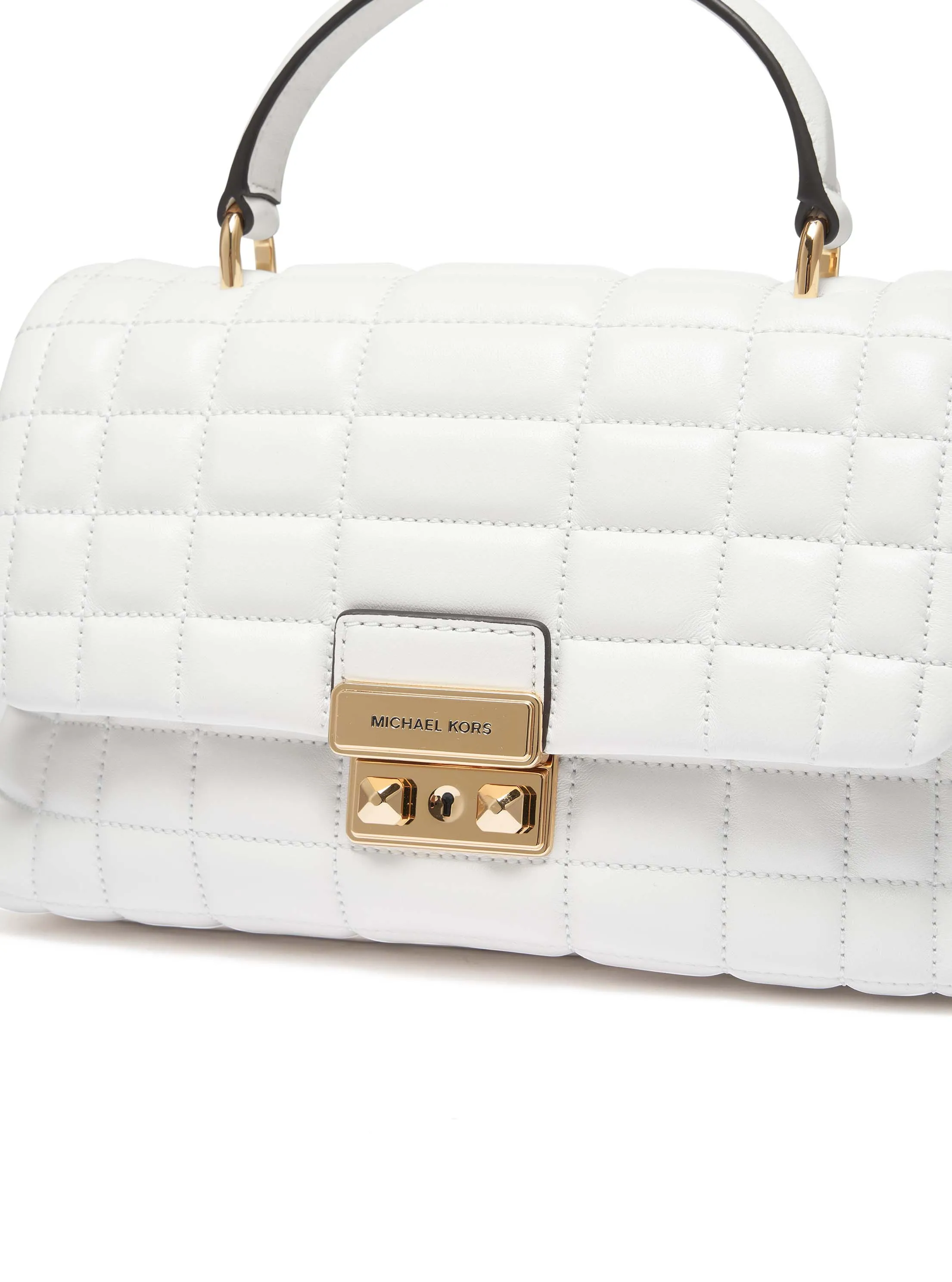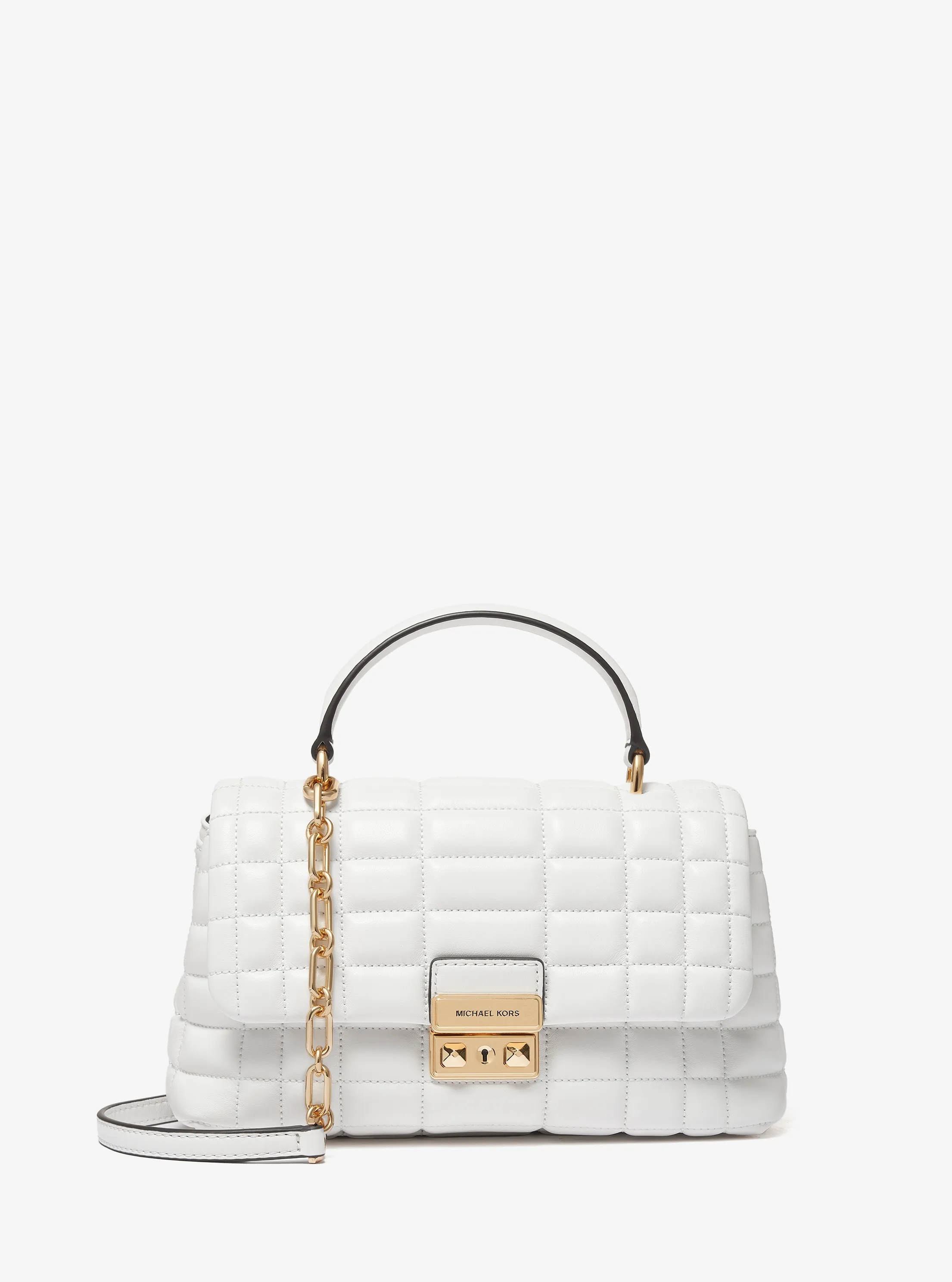 此款 Tribeca 中号手提包,采用经典黑色材质打造。包身延续经典绗缝工艺,演绎几何美感。细腻柔软的材质透出饱满亮泽的视觉效果,线条彰显不俗设计感。搭配设有手提柄和可调节长肩带,便于随心切换携带方式。翻盖设计,内部空间充裕,可以轻松容纳您的手机、钥匙等日常随身物品。不妨搭配本季新款连衣裙和单鞋,打造优雅通勤造型。
