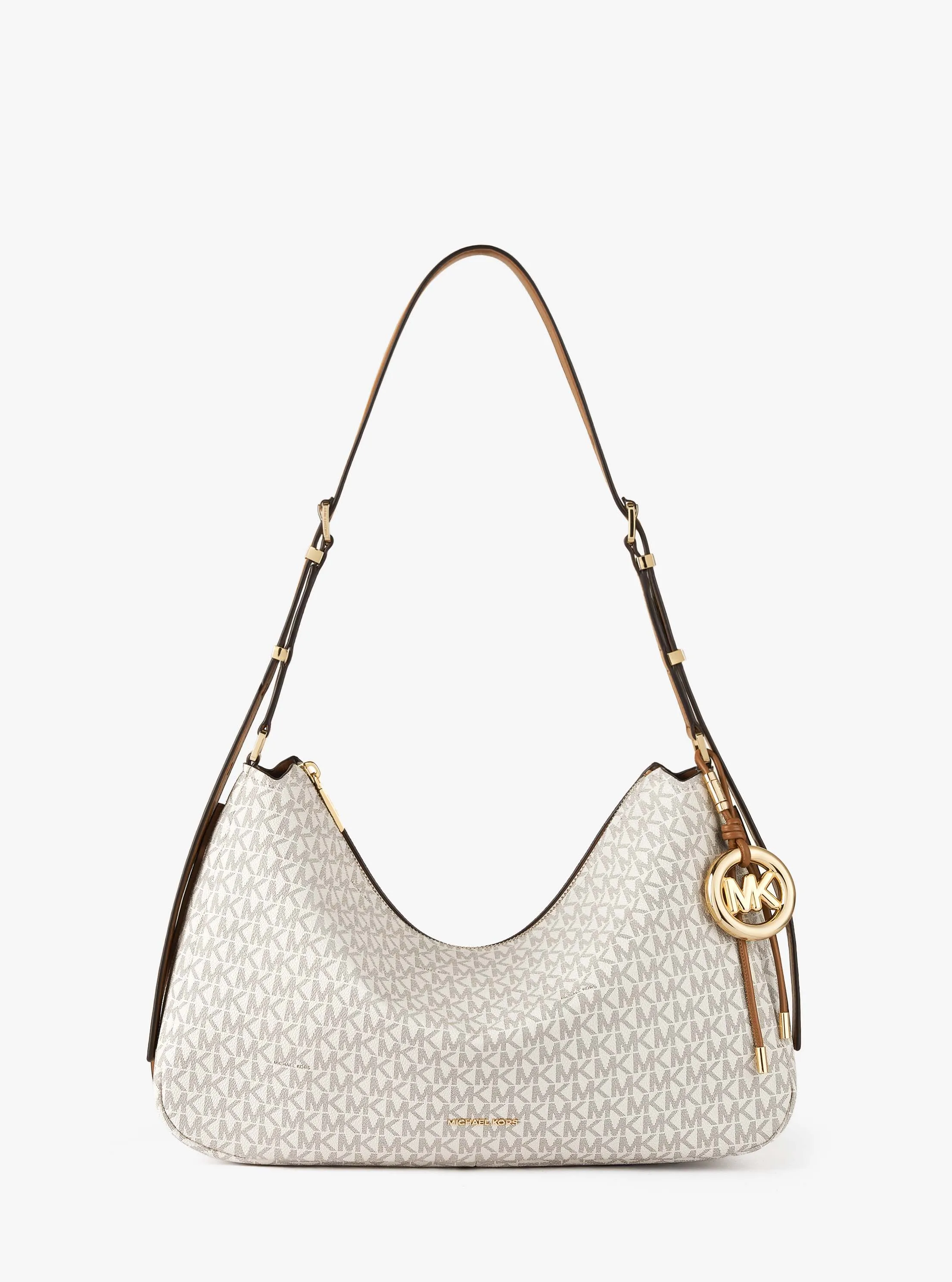 此款 Nolita 中号老花单肩包,采用香草白色品牌标志性 Logo 印花材质打造时下流行的慵懒随性造型,复古而不失潮流感,拉链开合,集便利与实用为一体。包身上缀低调 MICHAEL KORS Logo 金属件,设有圆形 MK 挂饰,细节处彰显品牌质感。不妨搭配本季新款连衣裙,打造优雅通勤造型。