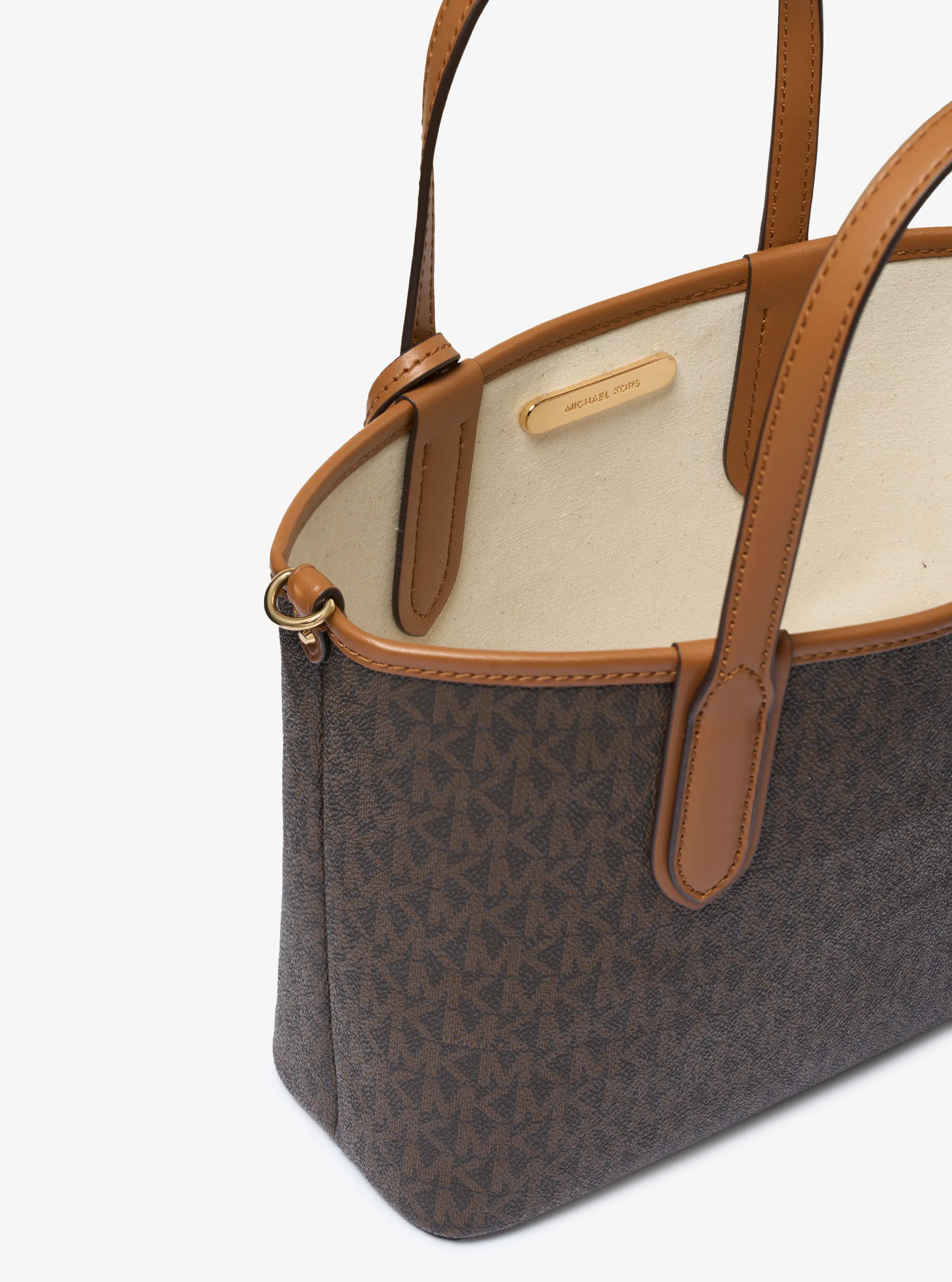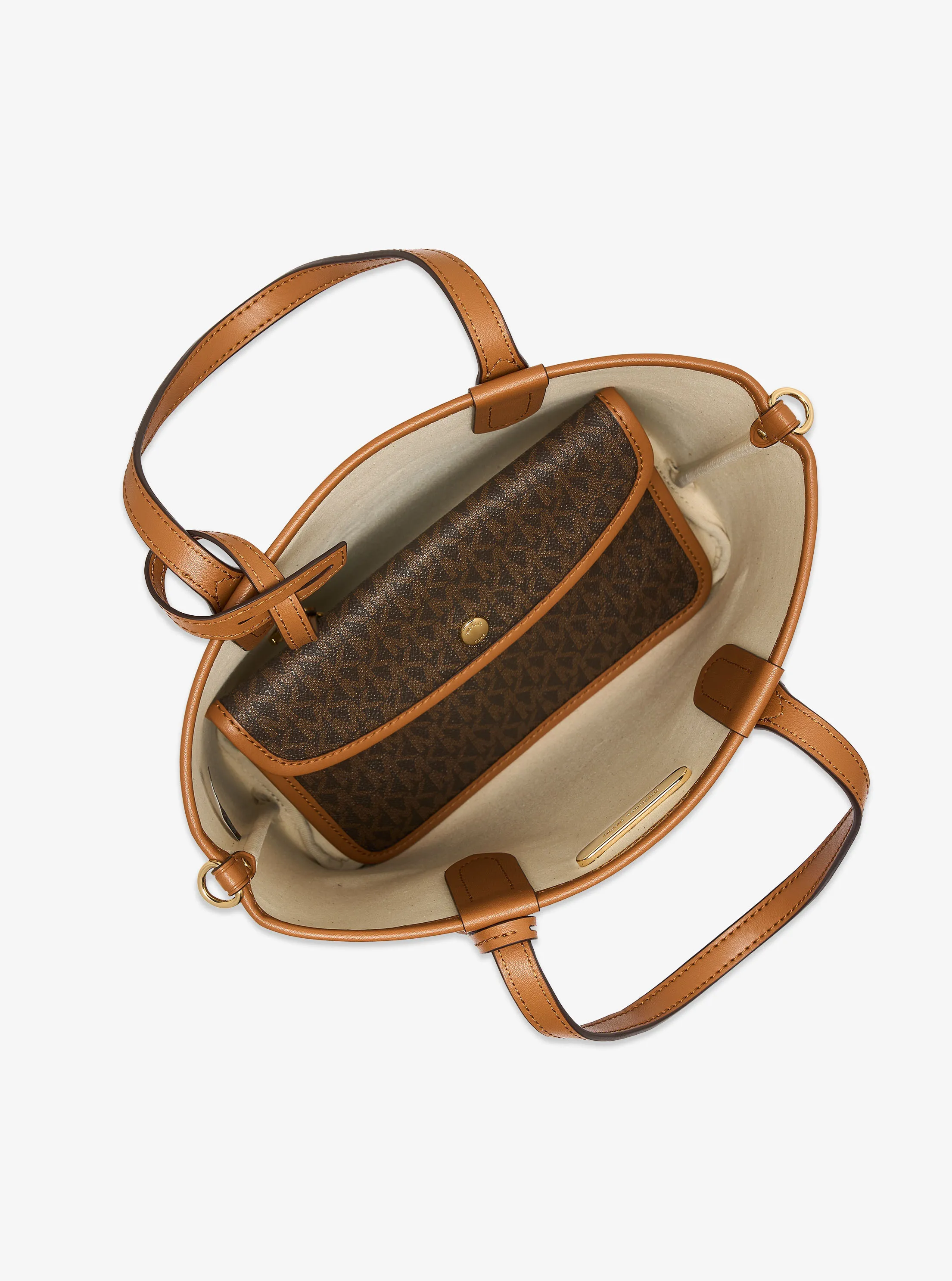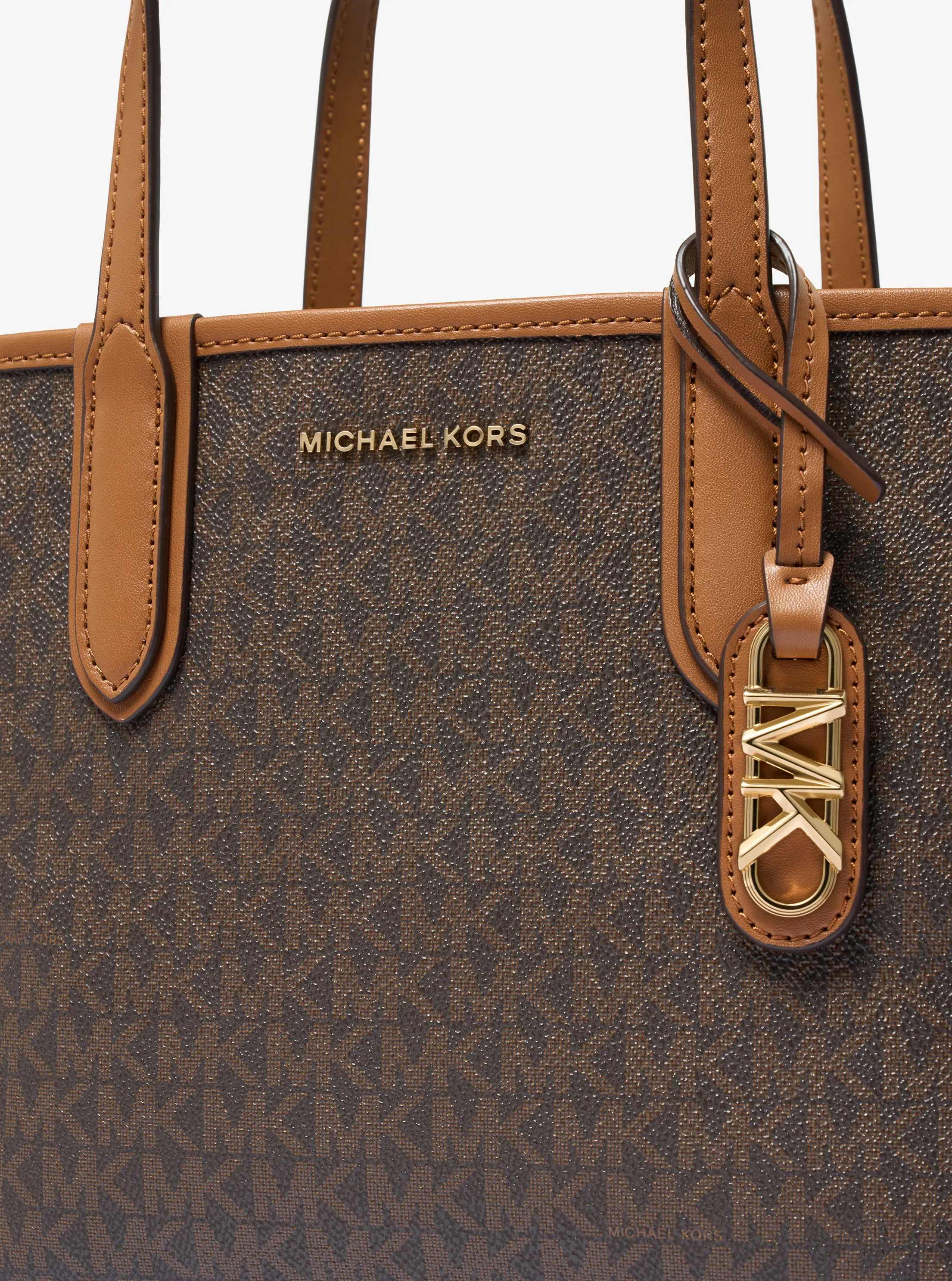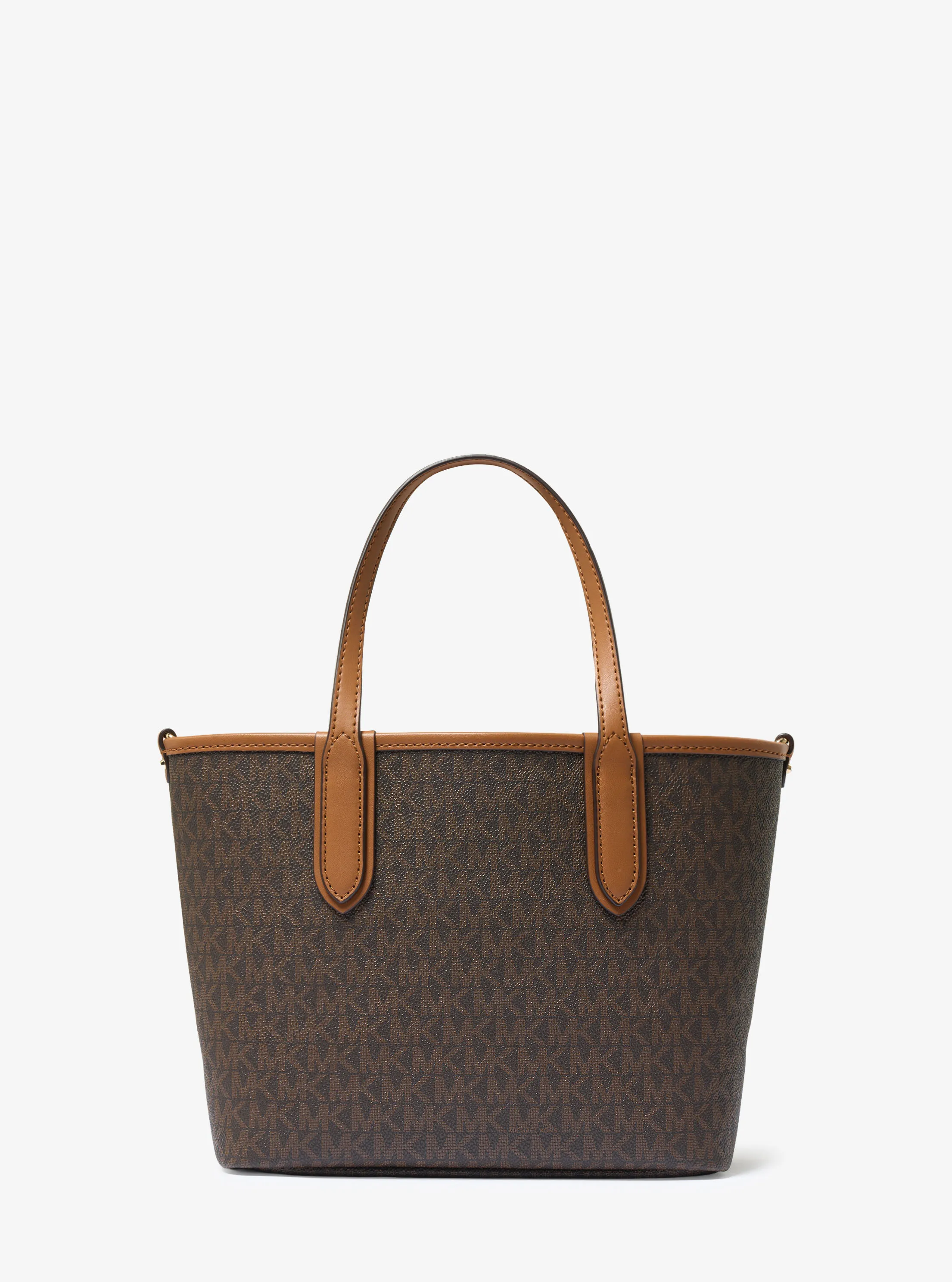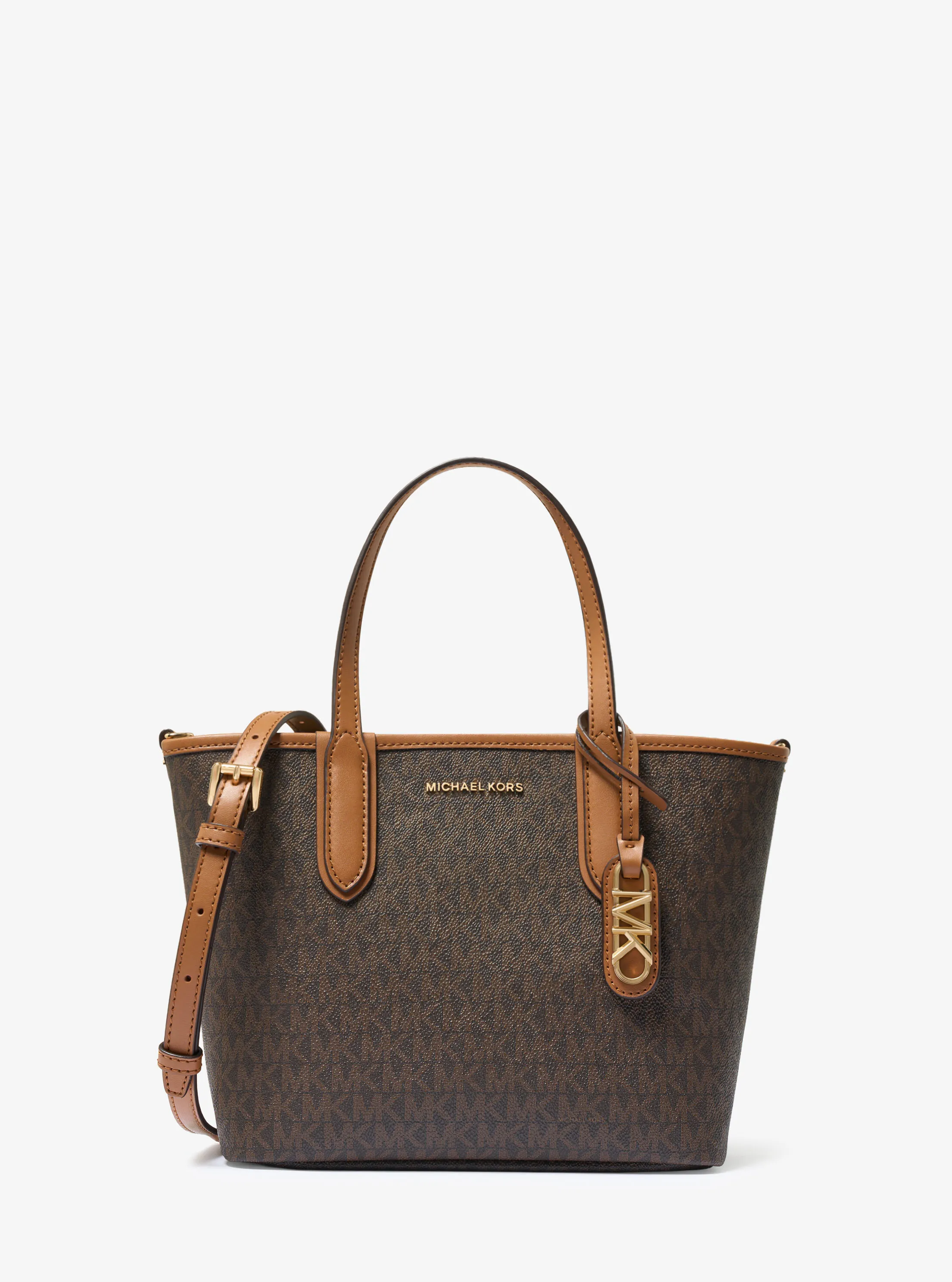 此款 Eliza 超小号老花托特包,采用深棕色品牌标志性 Logo 印花材质设计,大方简约的外形,整体协调而不失品牌质感。搭配 MK Logo 圆形金属件挂饰点缀,细节处彰显摩登时尚感。设有手提柄和可调节长肩带,随心切换携带方式,增添单品实用性。实用的托特包大空间设计,可收纳手机、化妆品和钥匙等随身物品。不妨带上它,魅力出行。