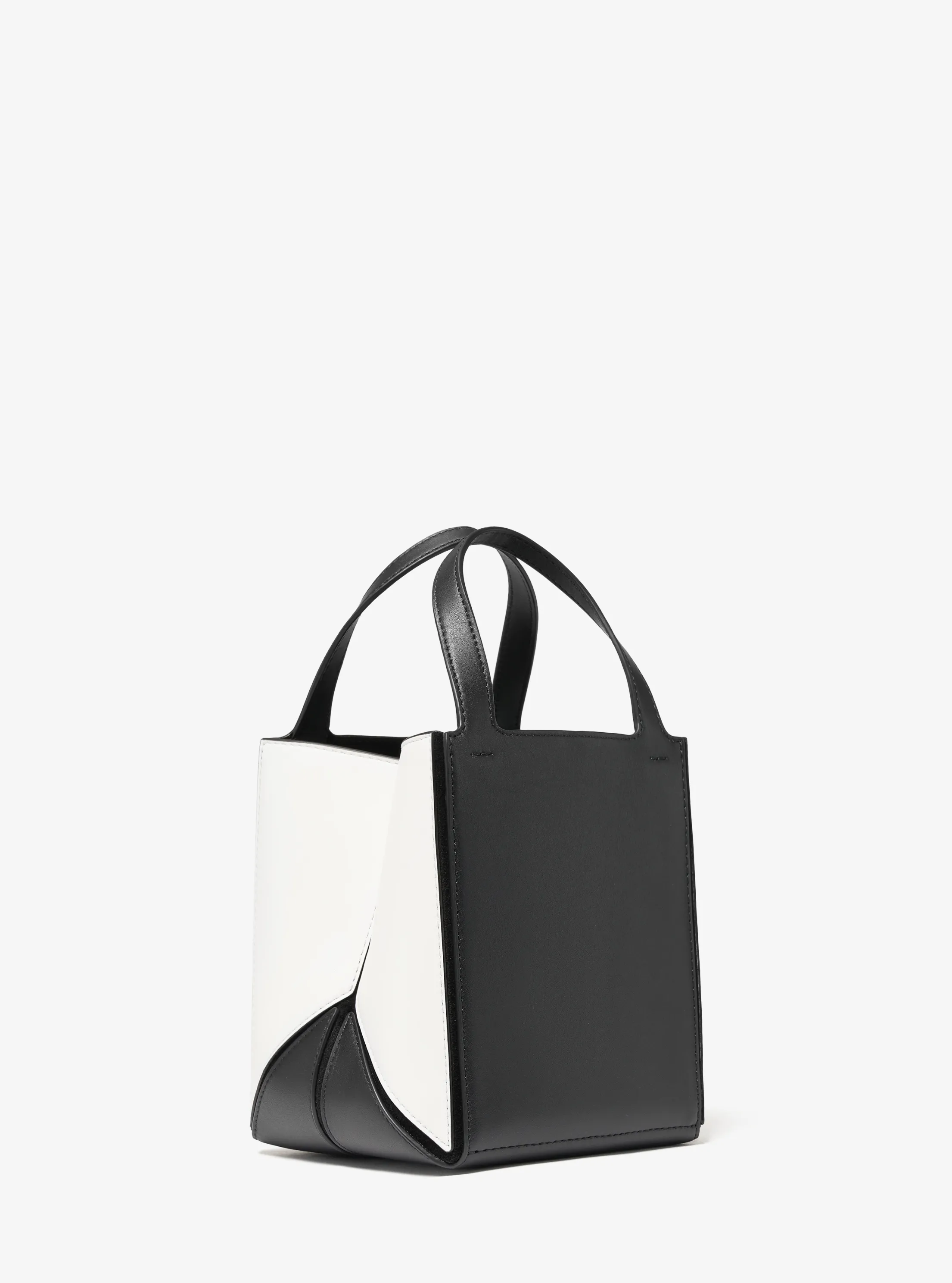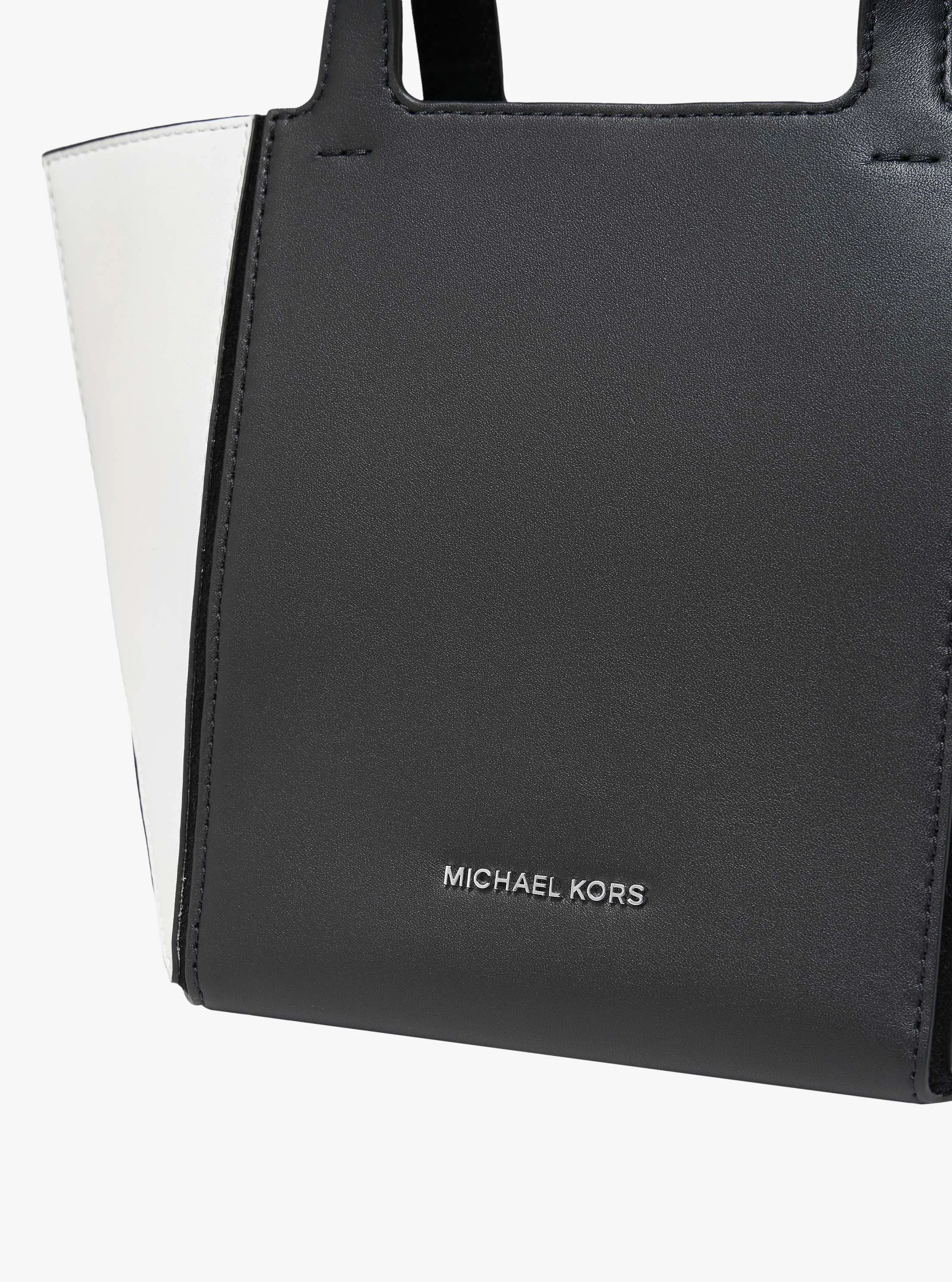 此款 Jordi 小号皮质托特包,包身采用黑色和白色材质拼接打造大方简约的外形,打破沉闷的同时,而又不失个性风范。包面上缀银色 MICHAEL KORS Logo 装饰,细节处彰显品牌质感。设有手提柄,方便手提使用。实用的大空间设计,可以轻松收纳您的随身物品。不妨带上它,轻松通勤。