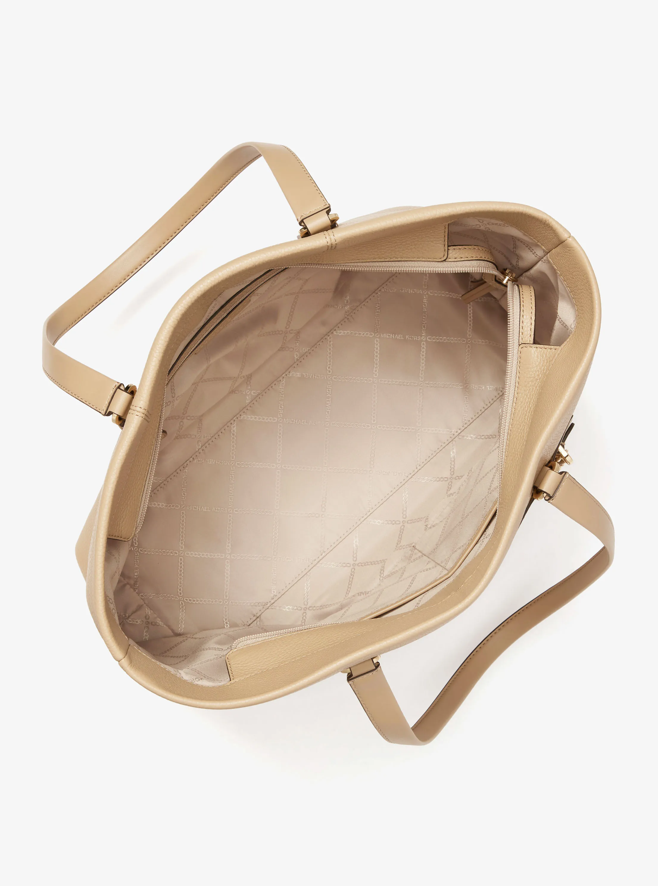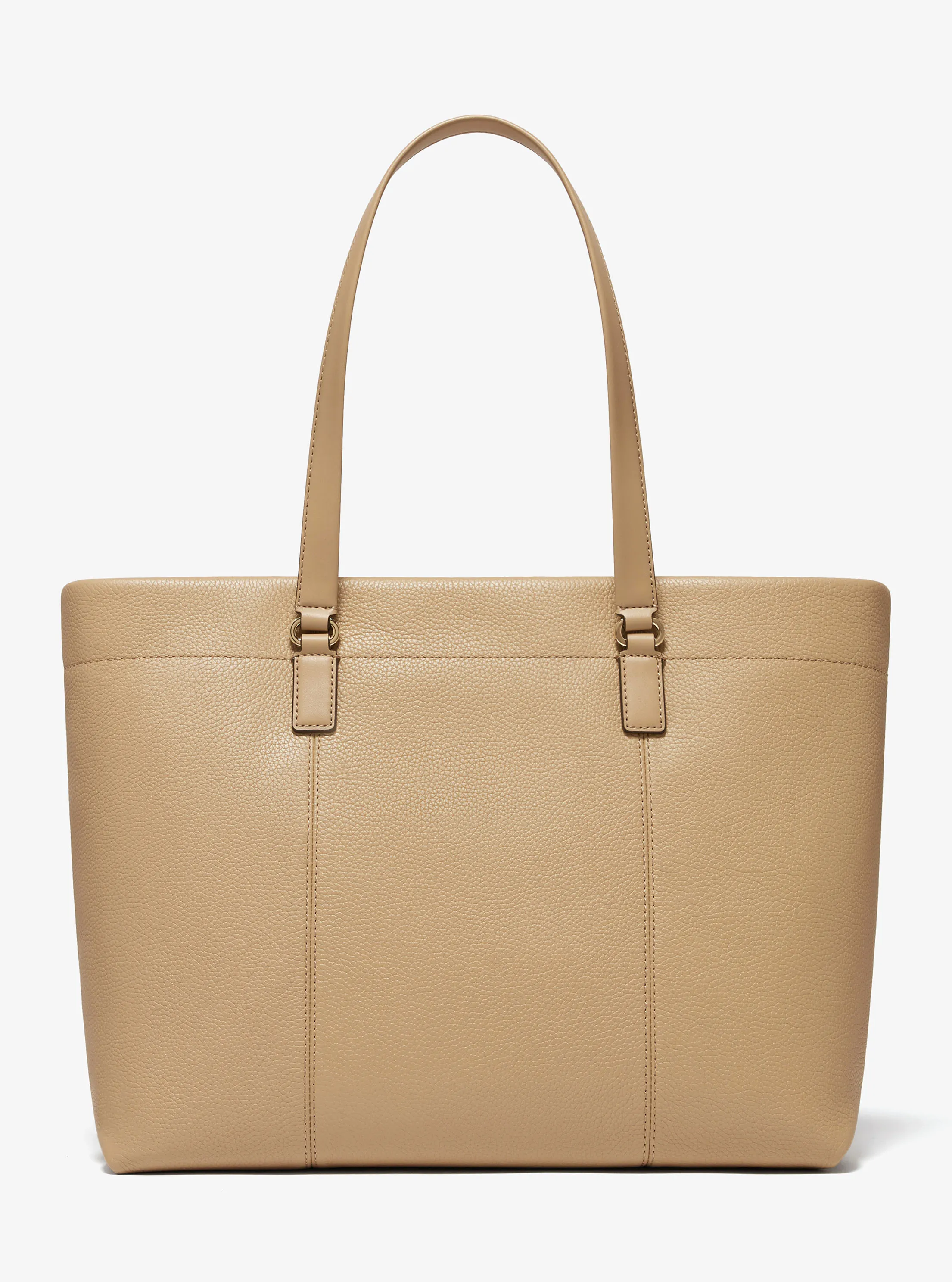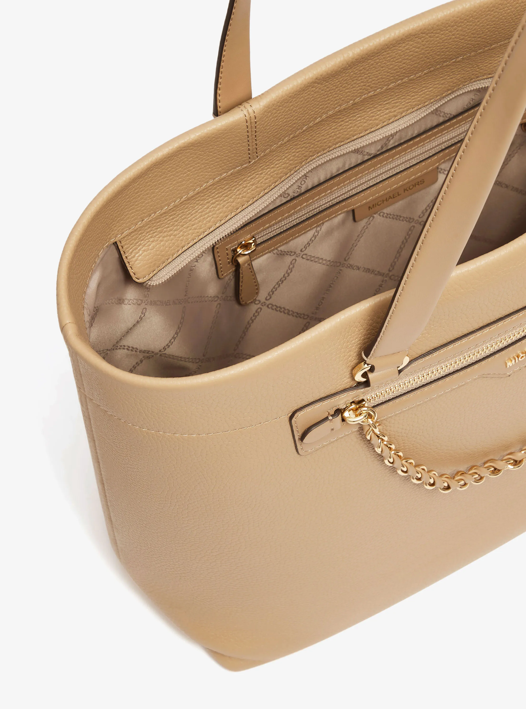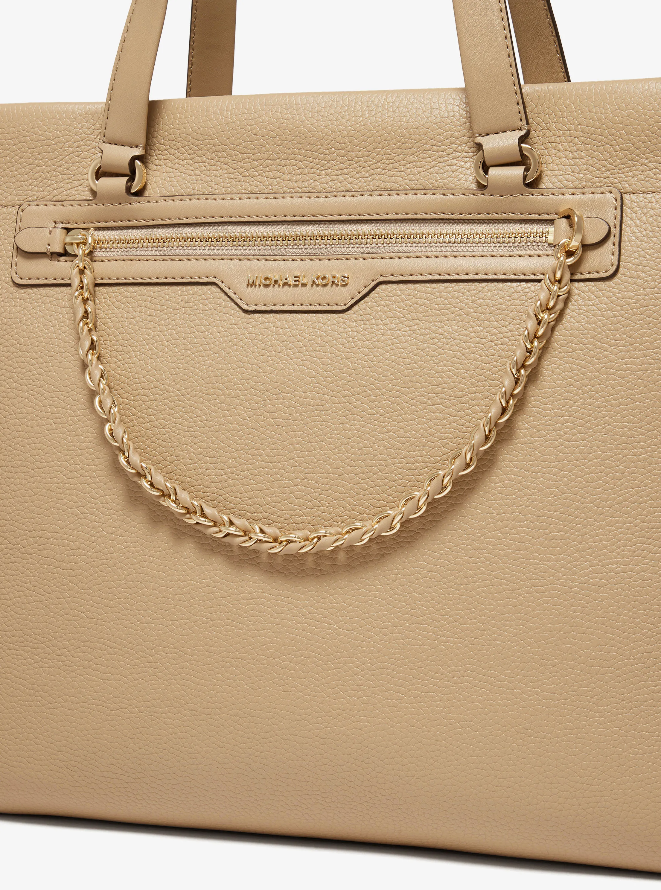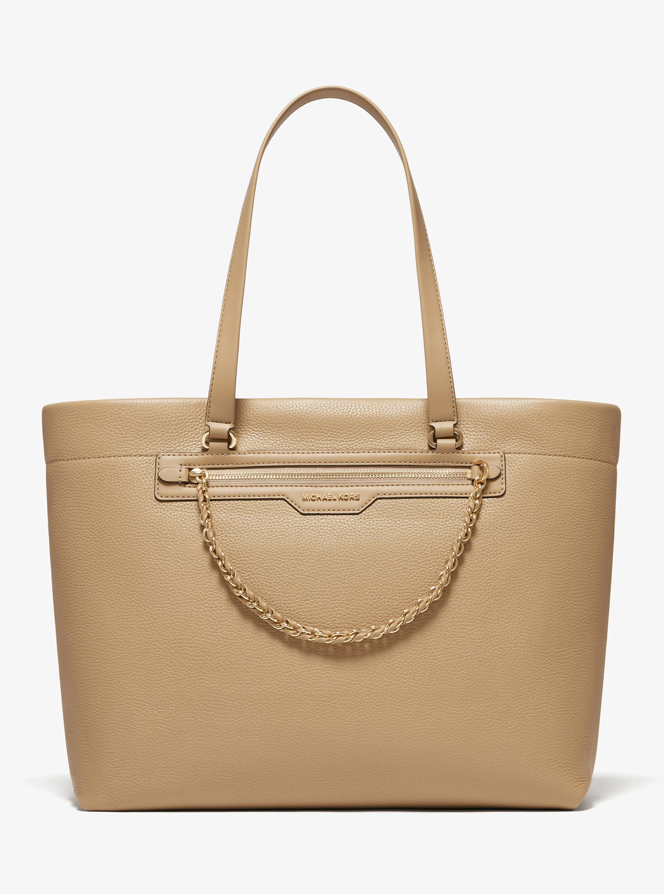 此款 Slater 大号皮质托特包,包身采用精美驼色材质打造,设有拉链贴袋,上缀金属链条装饰,细节处彰显品牌质感。设有手提柄,既可以手提,也可以肩背使用。实用的大空间设计,可以轻松收纳您的手机、钱包和文件等随身物品。不妨带上它,轻松通勤。