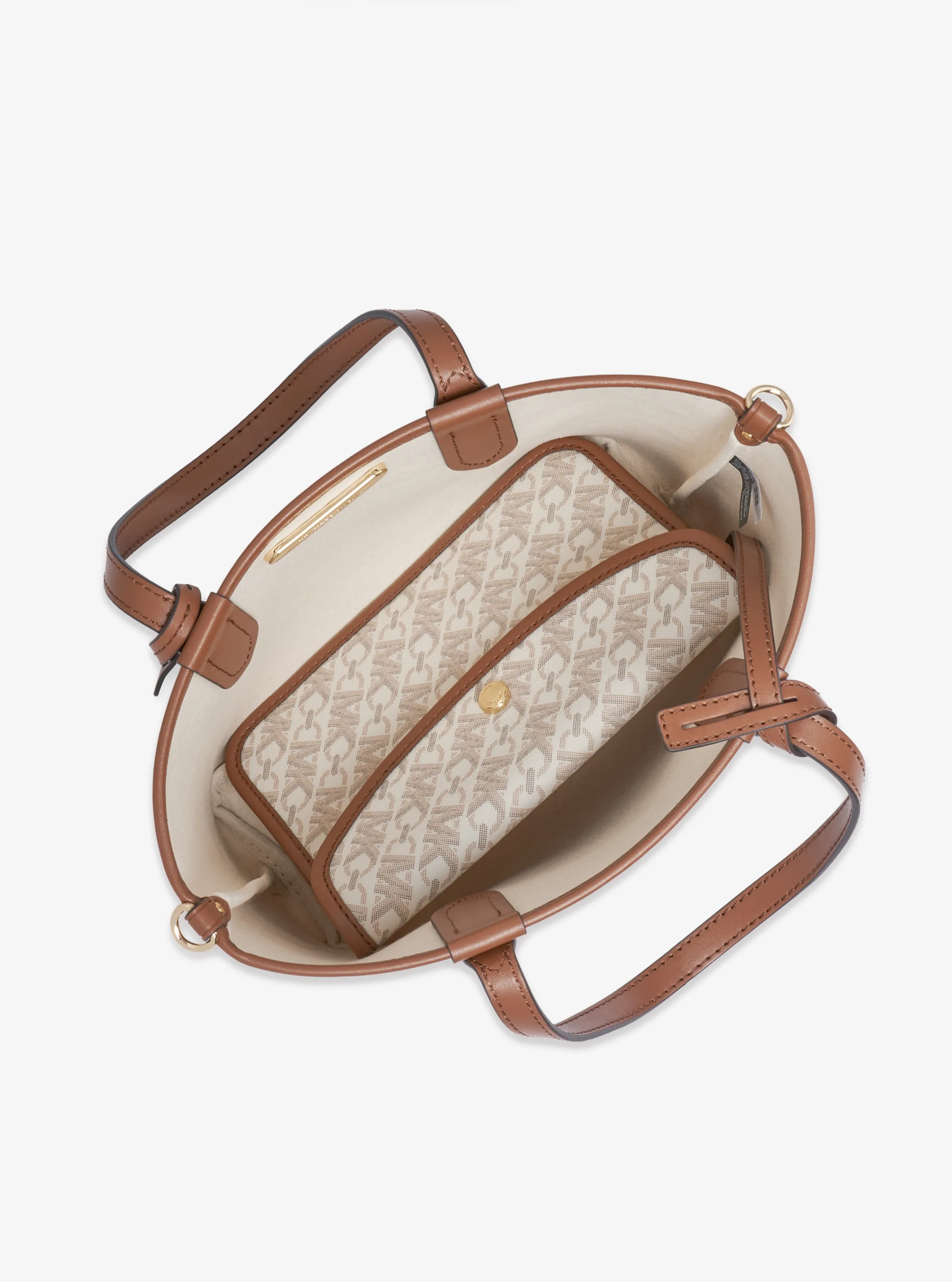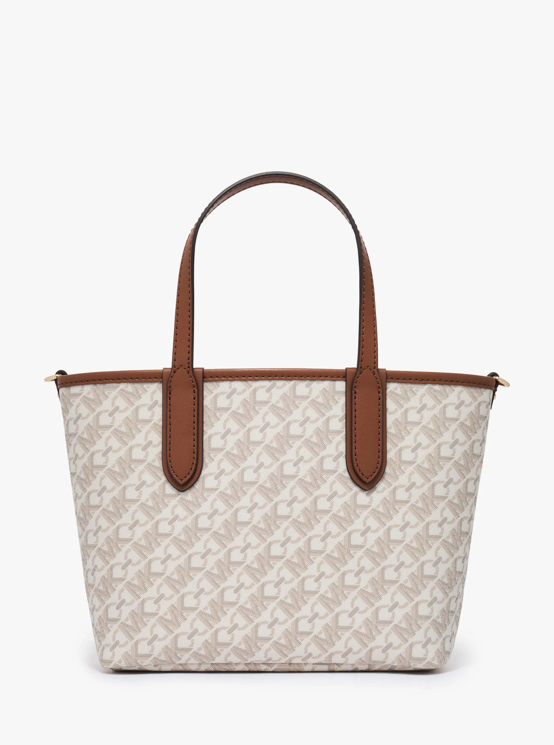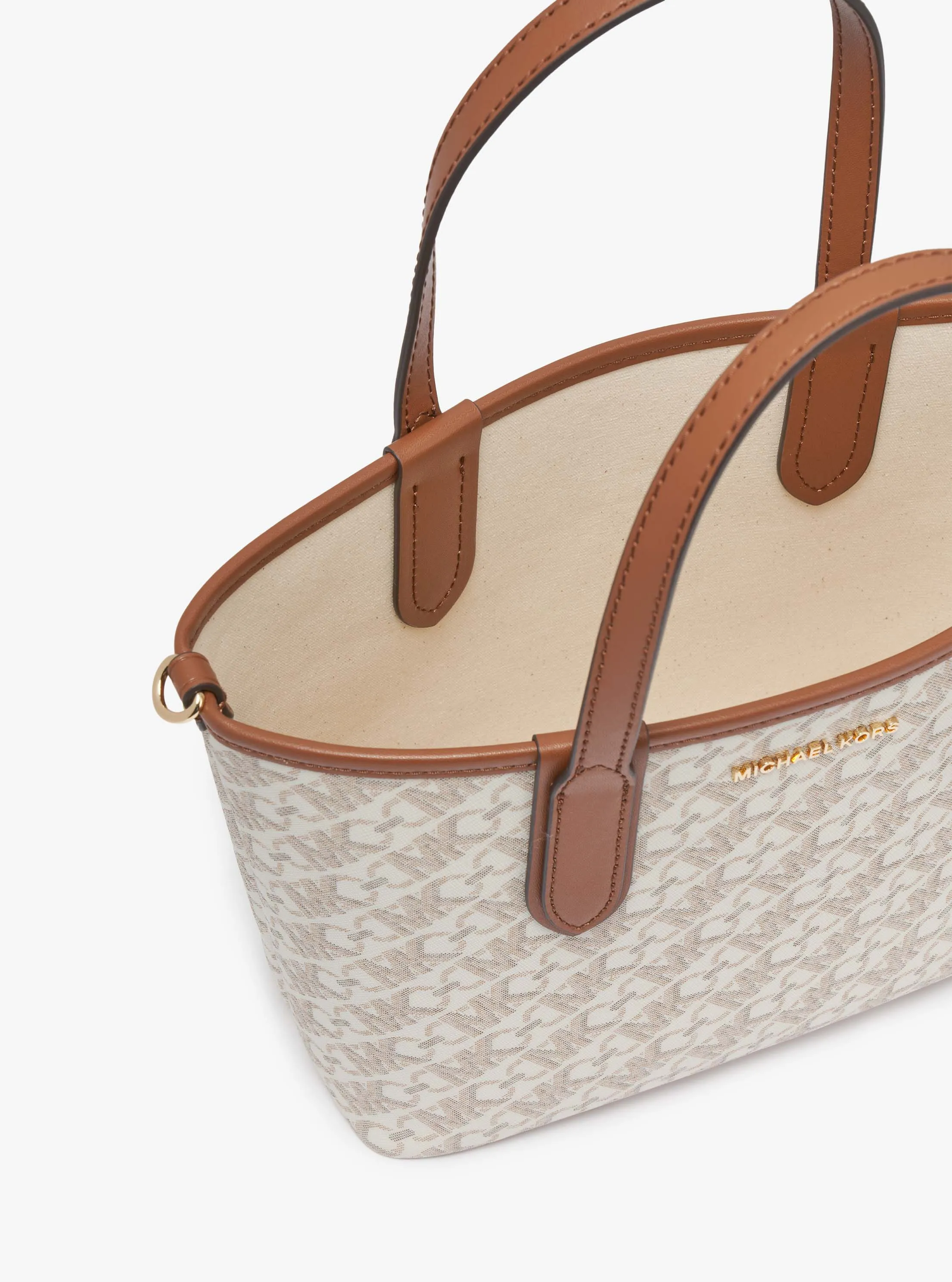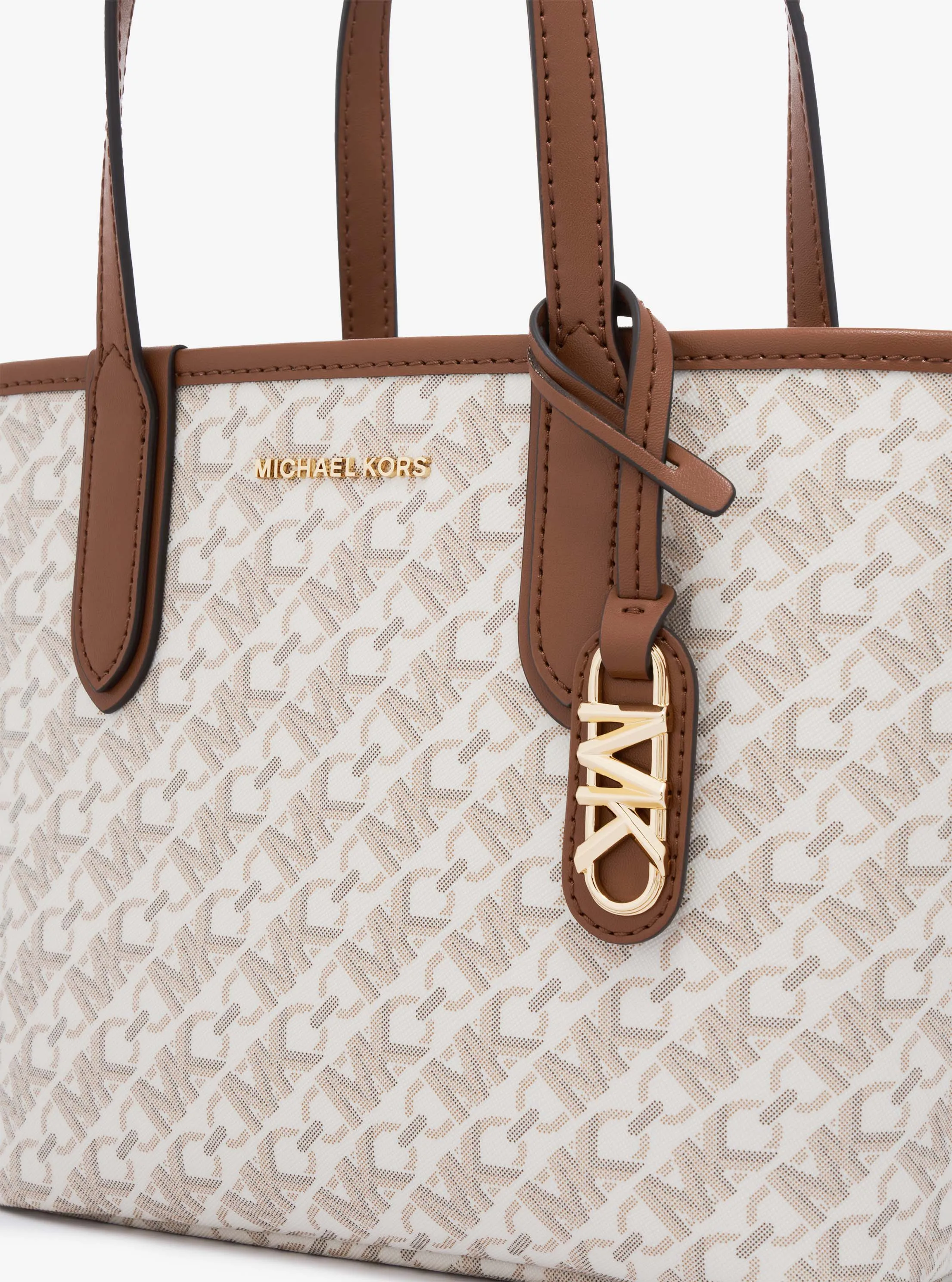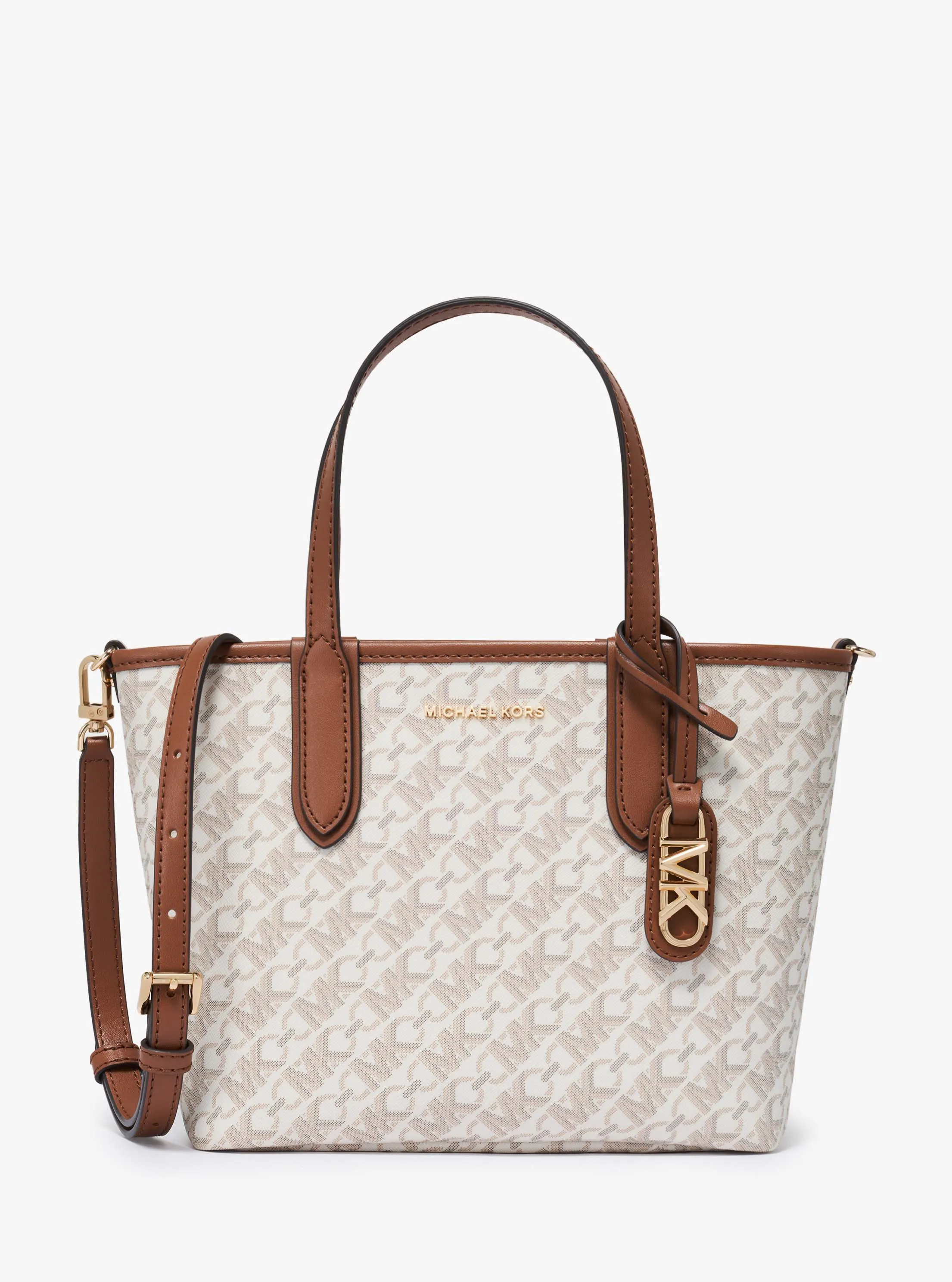 此款 Eliza 超小号老花托特包,包身采用香草白色品牌标志性 Logo 印花精制而成。搭配着金色 MK 金属挂饰,彰显时髦风范。精妙设计的内里可以轻松收纳您的卡夹、手机和唇彩,在容纳众多物品的同时为整体造型点睛。设有橡果棕色长手柄和可调节肩带,将之作为优雅的手提包或是斜挎使用,轻松出行,享受假日好时光。