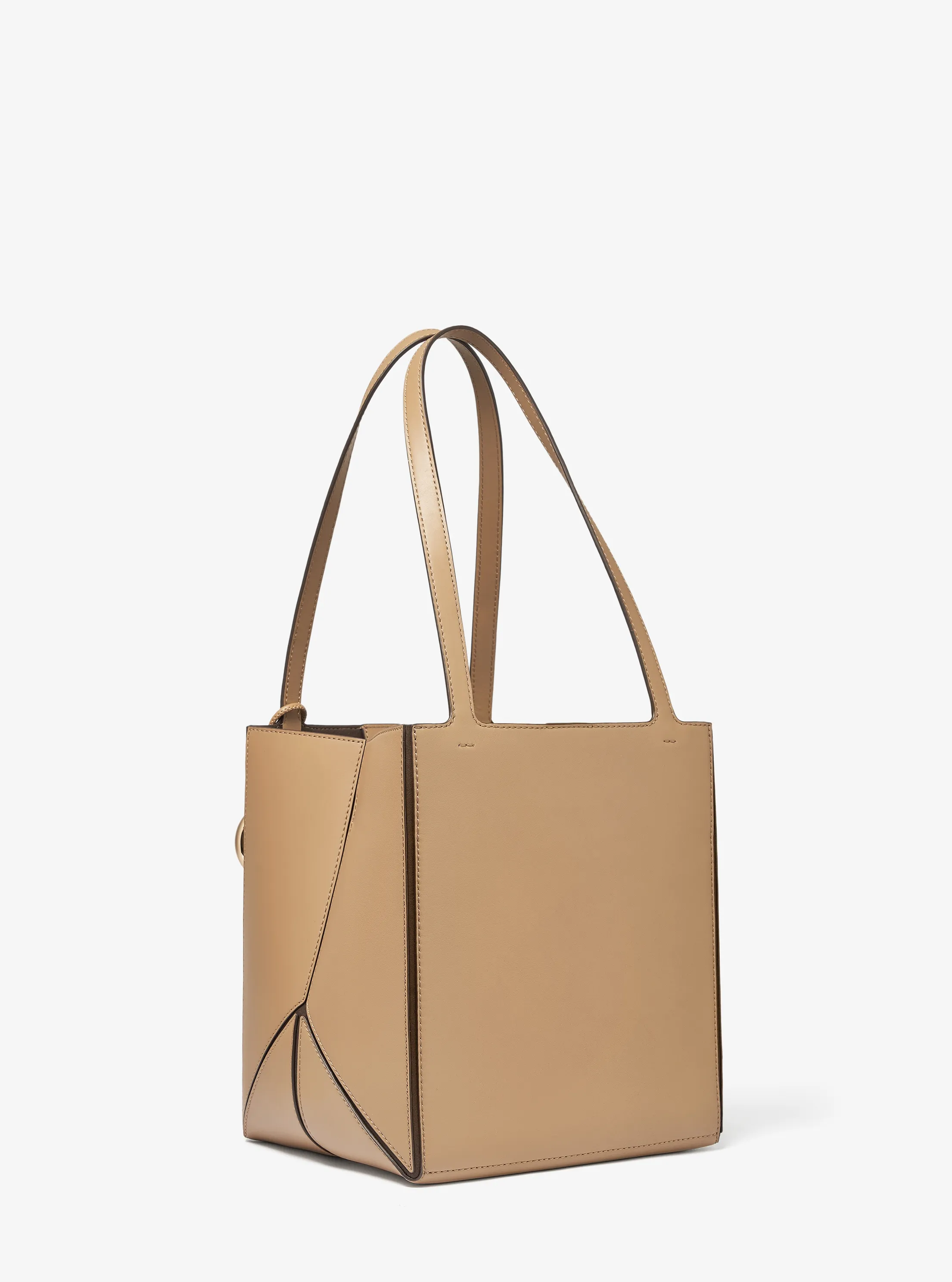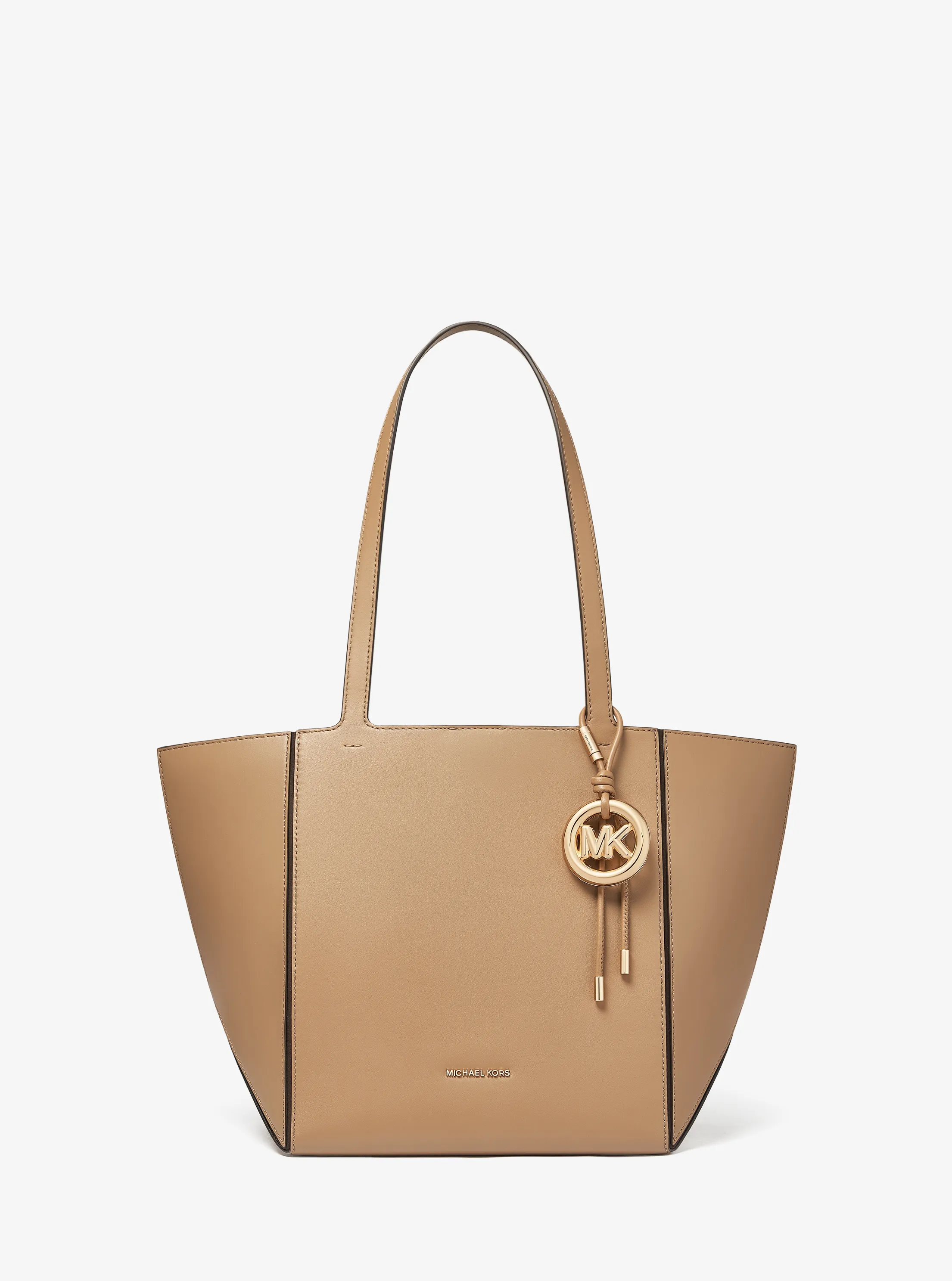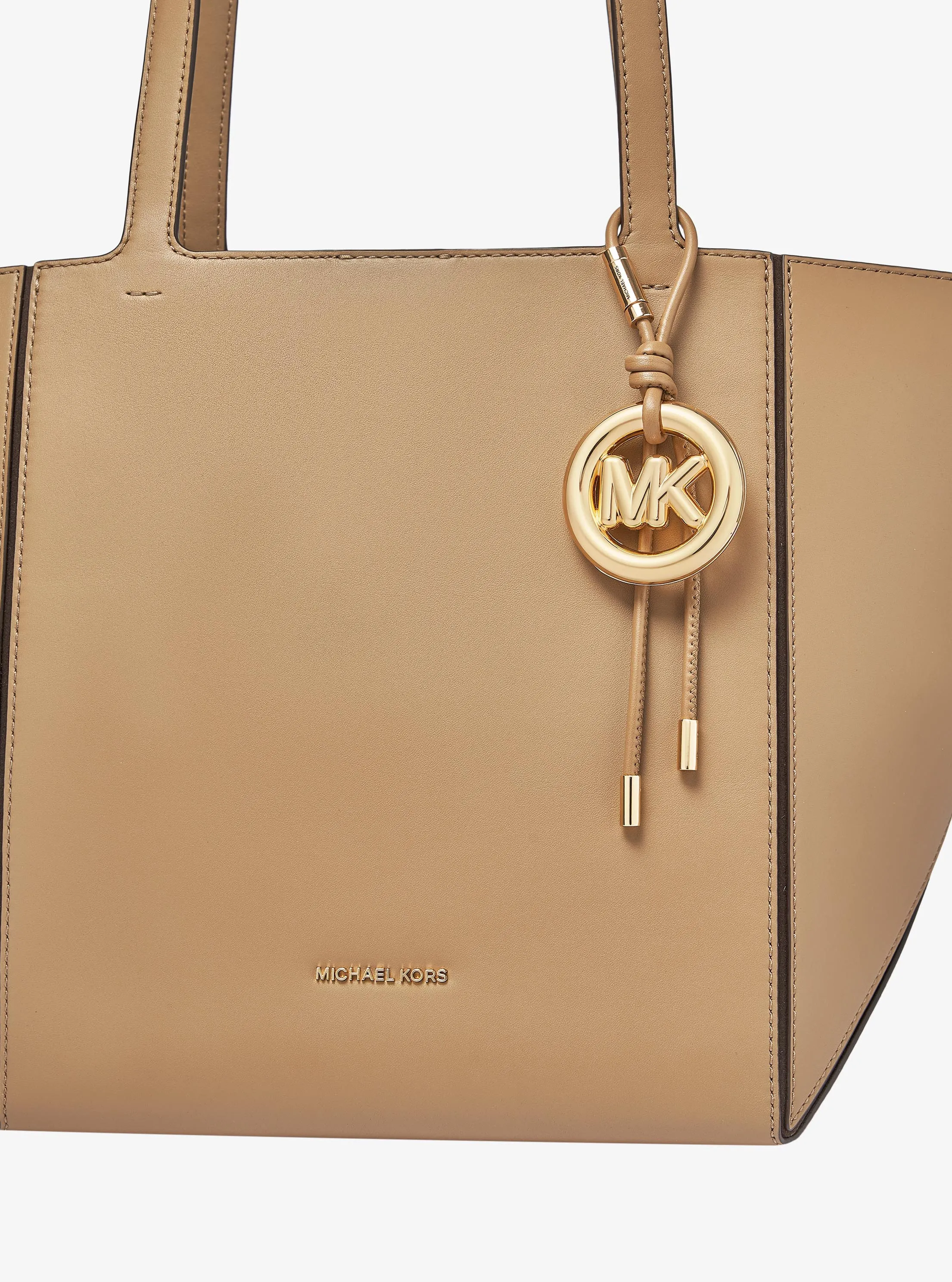 此款 Jordi 中号皮质托特包,是为她臻选的精美之礼。包身采用经典驼色材质打造大方简约的外形,包面上缀低调小巧的 MICHAEL KORS Logo 金属件和圆形 MK 挂饰装饰,细节处彰显品牌质感。设有长手提柄,方便手提使用。实用的大空间设计,可以轻松收纳您的随身物品。不妨带上它,轻松通勤。