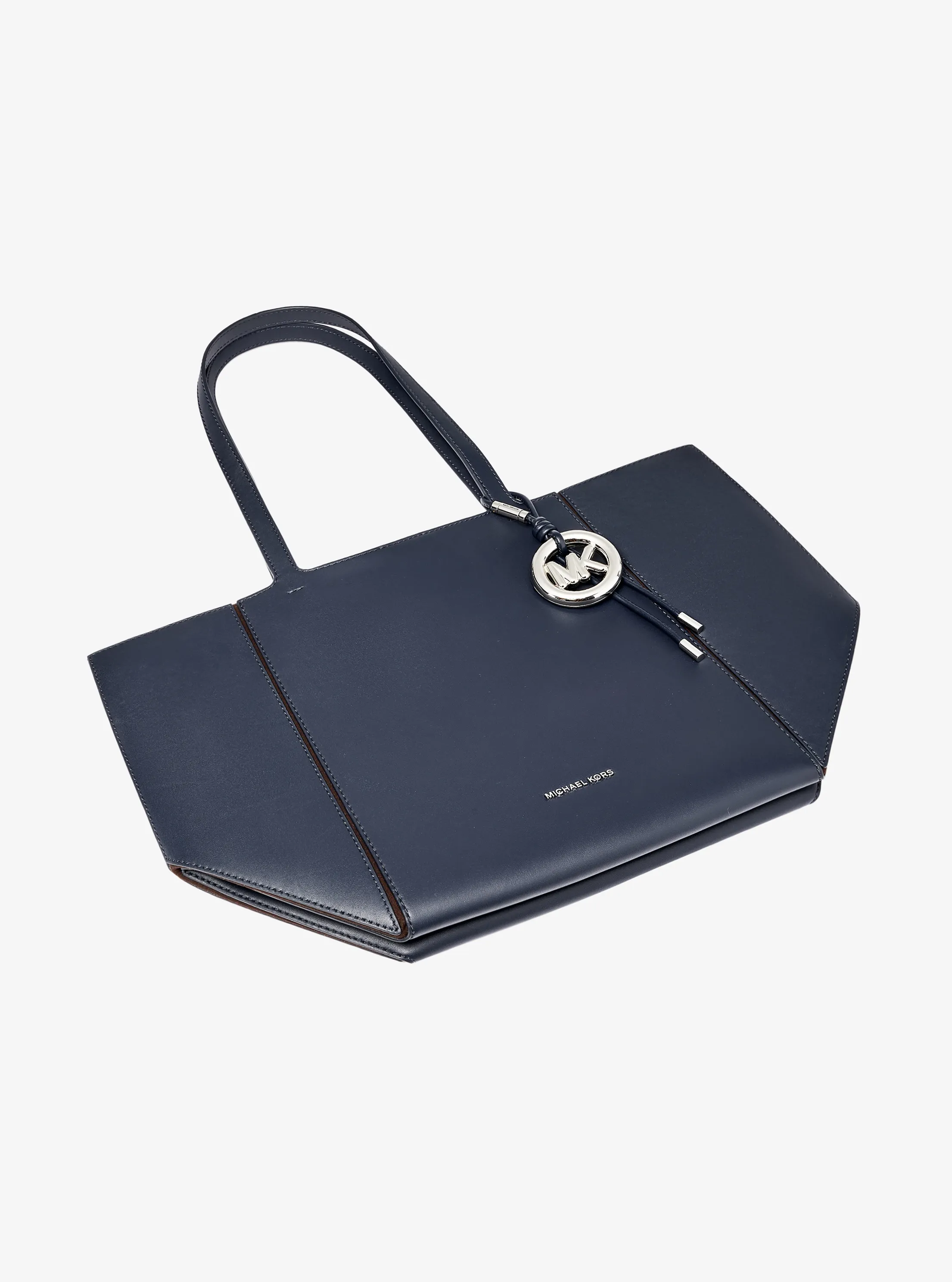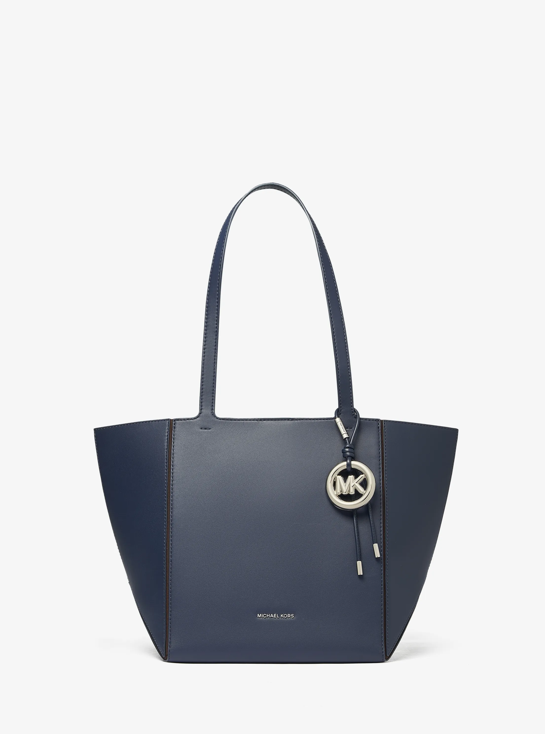 此款 Jordi 中号皮质托特包,是为她臻选的精美之礼。包身采用藏青色材质打造大方简约的外形,包面上缀低调小巧的 MICHAEL KORS Logo 金属件和圆形 MK 挂饰装饰,细节处彰显品牌质感。设有长手提柄,方便手提使用。实用的大空间设计,可以轻松收纳您的随身物品。不妨带上它,轻松通勤。