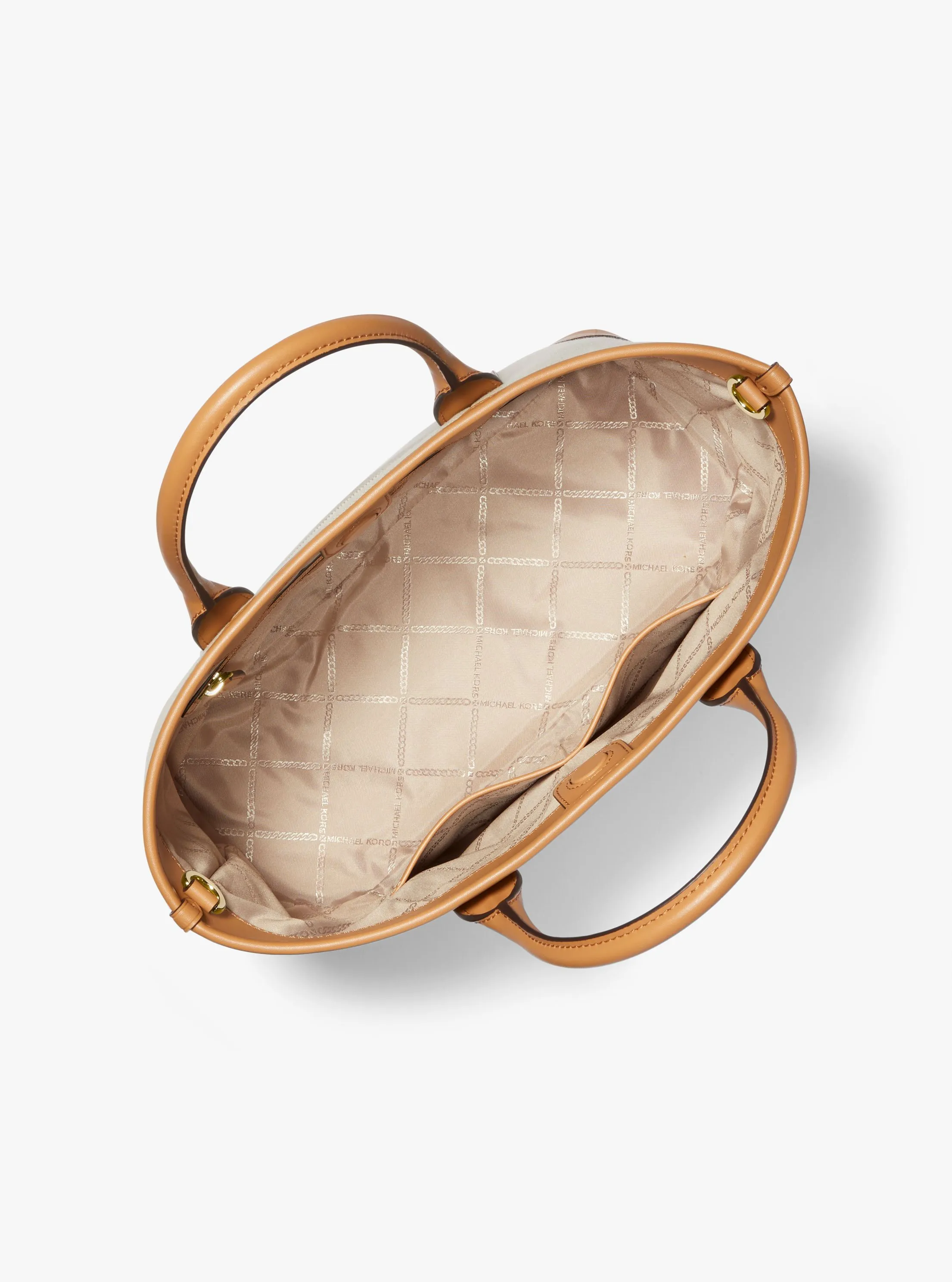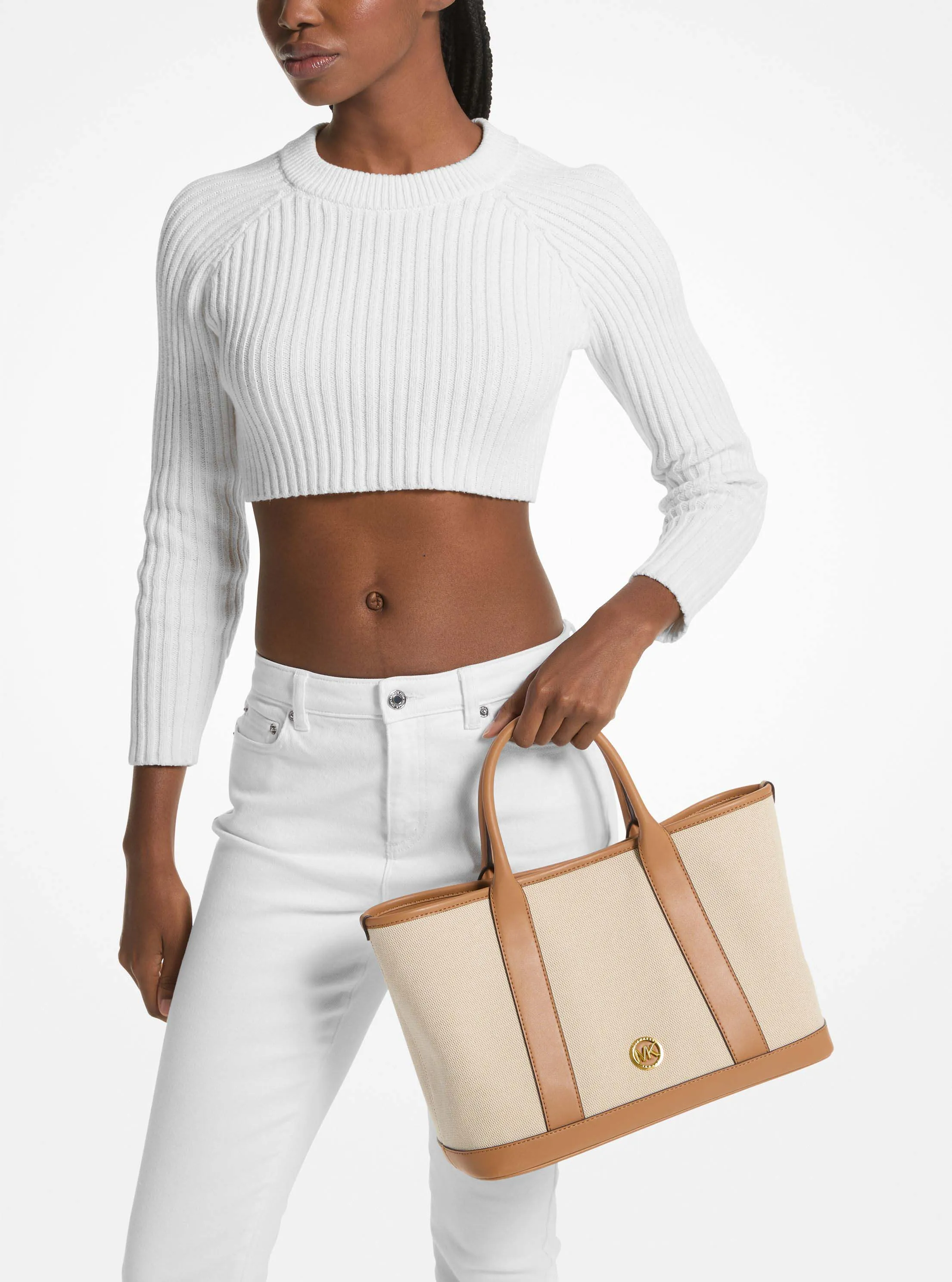 此款 Luisa 中号手提包,采用米白色材质拼接打造包身,简单百搭的廓形,透露着休闲活力。磁吸扣开合设计,增添单品安全性。实用的大空间设计,可收纳手机、长款钱包和日记本等随身小物。配有纯花生色手提柄和可拆卸、可调节的字母印花长肩带,让您随心切换携带方式。不妨带上它,魅力出行,享受日常通勤和短途出游时光。