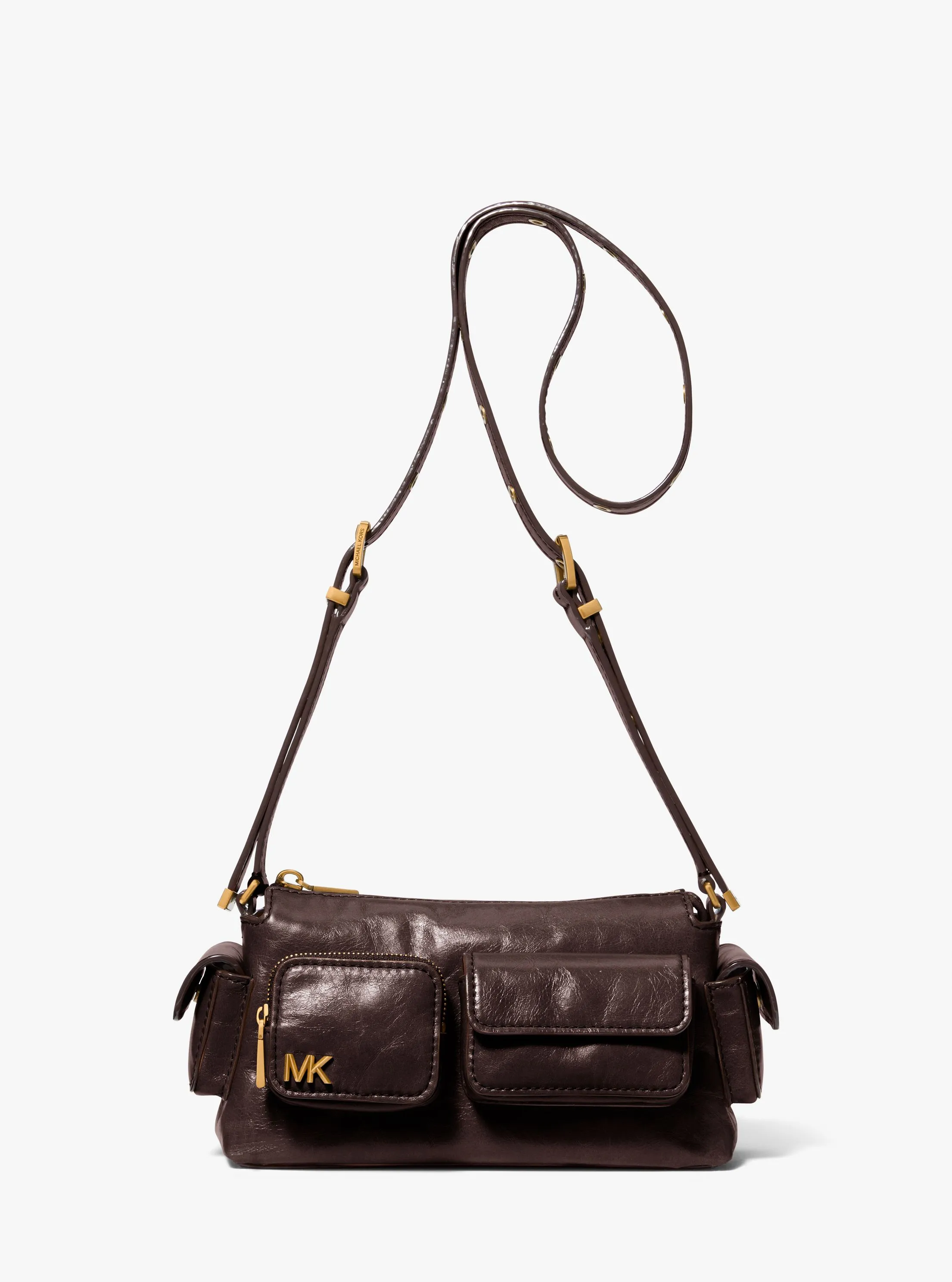 此款 Dakota 小号皮质斜挎包诠释新一代街头时尚。采用巧克力色材质打造,包身上缀一个拉链贴袋和一个翻盖贴袋,搭配小巧 MK Logo 金属件装饰,两侧设有翻盖贴袋,设计感满满的同时,灵动实用。包身主体拉链开合,细节处彰显品牌质感。设有可调节长肩带,为休闲造型注入前卫潮流感,打造适合多场合穿搭的时髦单品。