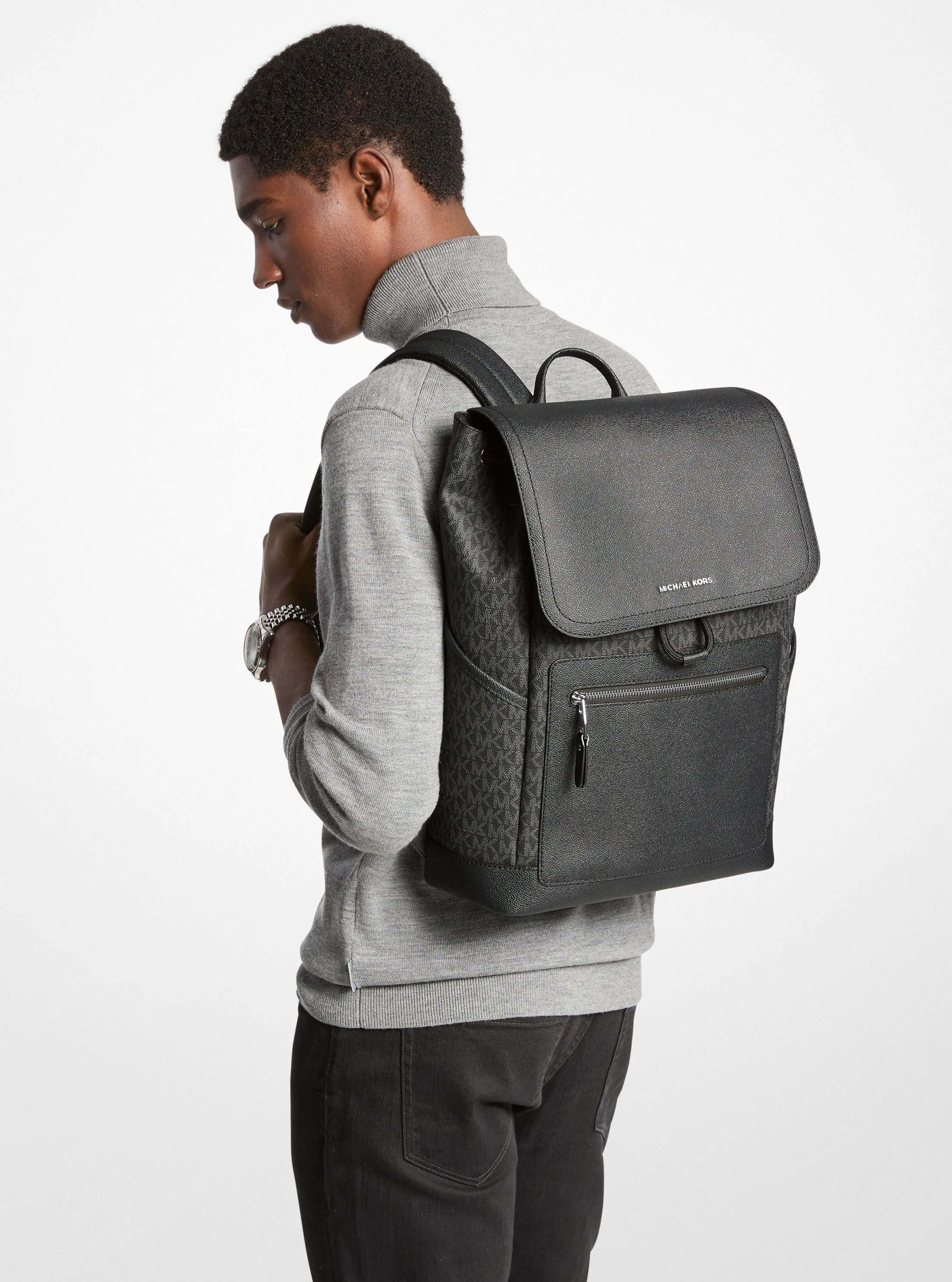 此款男士 Hudson 双肩包,采用经典黑色材质打造,潮流而不失品牌质感。翻盖设计,包盖上缀小巧 MICHAEL KORS Logo 金属件点缀。包身设有拉链贴袋,两侧设有插袋,单品内部空间充裕,可以轻松容纳您的随身物品,隔层设计,让物品收纳地井井有条。设有双肩背带,整体简约大气,是您通勤和外出旅行的上佳之选。