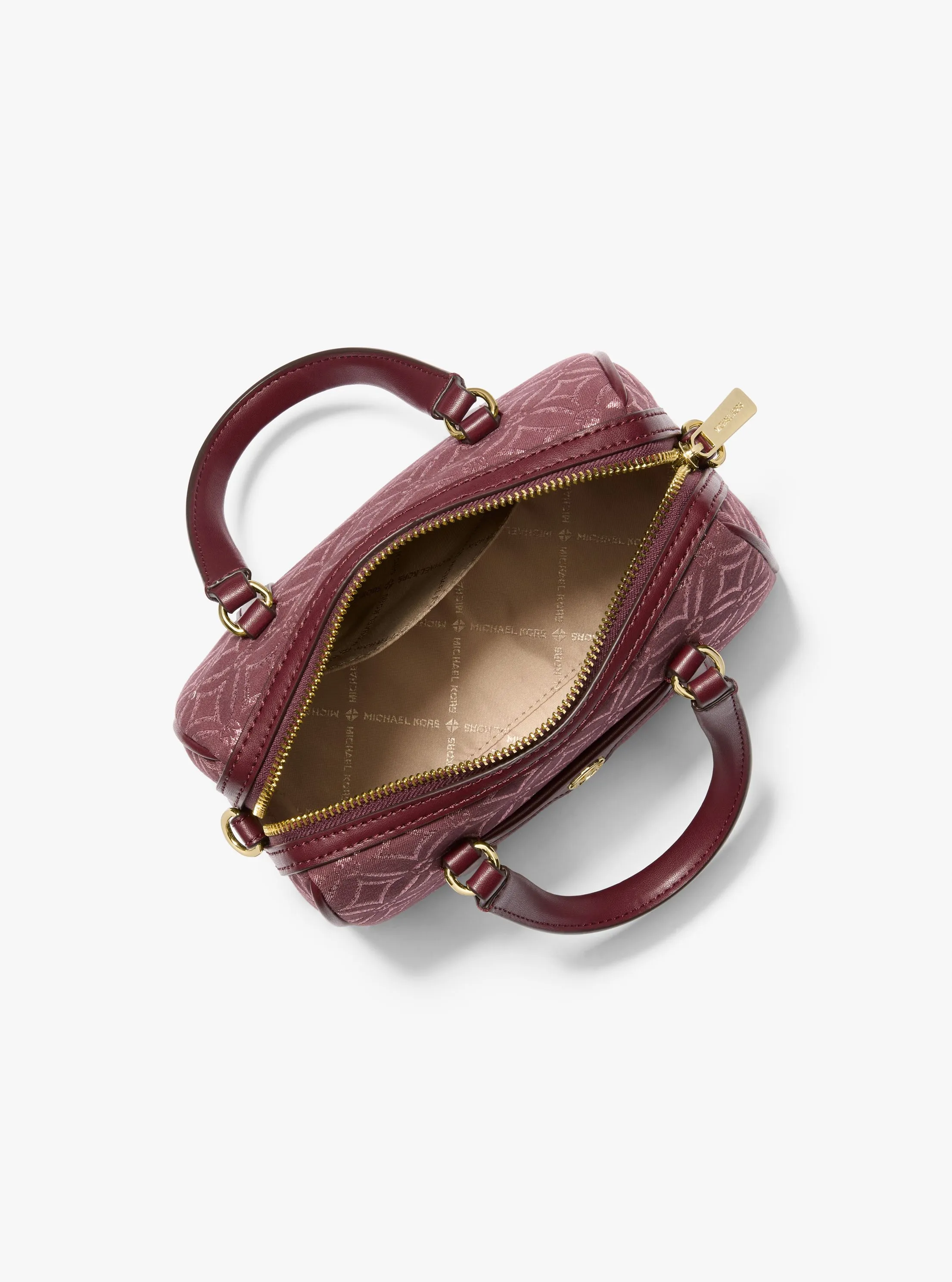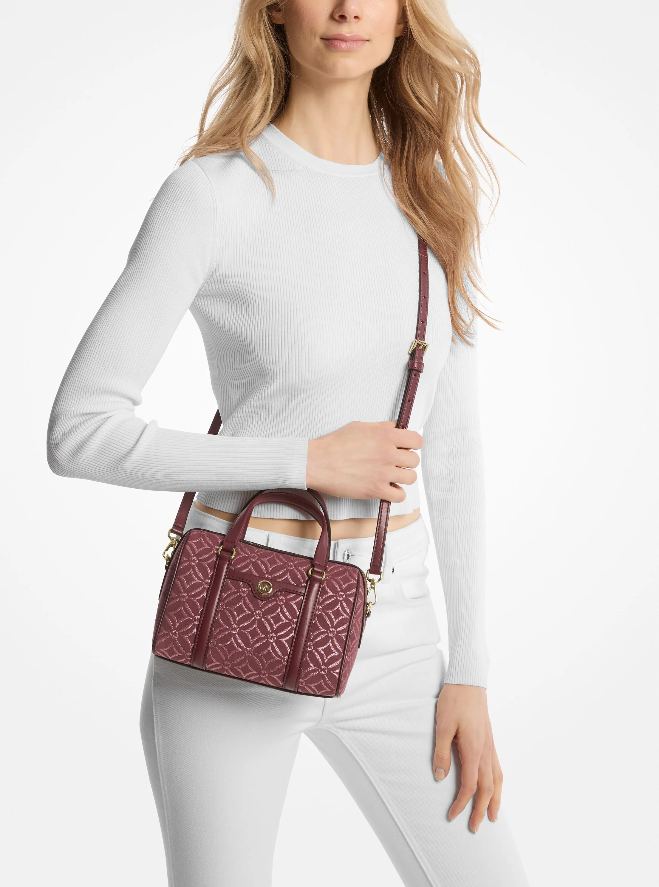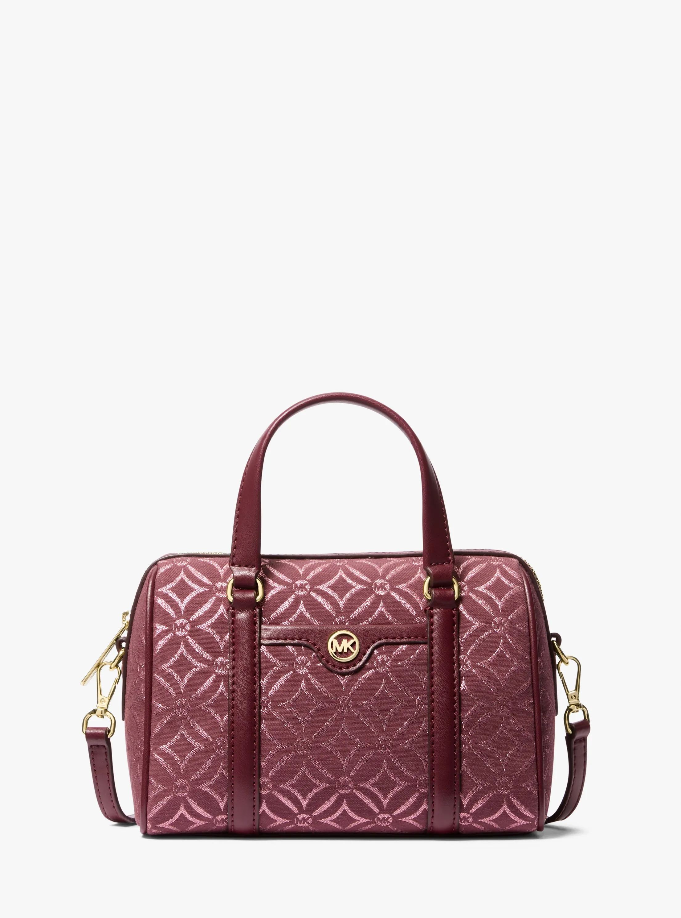 此款 Travel 小号斜跨包,采用血红色图案印花材质打造波士顿包型,为个性单品增添了一抹经典高级的气质,为休闲造型注入前卫潮流感,打造适合多场合穿搭的时髦单品,兼具潮流与柔美。包身上缀圆形 MK LOGO 金属件装饰,闪耀迷人光泽。拉链开合,内部设有多个隔层,可以轻松容纳您的随身物品。配有纯色手提柄和可调节长肩带,随心切换携带方式,增添单品实用性。不妨搭配本季新款连衣裙和运动鞋,打造休闲轻盈通勤造型。