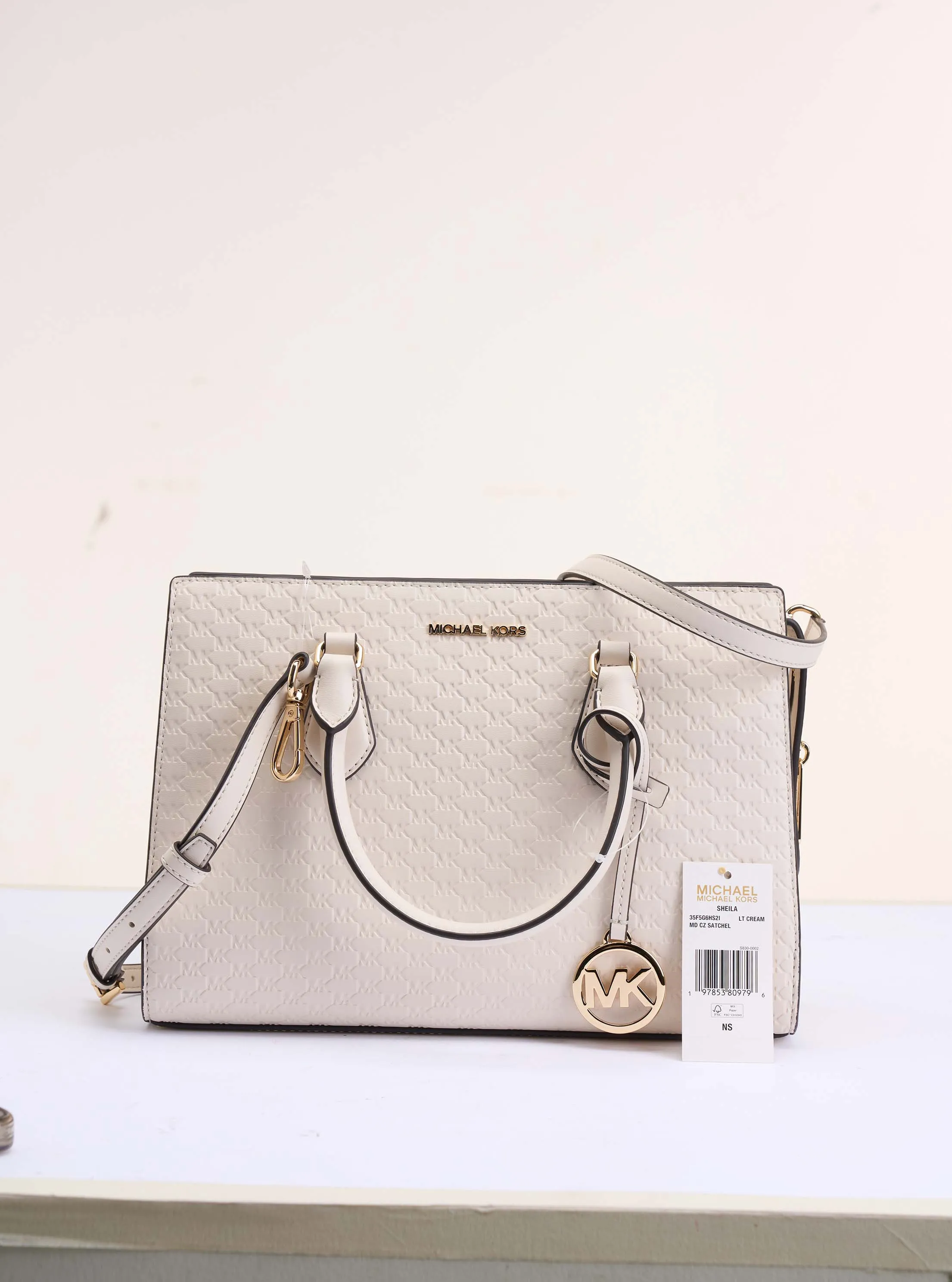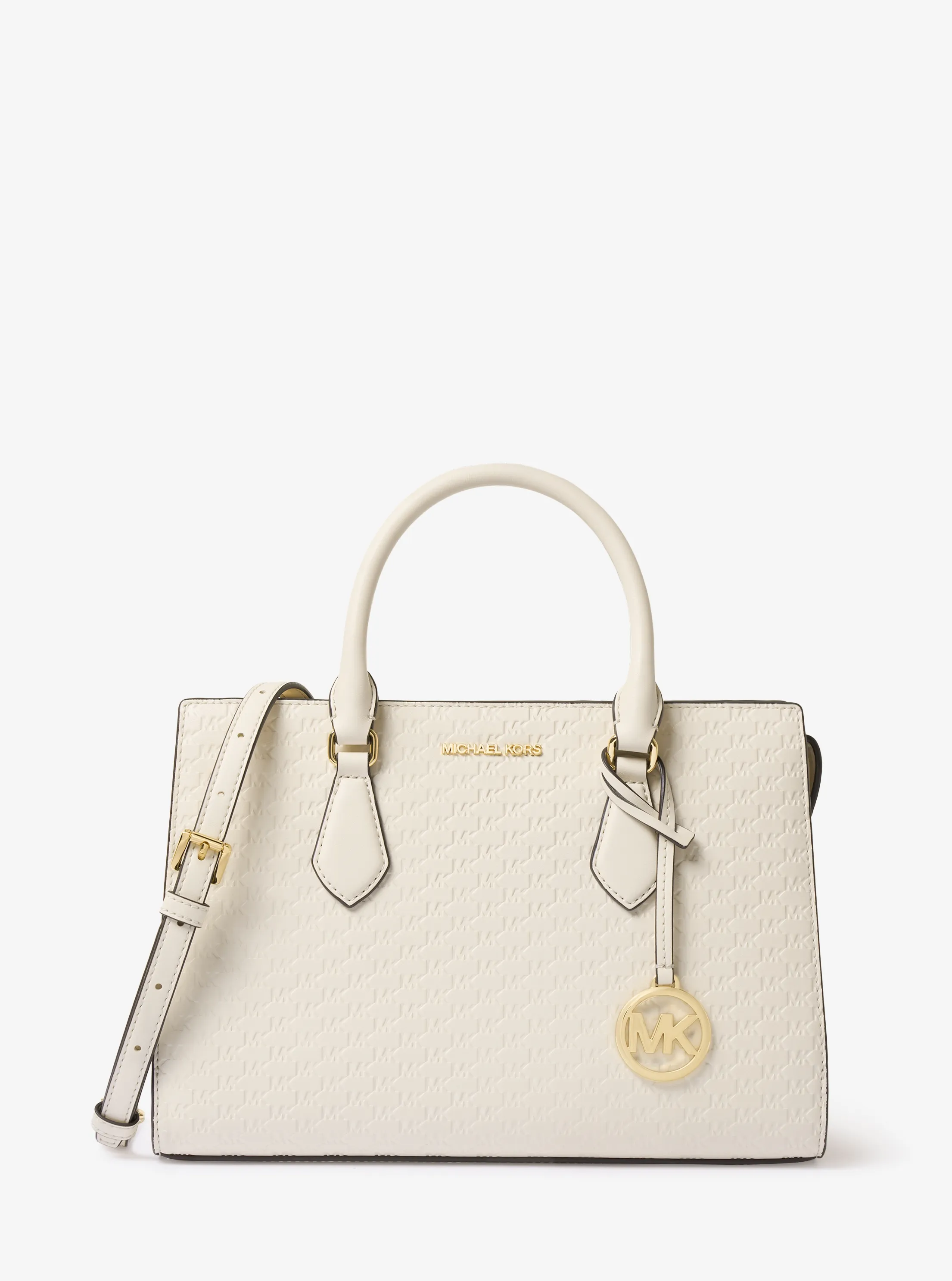 此款 Sheila 中号手提包,采用奶白色材质打造经典包型,线条流畅的设计搭配极简五金配件,包身上缀 MK Logo 圆形金属挂饰,低调而不失优雅。配有手提柄和可调节长肩带,便于随心切换携带方式。单品内部空间充裕,设有多个隔层,方便携带您的随身物品。不妨搭配本季新款连衣裙和鞋履,打造质感通勤造型。