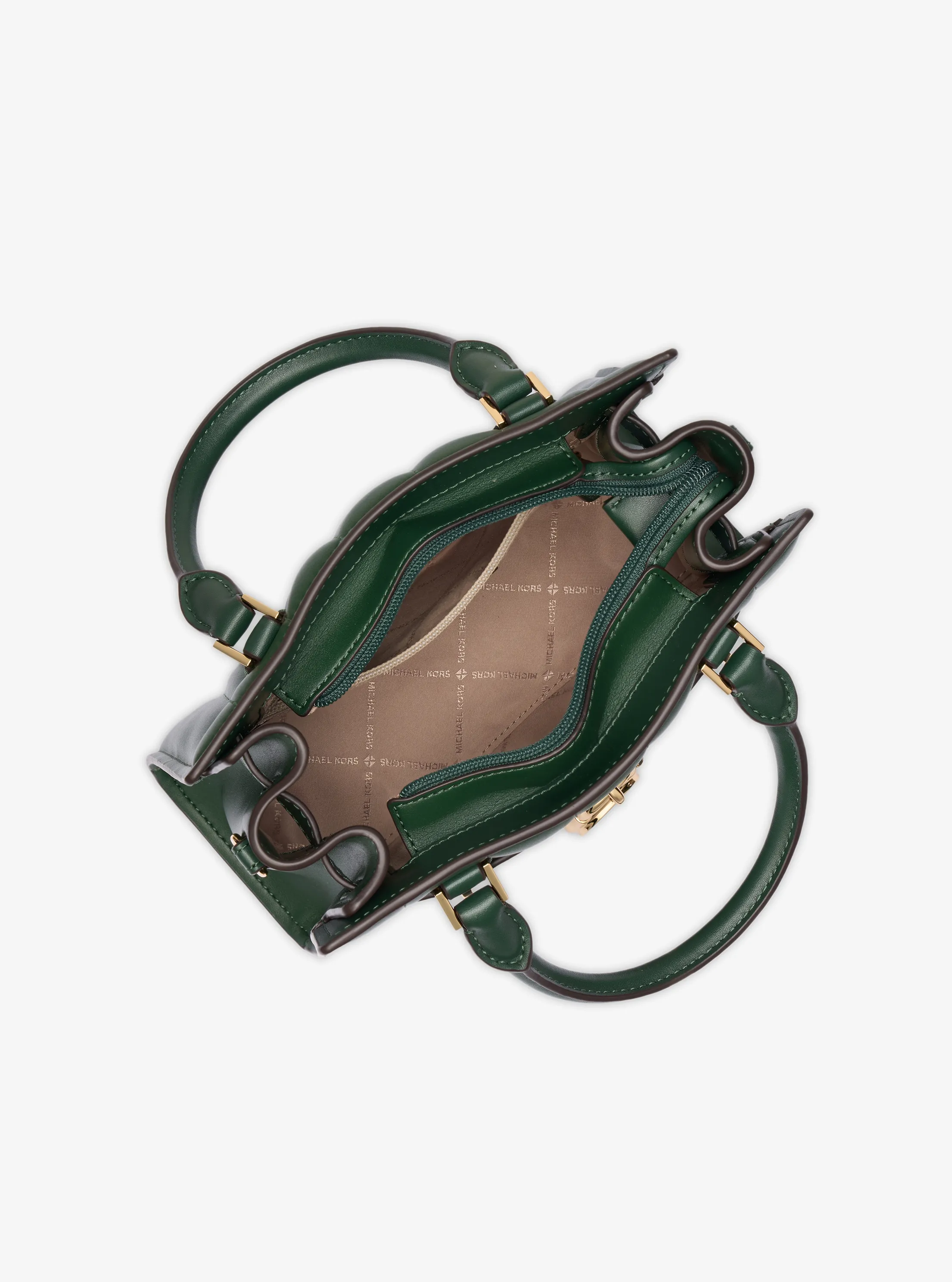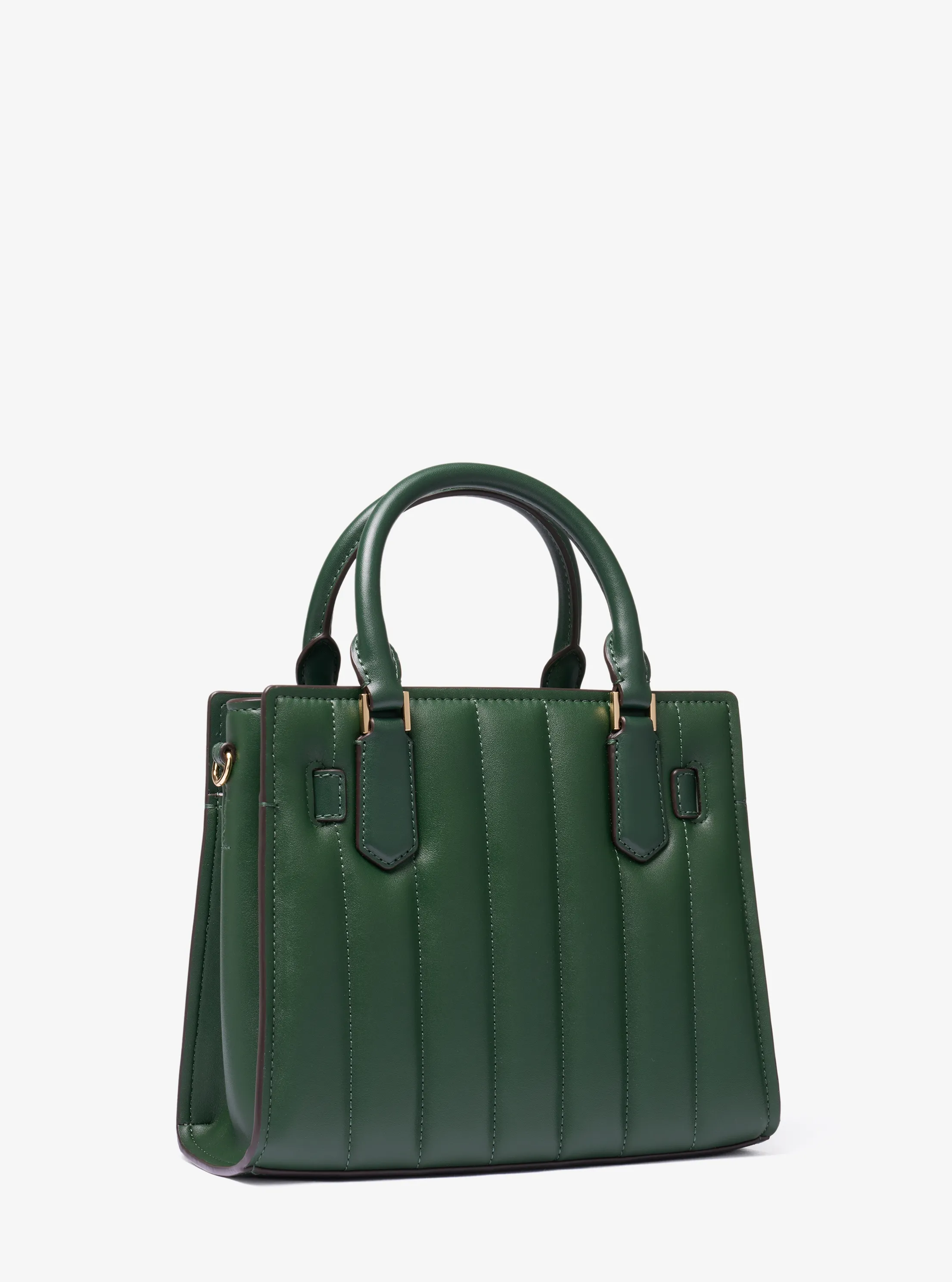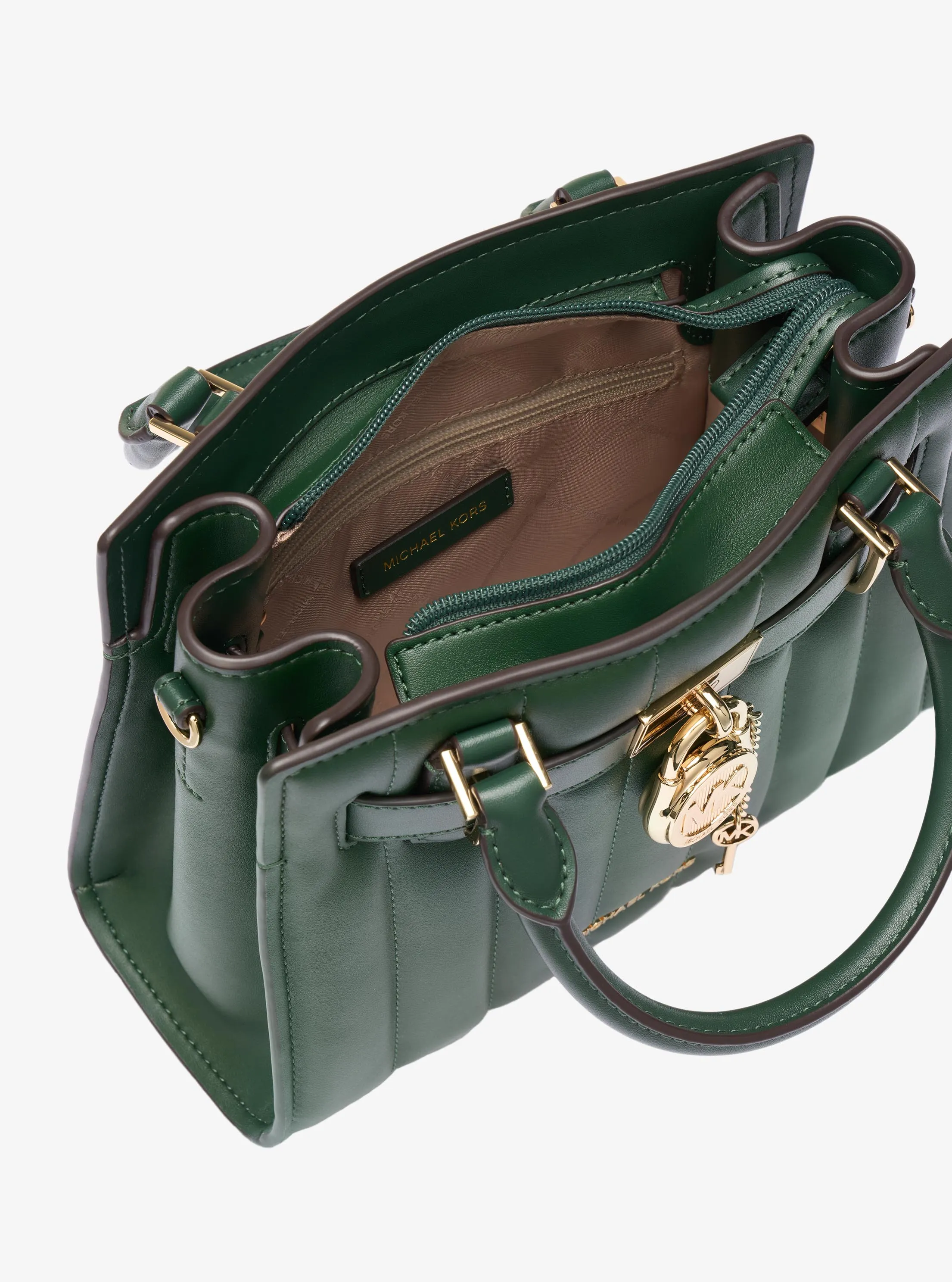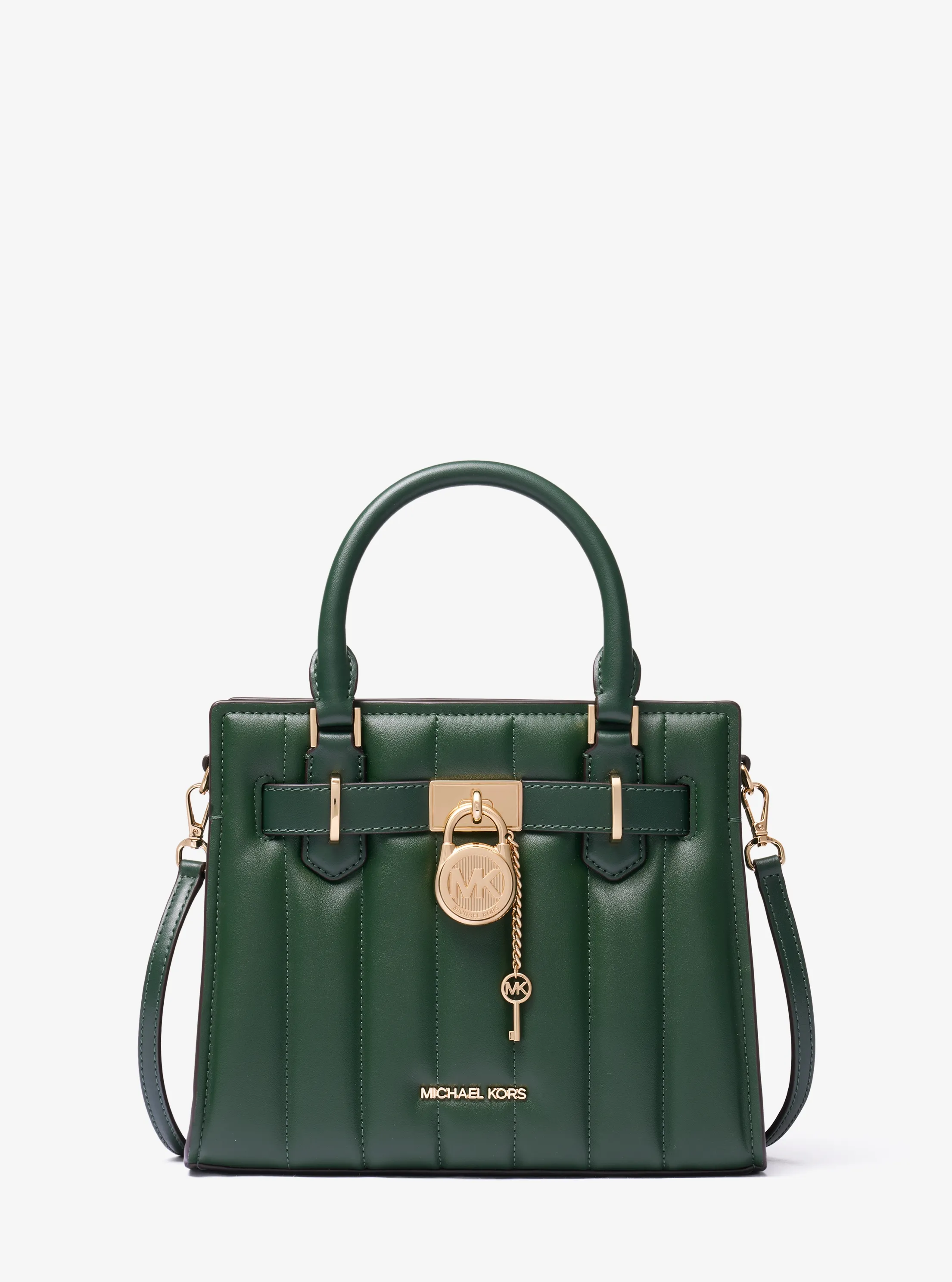 此款 Hamilton 小号锁头绗缝手提包,小巧精致,采用墨绿色材质搭配纵向绗缝工艺打造而成,包型立体挺括,包面饰有精美品牌 Logo 金属件,是您打造日常造型的心仪之选。包袋内部空间充裕,可轻松收纳您的口红、钱夹和纸巾等随身物品。设有手提柄和可调节长肩带设计,不妨手拎或轻轻背在肩上,随心切换携带方式,散发您的优雅气质。