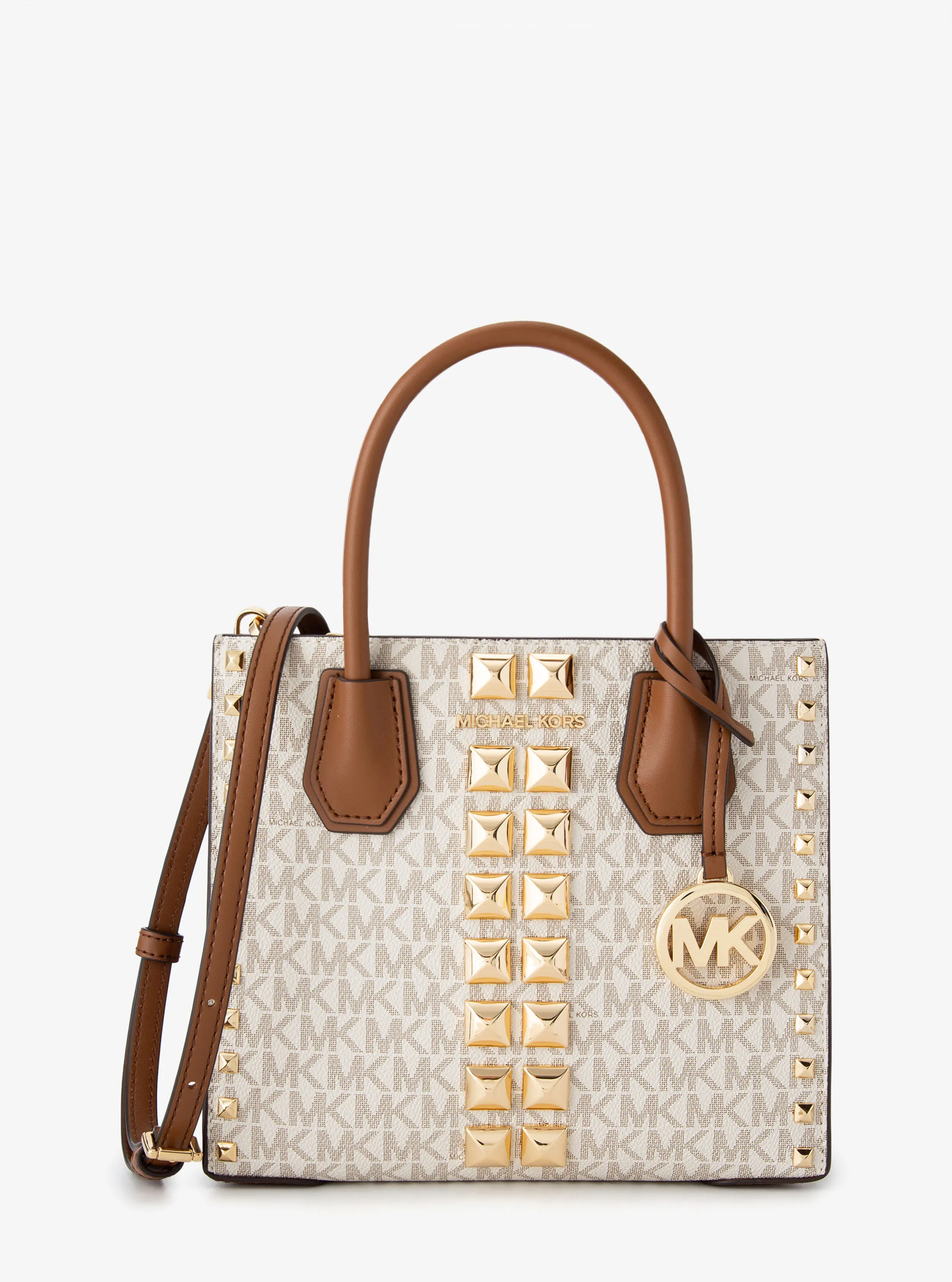 此款 Mercer 中号老花手提包,采用白色品牌标志性 Logo 印花打造包身,搭配橡果棕色手柄和可调节肩带。耀眼双排金字塔形铆钉装饰,圆形MK Logo 金属件挂饰,彰显时髦风范。精妙设计的内里可以轻松收纳您的卡夹、手机和唇彩,在容纳众多细小杂物的同时为整体造型点睛。不妨将之作为优雅的手提包使用,或装上随附的肩带,轻松斜挎出行。