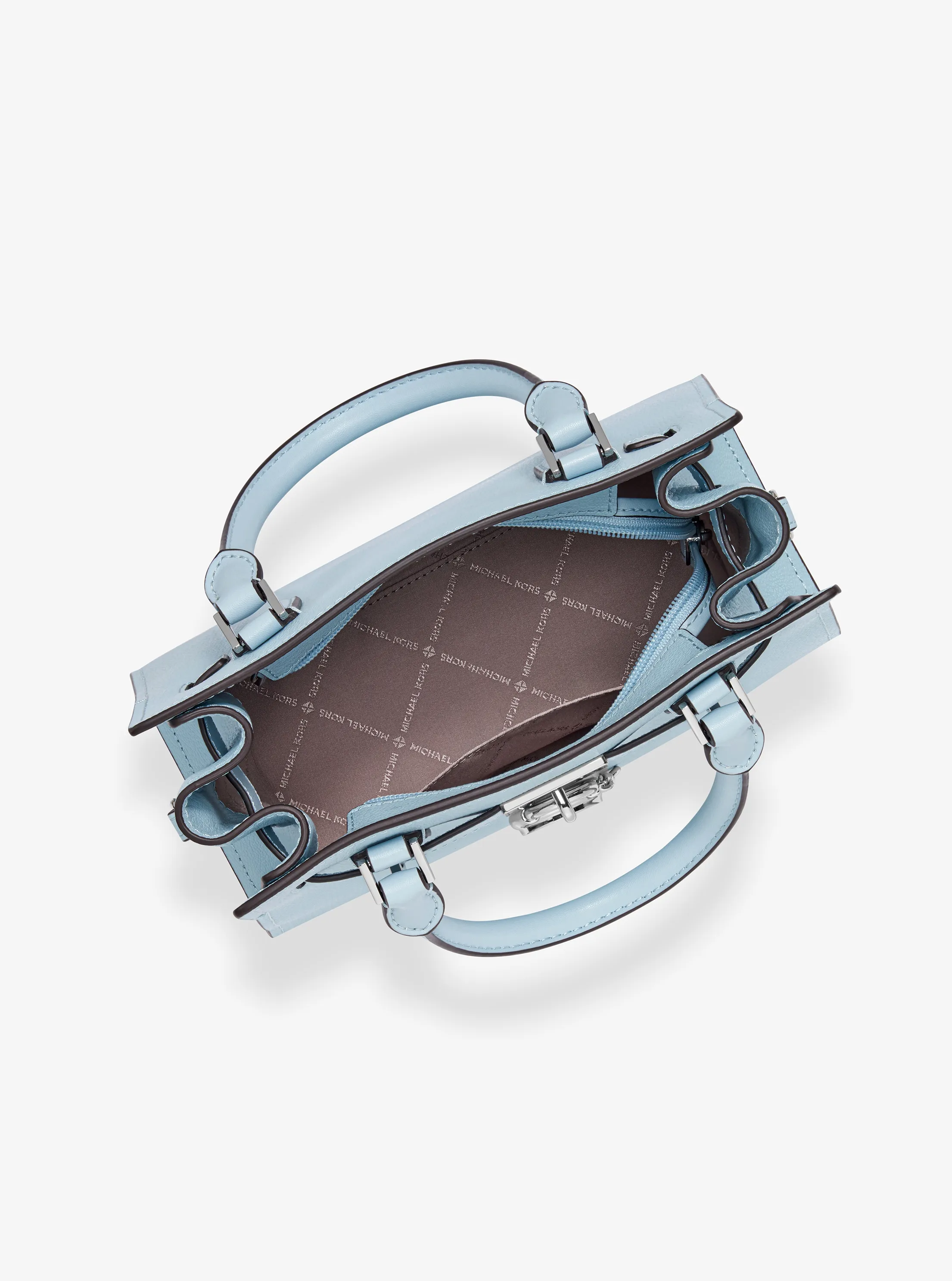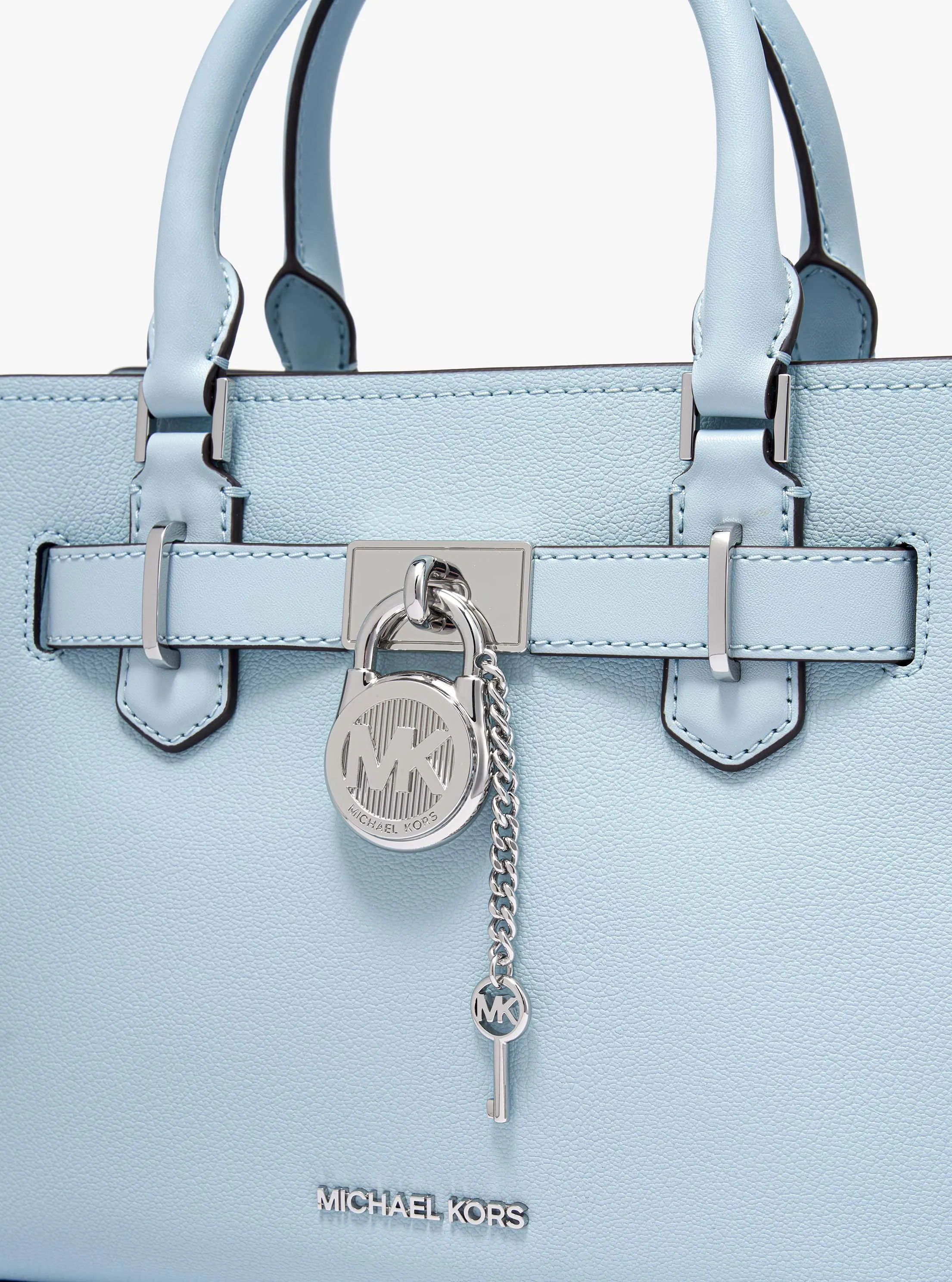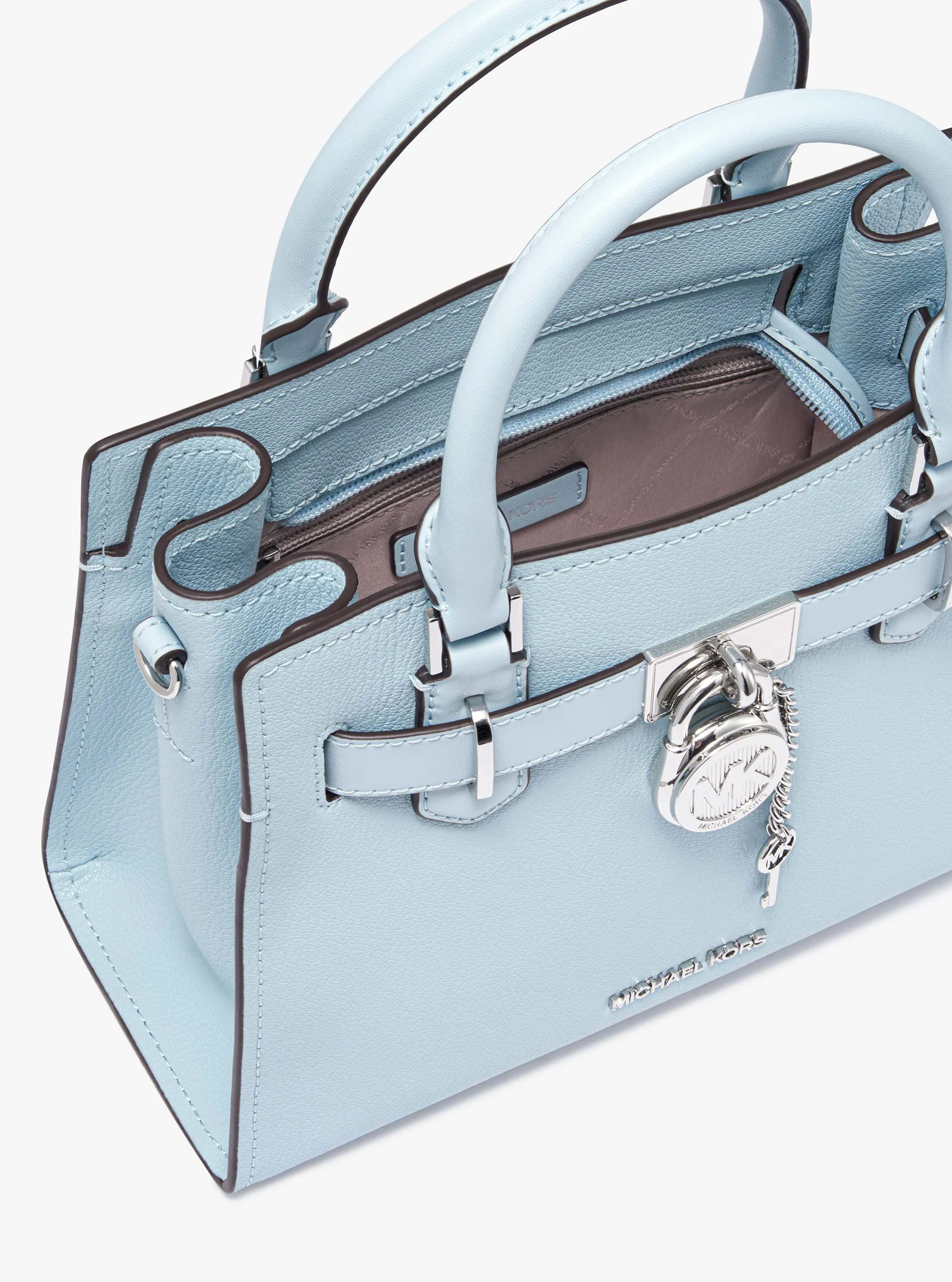 此款 Hamilton 小号手提包,小巧精致,采用清新浅蓝色材质打造而成,包型立体挺括,包面饰有精美品牌 Logo 金属件,是您打造日常造型的心仪之选。包袋内部空间合理,可轻松收纳您的口红、钱夹和纸巾等随身物品。设有手提柄和可调节长肩带,不妨手拎或轻轻背在肩上,随心切换携带方式,散发您的优雅气质。