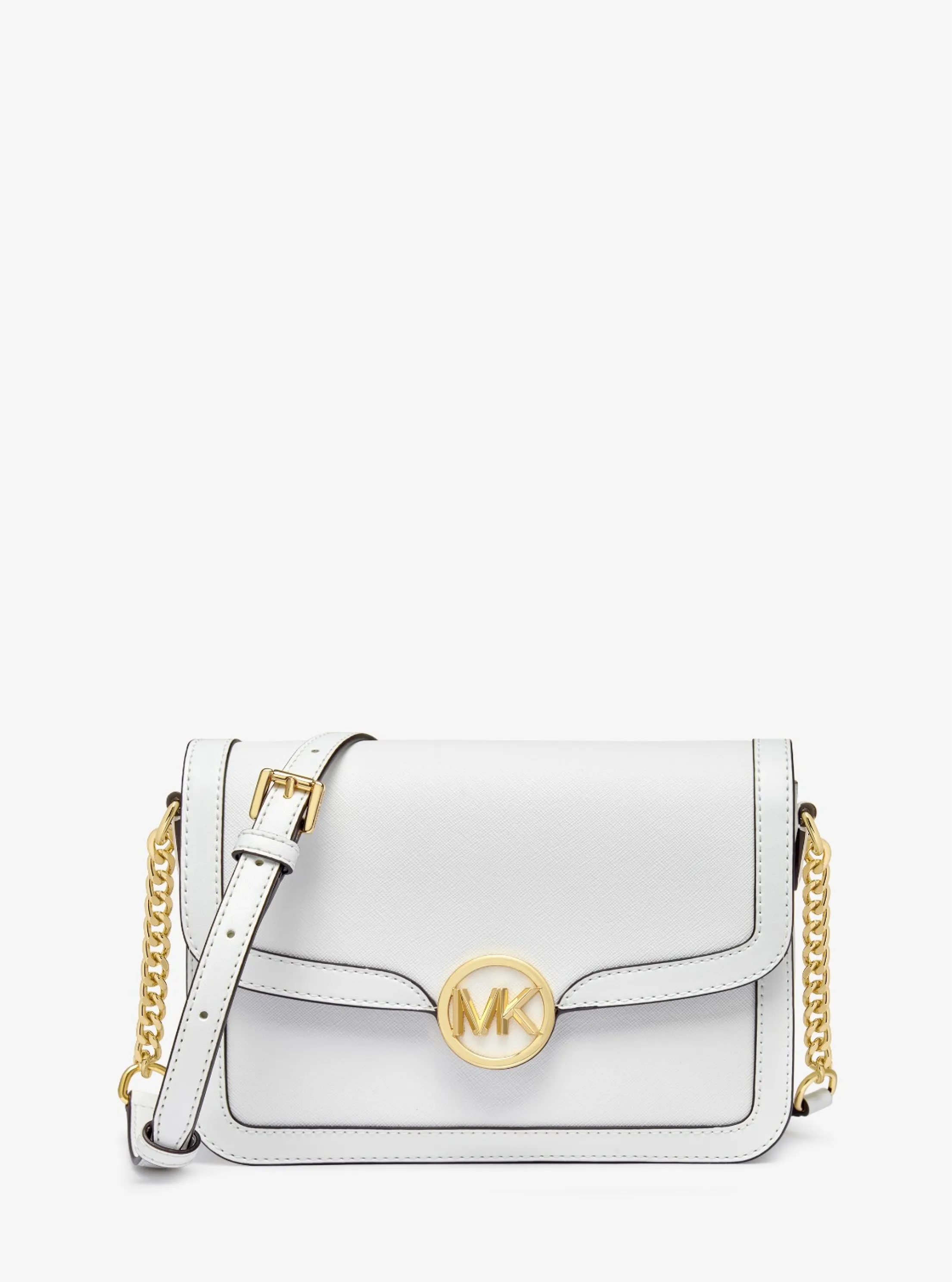此款 Leida 中号邮差包,简约廓形,选用圆形金色 MK Logo 金属件封存优雅气质,细节处彰显品牌质感。采用精美白色材质打造包身,翻盖设计,内部空间充裕。单品设有链条拼接可调节肩带,彰显不俗潮流品味。不妨搭配本季新款连衣裙,打造优雅干练通勤造型。