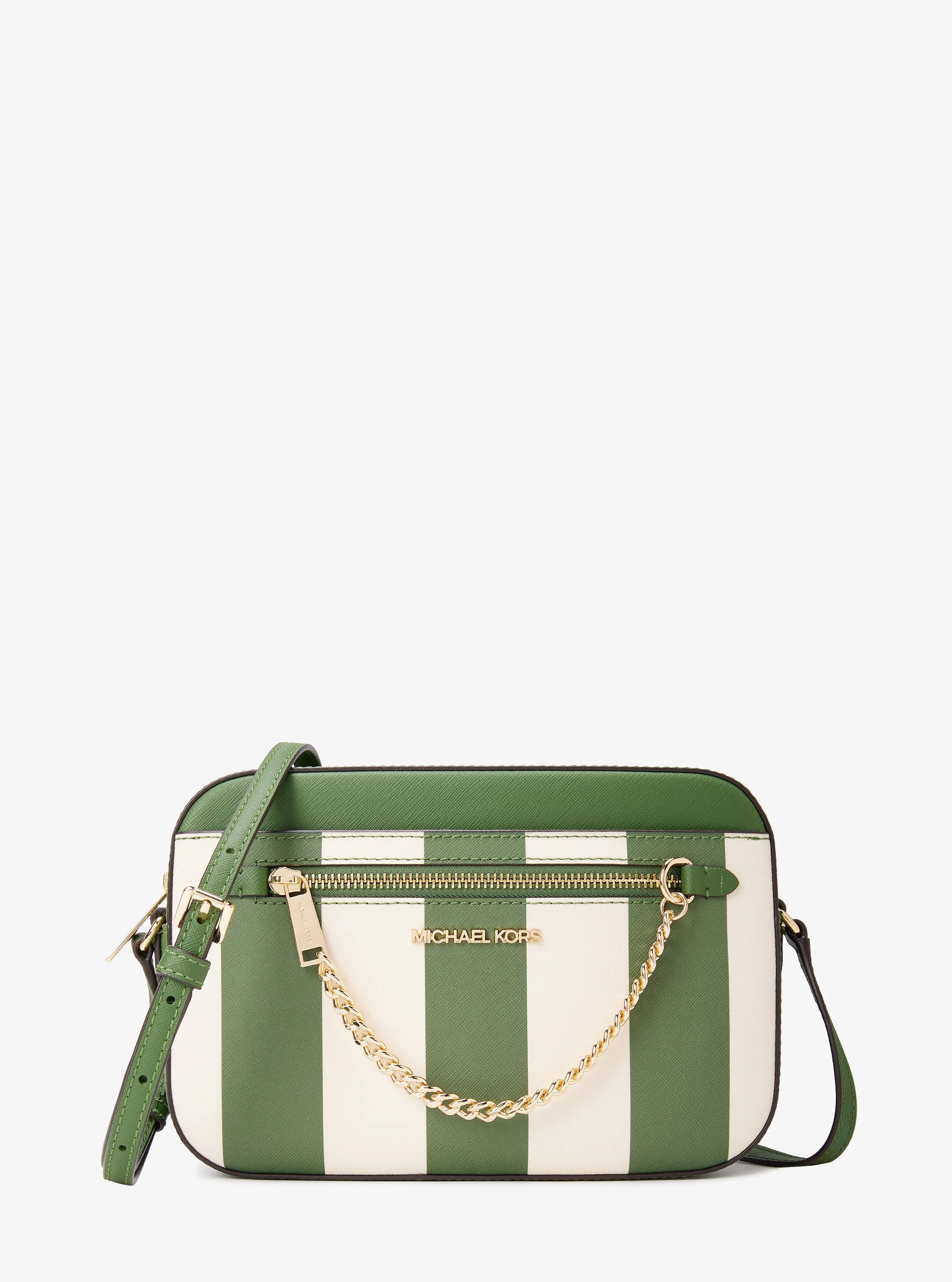 此款 Jet Set Item 大号条纹斜挎包,包身采用绿色和白色拼接竖条纹材质打造,上缀小巧 MICHAEL KORS 金属件和金属挂链的拉链贴袋装饰,细节处彰显品牌个性质感。简约包型,小巧包身,拉链开合,是您出行的轻便之选。单品设有可调节宽肩带,潮流而不失实用性。不妨搭配休闲套装,打造质感潮流造型。