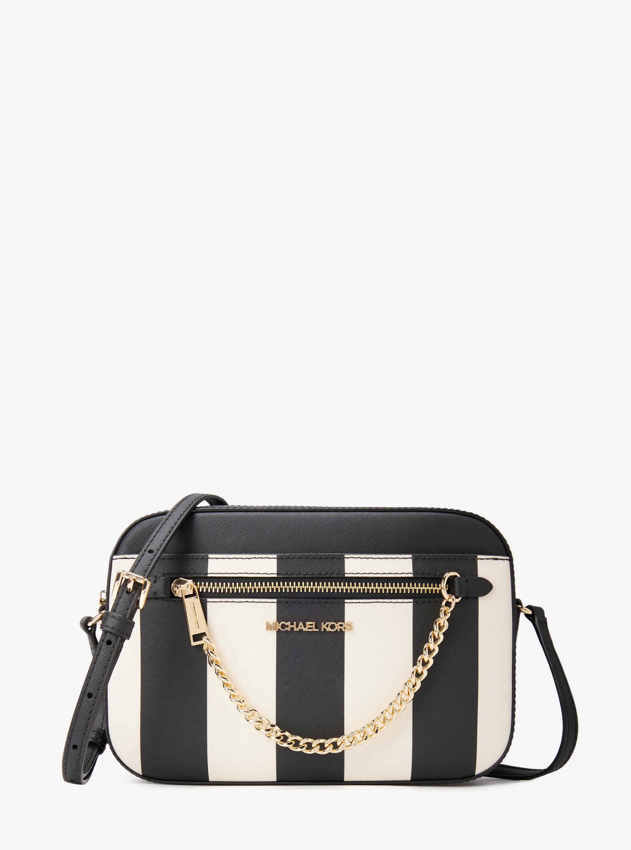 此款 Jet Set Item 大号条纹斜挎包,包身采用黑色和白色拼接竖条纹材质打造,上缀小巧 MICHAEL KORS 金属件和金属挂链的拉链贴袋装饰,细节处彰显品牌个性质感。简约包型,小巧包身,拉链开合,是您出行的轻便之选。单品设有可调节宽肩带,潮流而不失实用性。不妨搭配休闲套装,打造质感潮流造型。