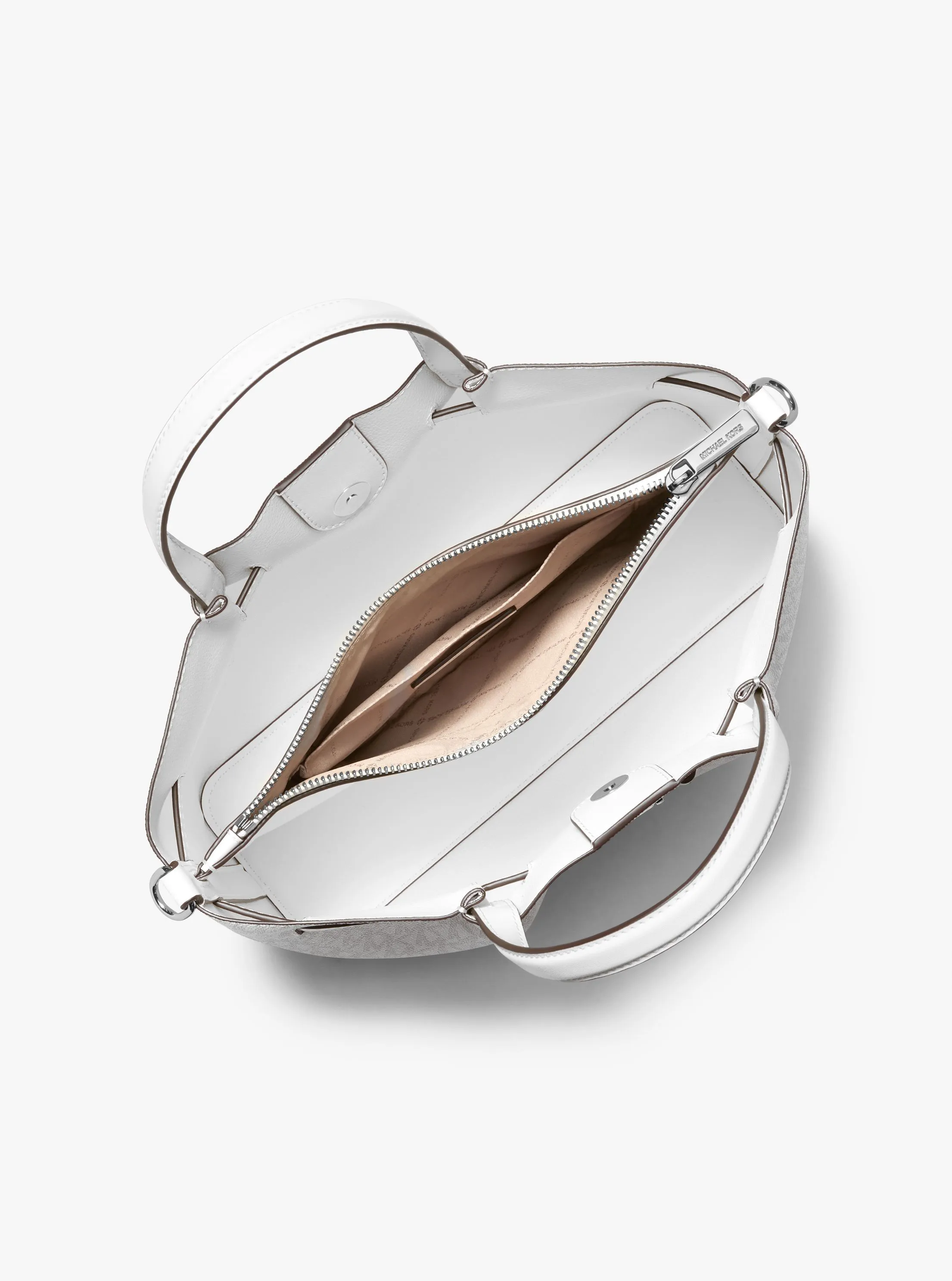 此款 Carson 中号老花手提包,采用白色品牌标志性 Logo 印花材质打造包身,上缀皮革袢带和圆形 MK Logo 金属件挂饰点缀,柔美而不失干练气息。搭配手提柄和可调节肩带,便于随心切换携带方式。内部空间充裕,可以轻松容纳您的随身物品。不妨搭配本季新款连衣裙,打造优雅通勤造型。