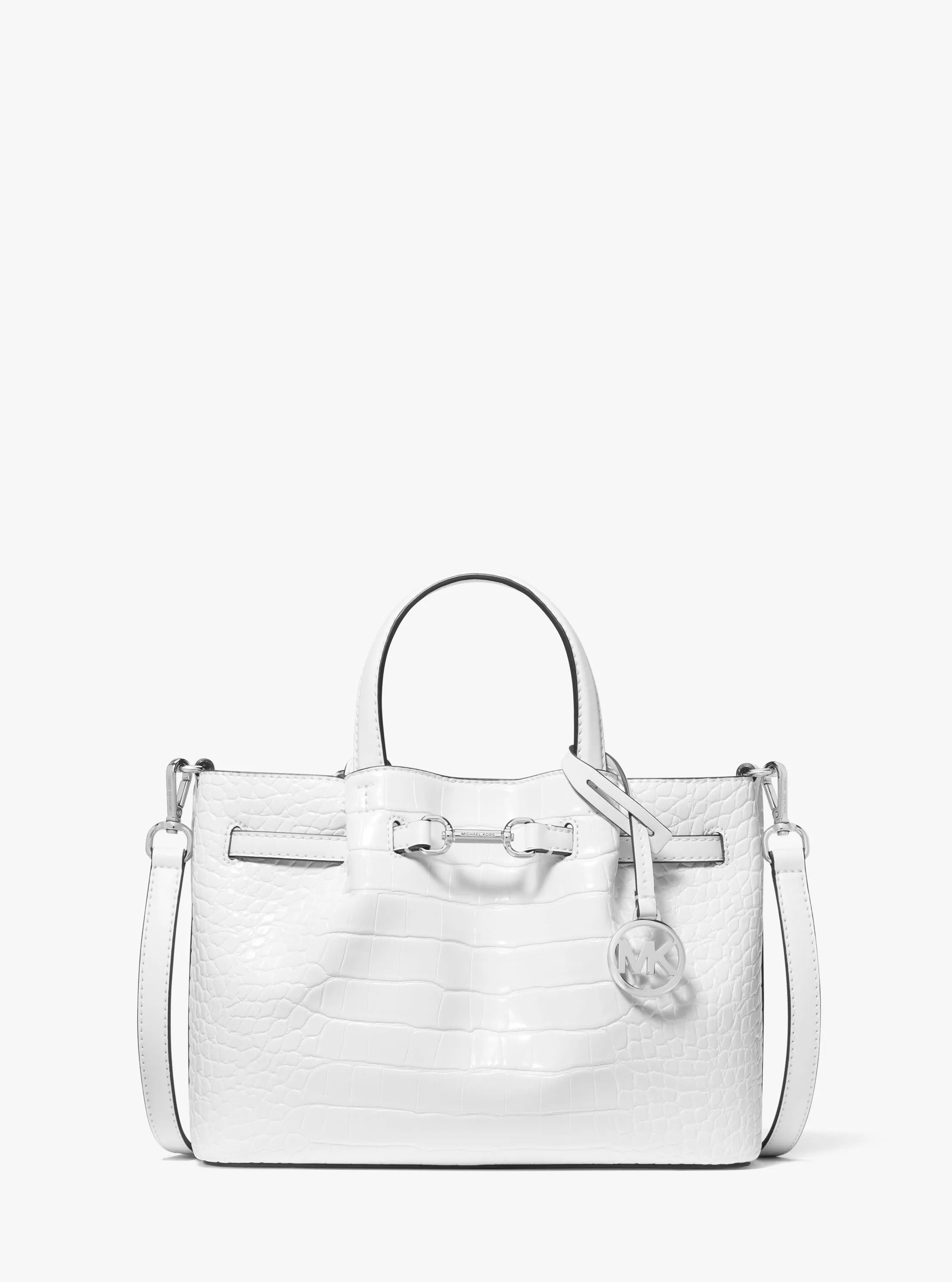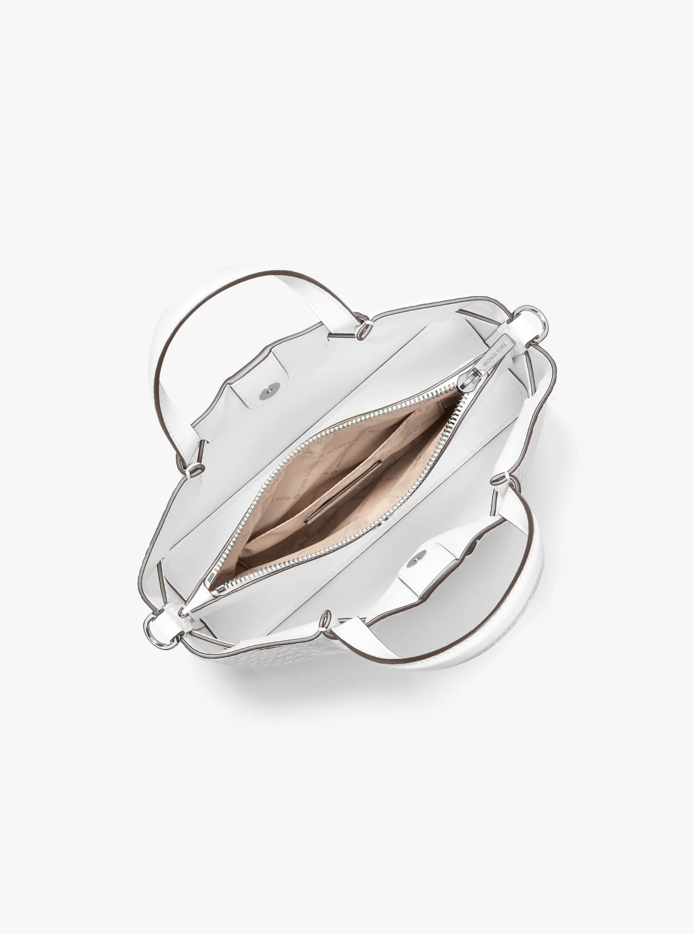 此款 Carson 小号手提包,采用纯白色压纹材质打造包身,上缀同色皮革袢带和圆形 MK Logo 金属件挂饰点缀,柔美而不失干练气息。搭配手提柄和可调节肩带,便于随心切换携带方式。内部空间充裕,可以轻松容纳您的随身物品。不妨搭配本季新款连衣裙,打造优雅通勤造型。