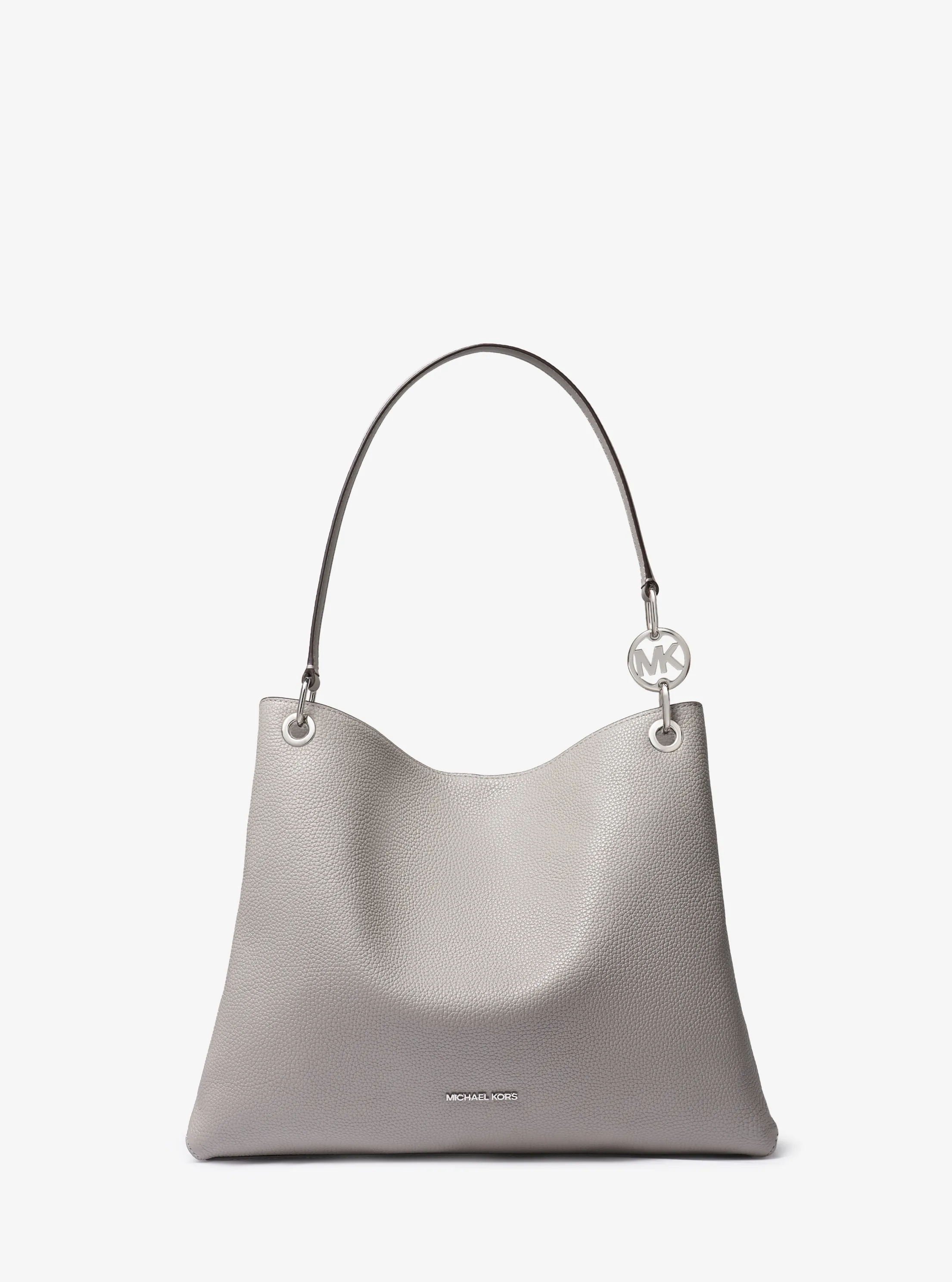 此款 Christina 大号斜挎包,采用柔软珍珠灰色材质打造时下流行的慵懒随性大包造型,复古而不失潮流感,内部空间充裕,集便利与实用为一体。包身上缀低调 MICHAEL KORS Logo 金属件装饰,手提柄拼接圆形 MK Logo 金属件,细节处彰显品牌质感。不妨搭配本季新款连衣裙,打造优雅通勤造型。