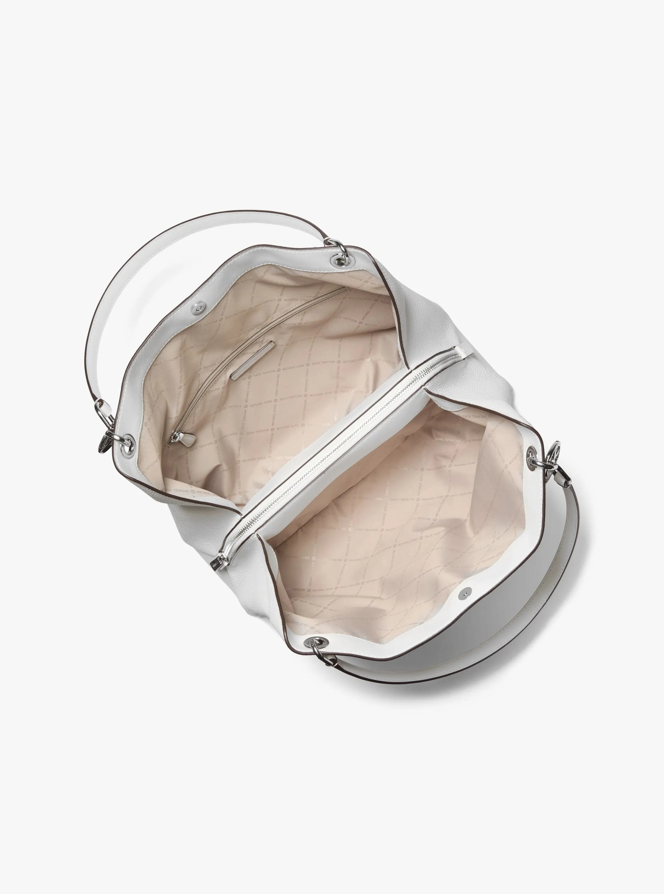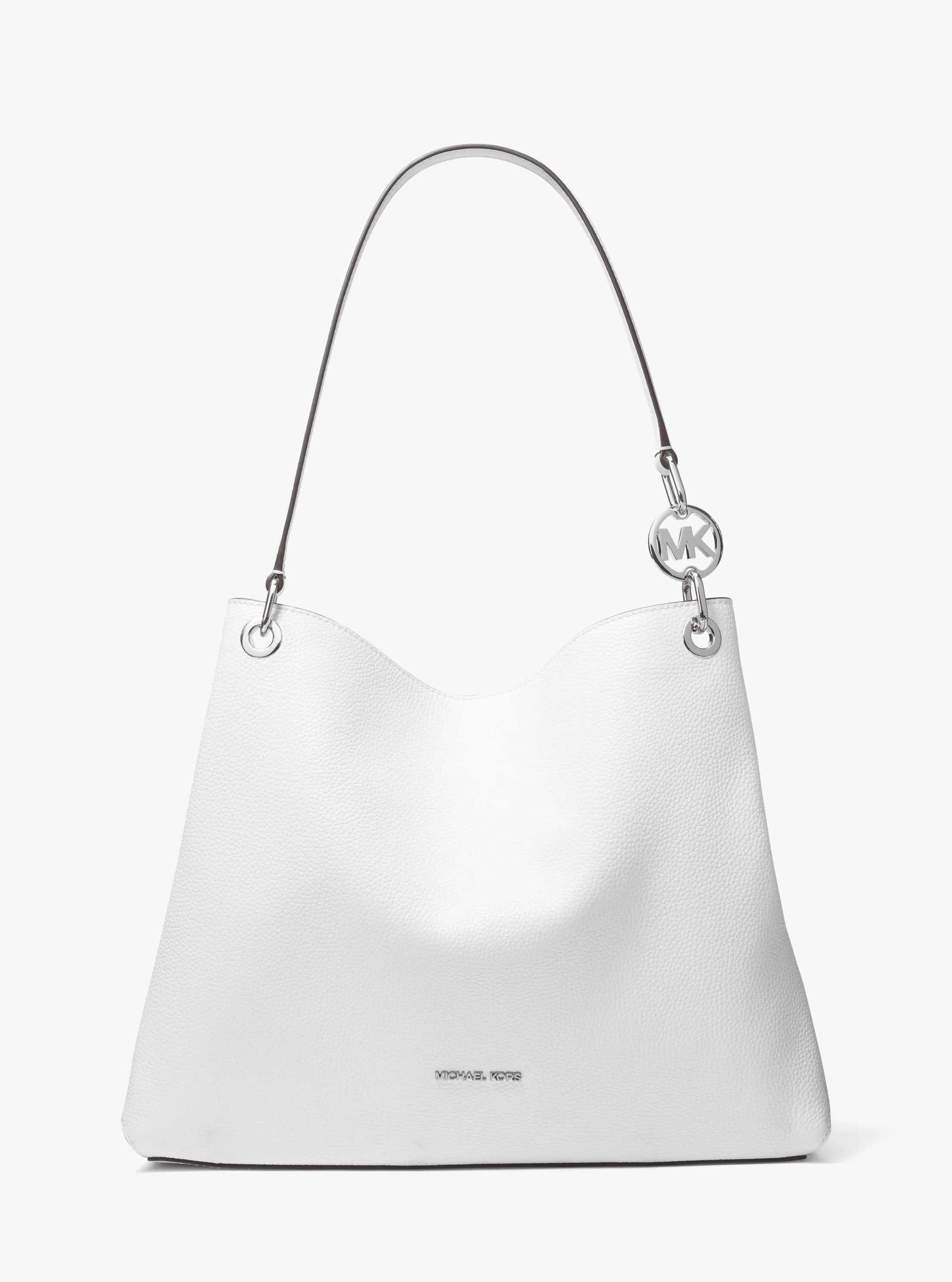 此款 Christina 大号单肩包,采用柔软白色材质打造时下流行的慵懒随性大包造型,复古而不失潮流感,内部空间充裕,集便利与实用为一体。包身上缀低调 MICHAEL KORS Logo 金属件装饰,手提柄拼接圆形 MK Logo 金属件,细节处彰显品牌质感。不妨搭配本季新款连衣裙,打造优雅通勤造型。