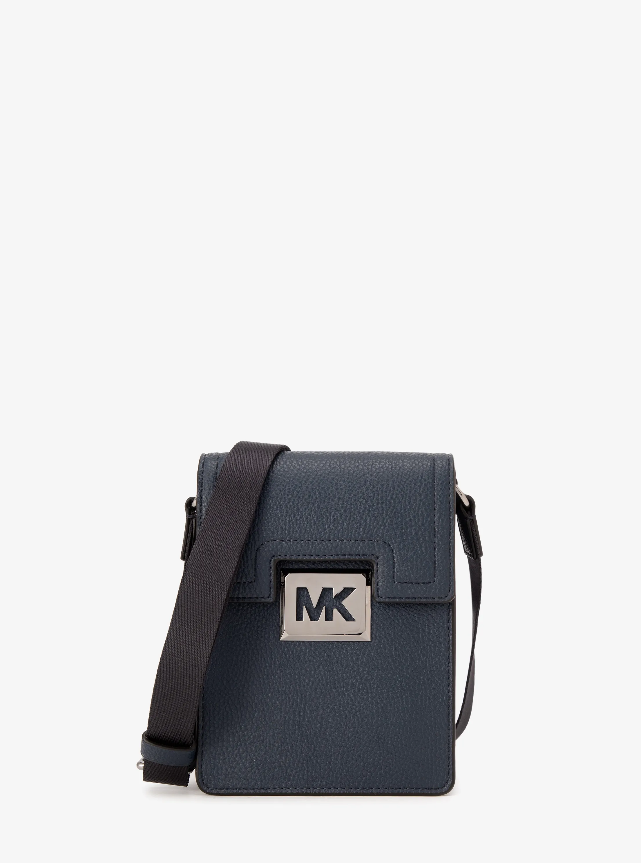 此款男士 Cooper 斜挎包,造型小巧,采用海军蓝色材质打造,迷你外观让你在人群中脱颖而出。翻盖开合,银色 MK 字母金属扣点缀包盖,彰显当下流行的时尚潮流态度,低调而不失格调。别具一格的包型可以放下一只手机或其他随身小物,配有可调节长肩带,是解放双手的实用单品,给您的整体造型点睛。