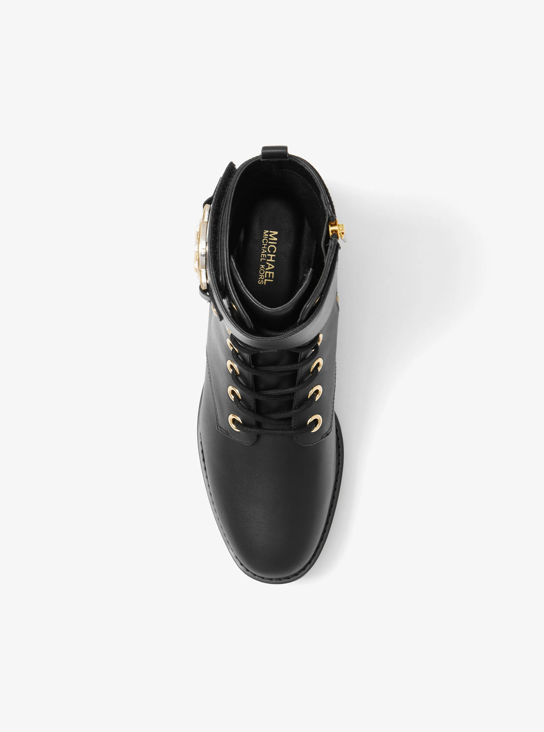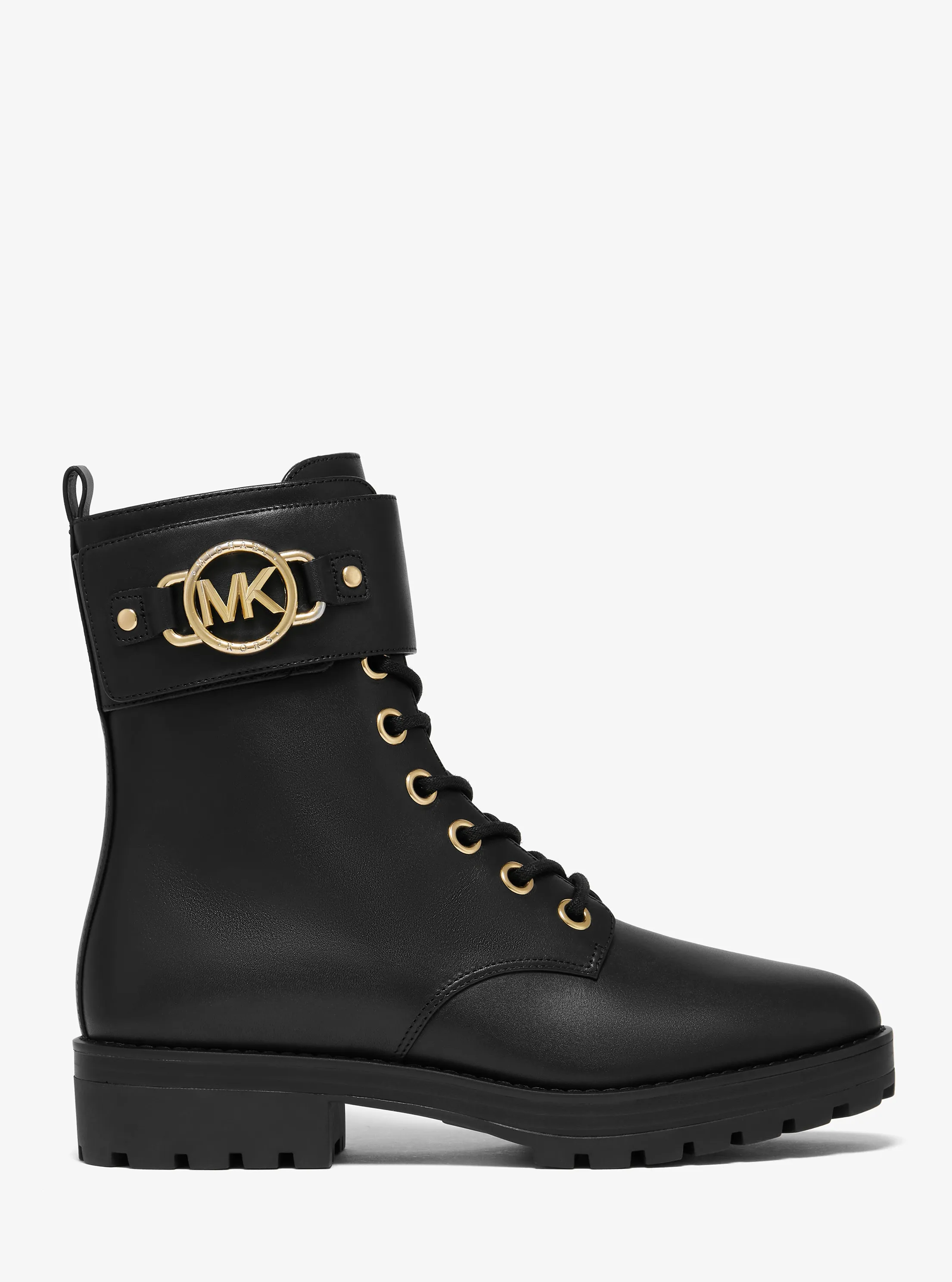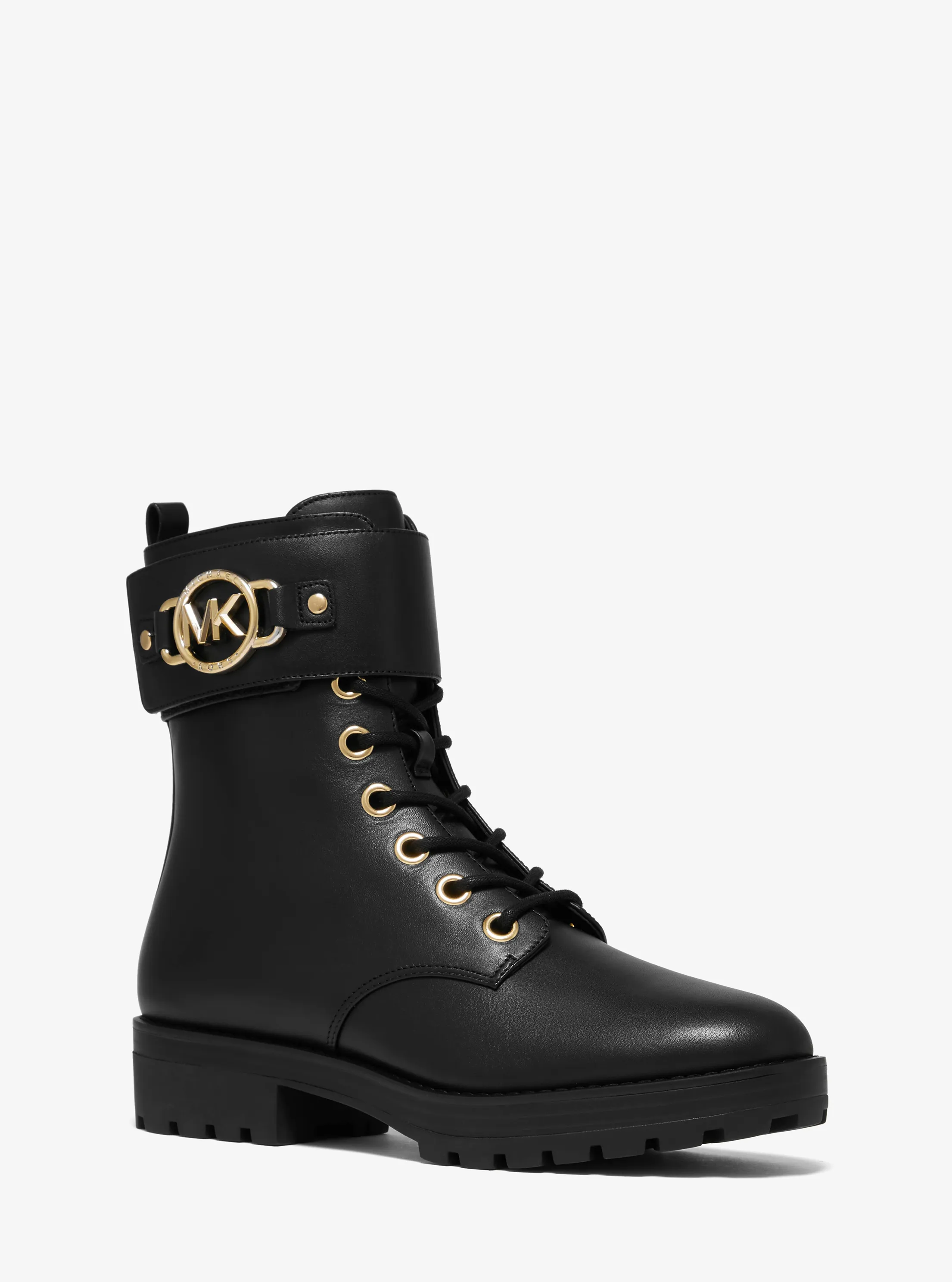此款 Rory 皮质系带靴,选用时下流行的经典马丁靴造型,鞋身采用经典黑色材质打造,圆形 MK Logo 金属件袢带点缀,增添单品潮流感。锯齿厚底设计,带来舒适的穿着体验,修饰腿部线条的同时彰显品牌质感。无论是搭配连衣裙或者是干练裤装,都相得益彰,是您造型的点睛之笔。