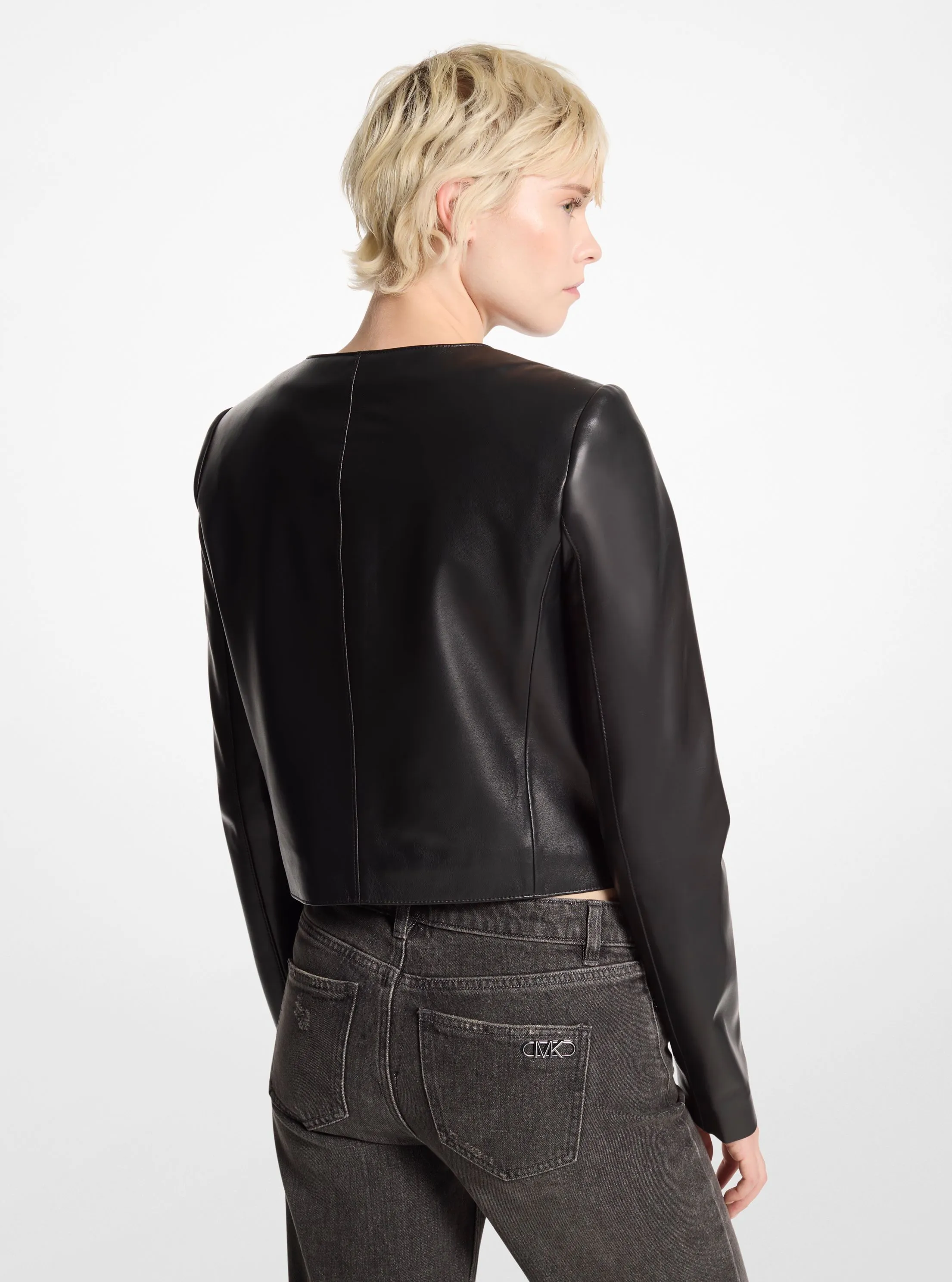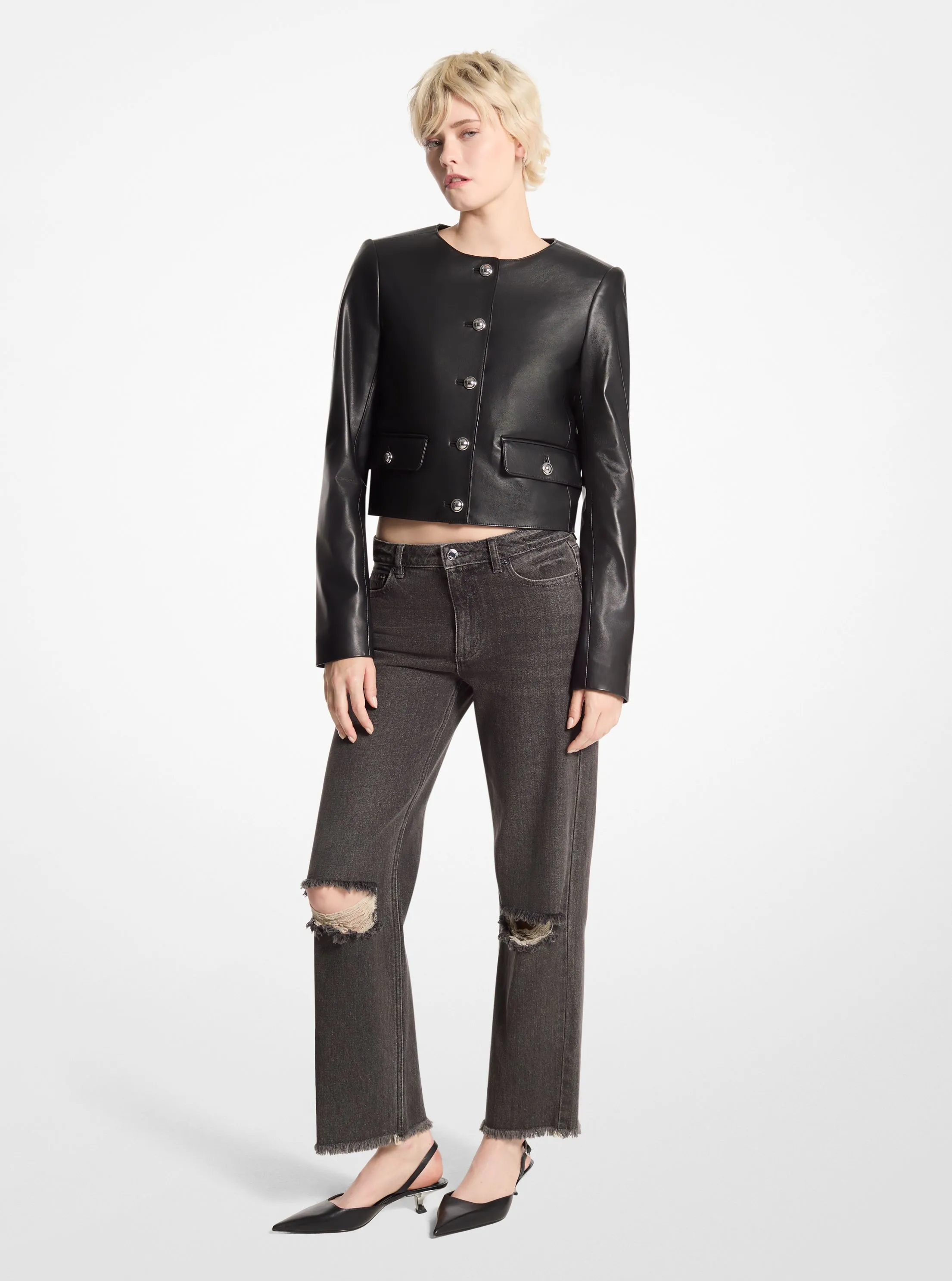 此款女士羊皮革外套夹克,采用经典黑色面料打造简约圆领廓形,精致剪裁,短款设计,衣身饰有翻盖贴袋,金属纽扣开合,彰显飒爽英姿。不妨搭配本季新款皮质长裤和手袋,打造街头动感造型,尽情展现自我。