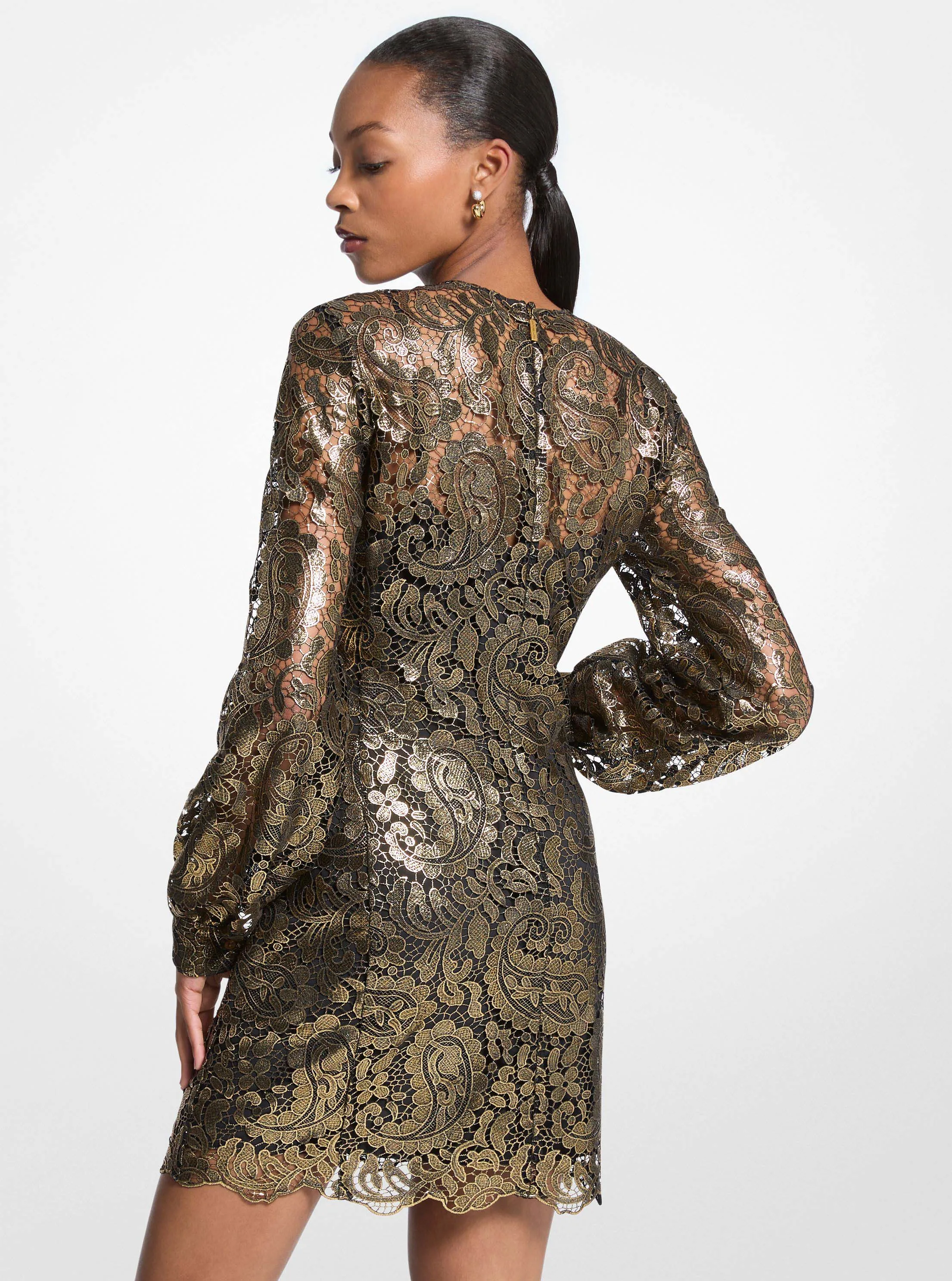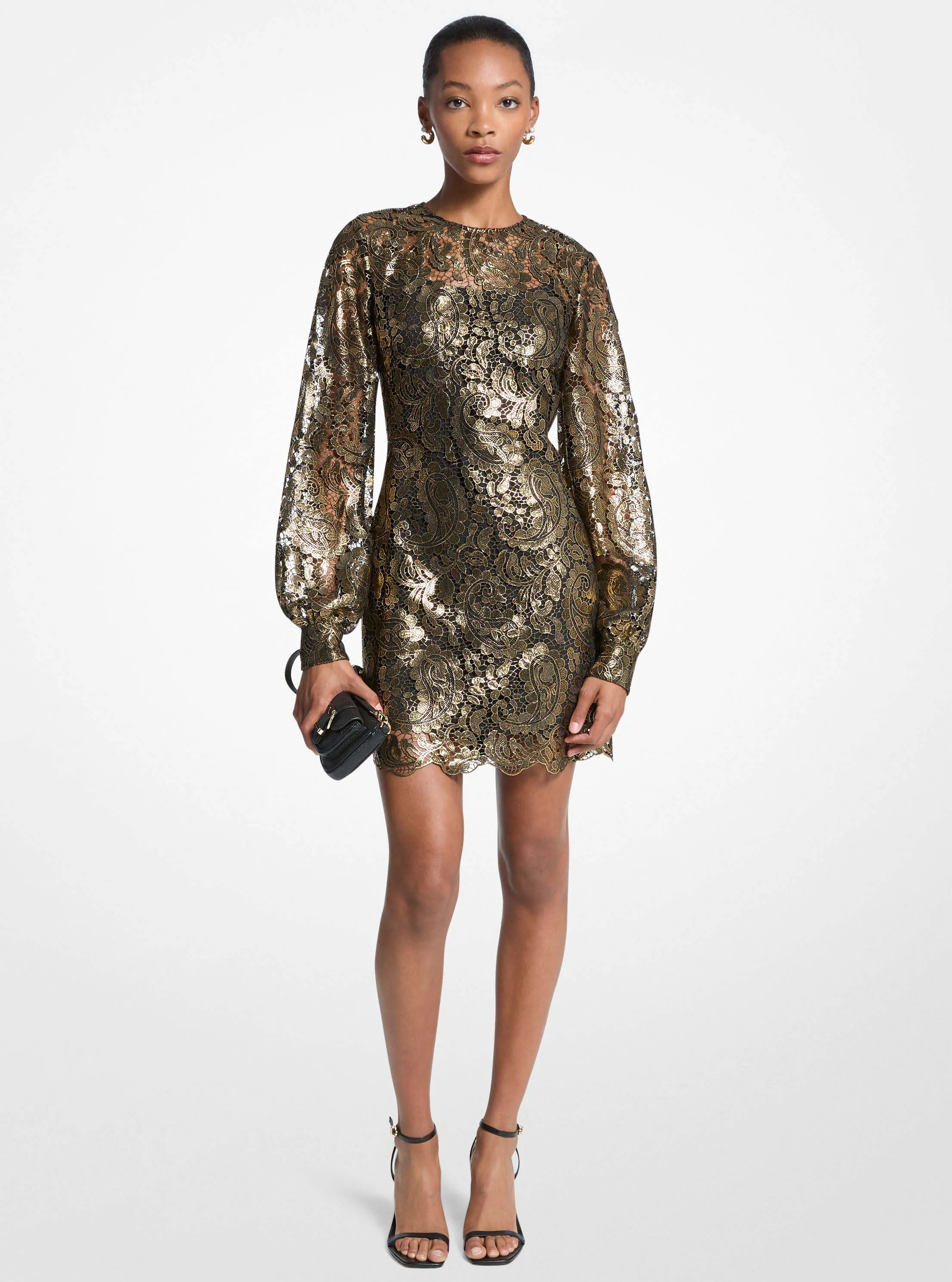 此款长袖金属蕾丝迷你裙,采用金色和黑色蕾丝面料,营造金属光泽,精致裁剪。收腰设计,打造修身廓形,展露您的曼妙身姿,是您春夏衣橱中打造时尚装束的基础单品。轻盈材质造就灵动波浪形下摆,为单品注入摩登魅力。不妨搭配本季新款靴履和手袋,打造优雅动人造型。