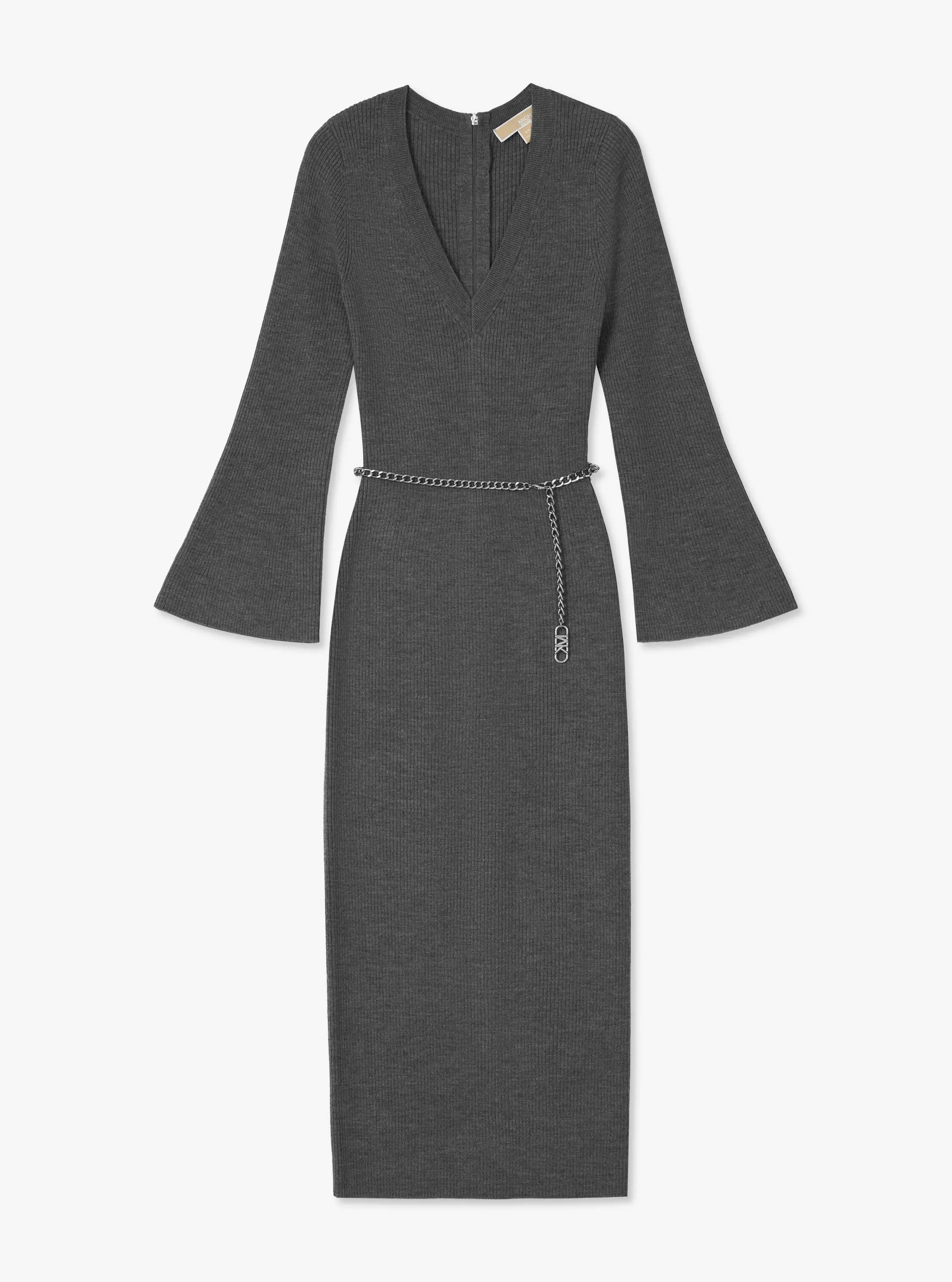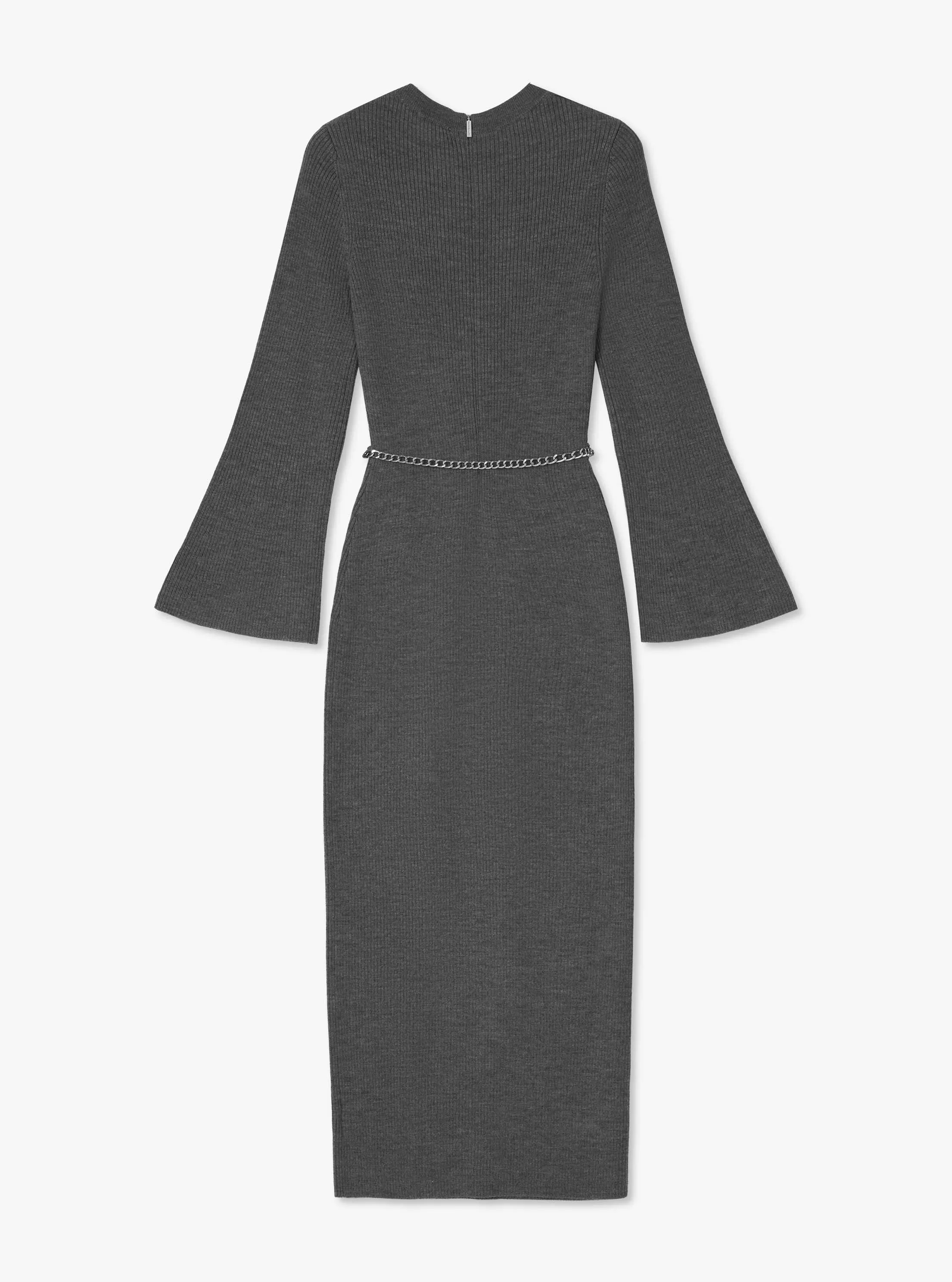 此款喇叭袖羊毛针织连衣裙,采用深灰色面料打造简约长袖连衣裙廓形,优雅大气。搭配银色金属链条腰带,勾勒您的曼妙身姿。V 领设计突出优美颈部线条,搭配微喇叭袖口,为单品注入亮眼细节。不妨搭配本季新款手袋和高跟鞋,打造魅力通勤造型。