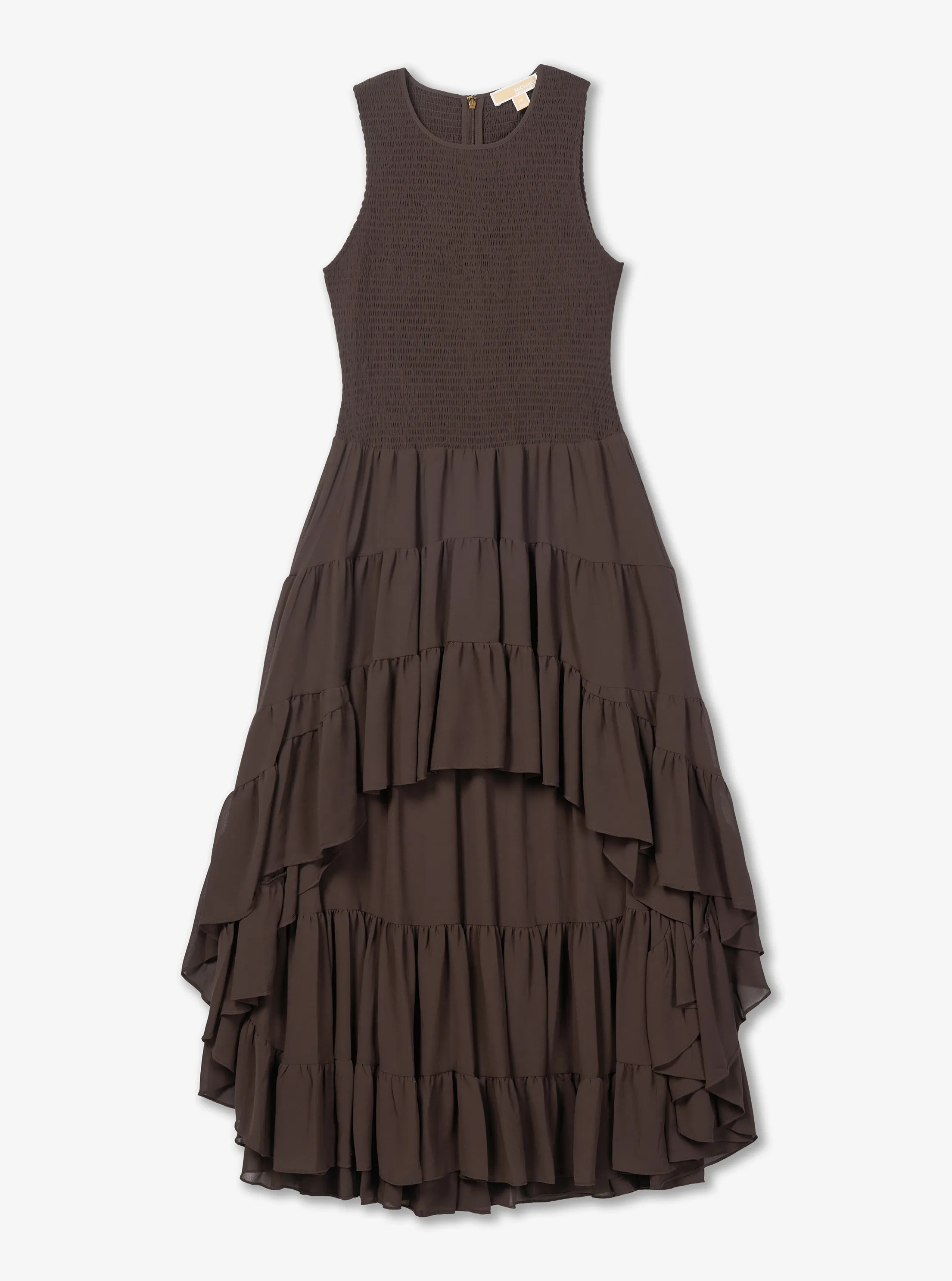 此款乔其纱不规则下摆无袖连衣裙,精选巧克力色材质打造无袖上衣及前短后长的不规则蛋糕裙型,个性十足。裙子部分采用褶皱设计,为单品注入柔美气息。轻盈面料,行走间灵动飘逸。不妨搭配本季新款上衣,打造优雅派对造型,彰显摩登魅力。