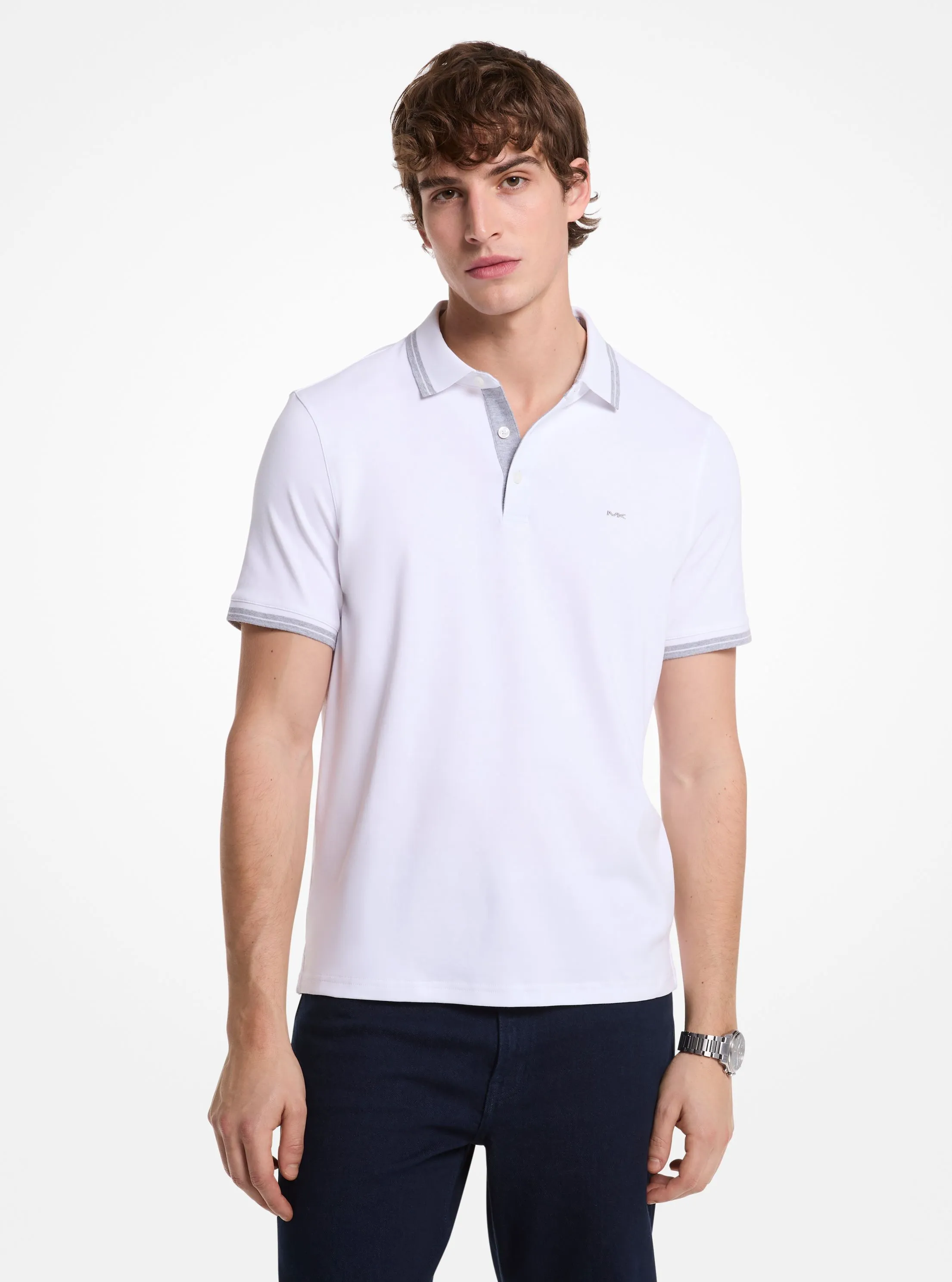 此款男士休闲翻领 Polo 衫,选用白色面料打造经典 Polo 衫造型,领口、袖口采用灰色饰边,穿着舒适而不失休闲感,无一丝多余缀饰,精致裁剪,细节处彰显品牌质感。不妨搭配本季休闲长裤和公文包,打造夏季质感通勤造型。